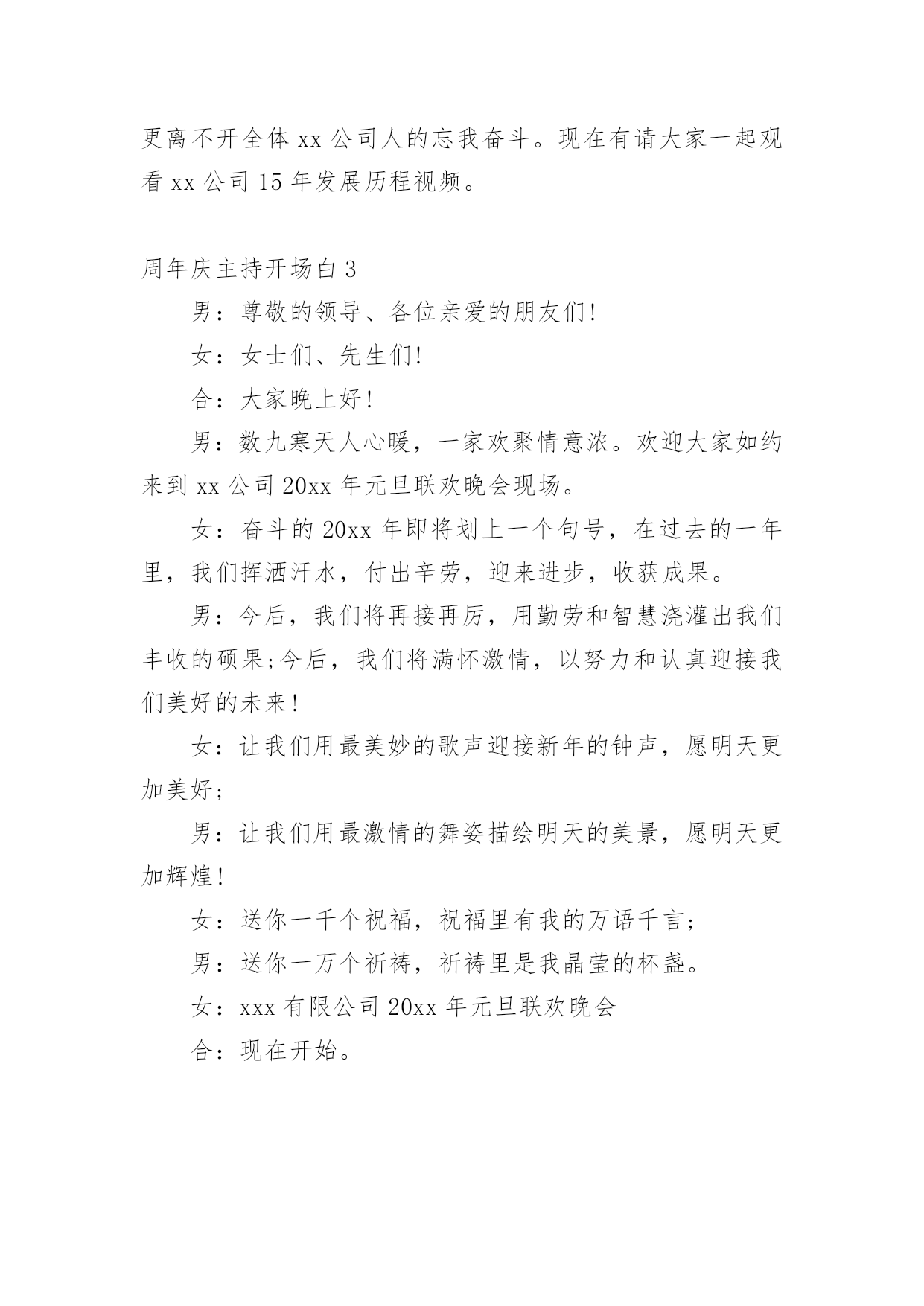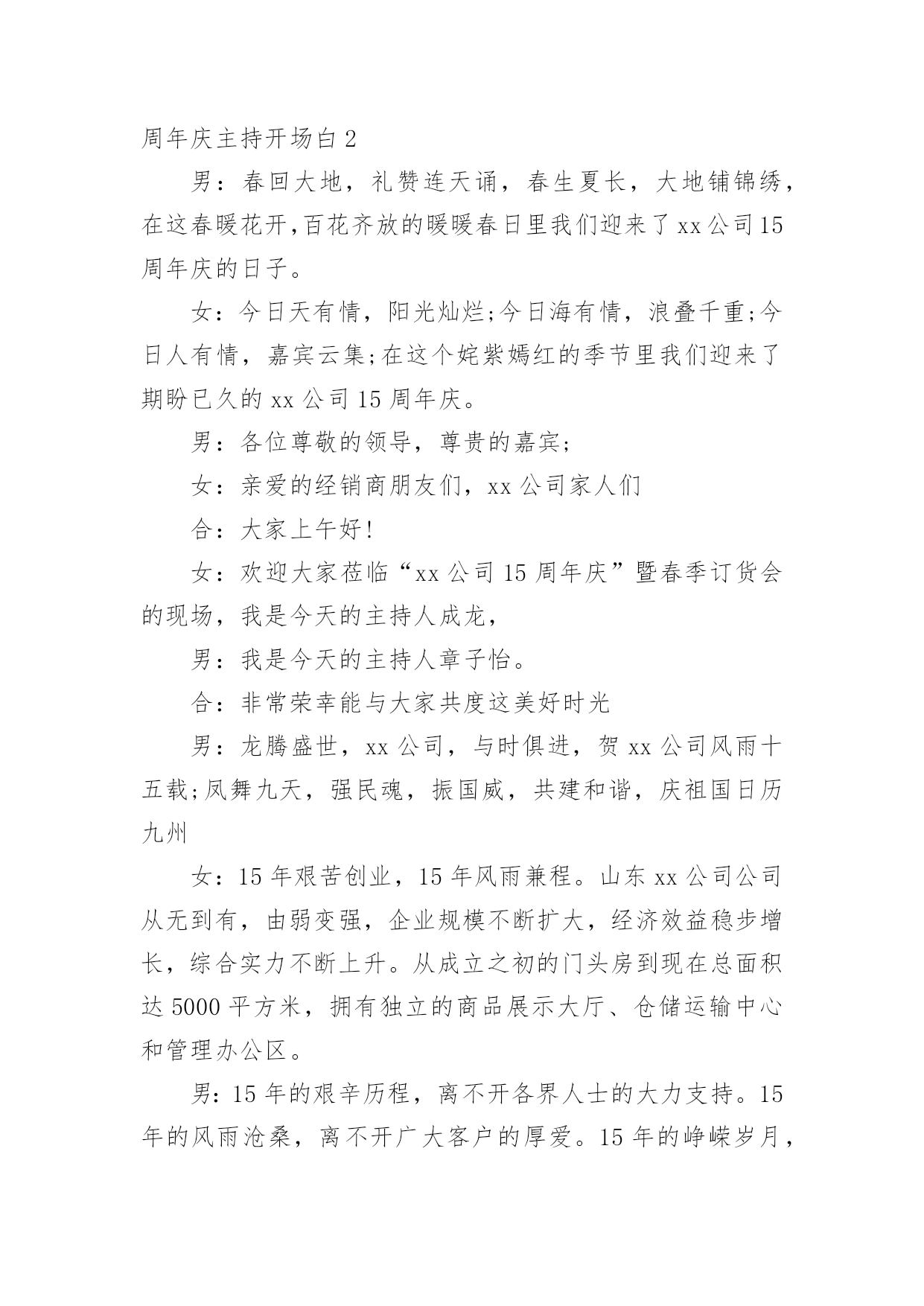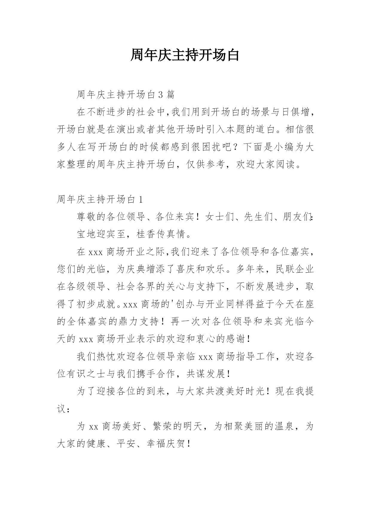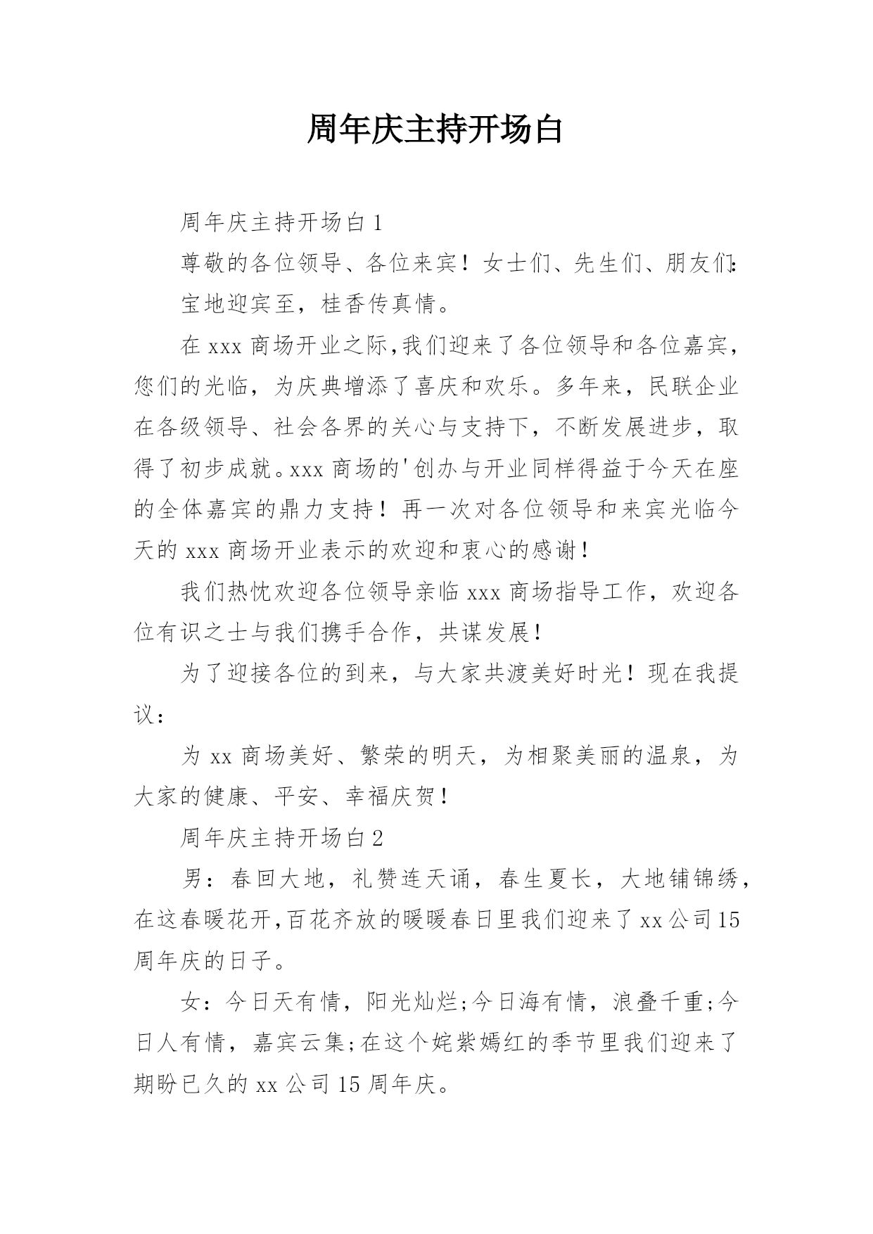 周年庆主持开场白周年庆主持开场白1尊敬的各位领导、各位来宾!女士们、先生们、朋友们:宝地迎宾至,桂香传真情。在xxx商场开业之际,我们迎来了各位领导和各位嘉宾,您们的光临,为庆典增添了喜庆和欢乐。多年来,民联企业在各级领导、社会各界的关心与支持下,不断发展进步,取得了初步成就。xxx商场的'创办与开业同样得益于今天在座的全体嘉宾的鼎力支持!再一次对各位领导和来宾光临今天的xxx商场开业表示的欢迎和衷心的感谢!我们热忱欢迎各位领导亲临xxx商场指导工作,欢迎各位有识之士与我们携手合作,共谋发展!为了迎接各位
