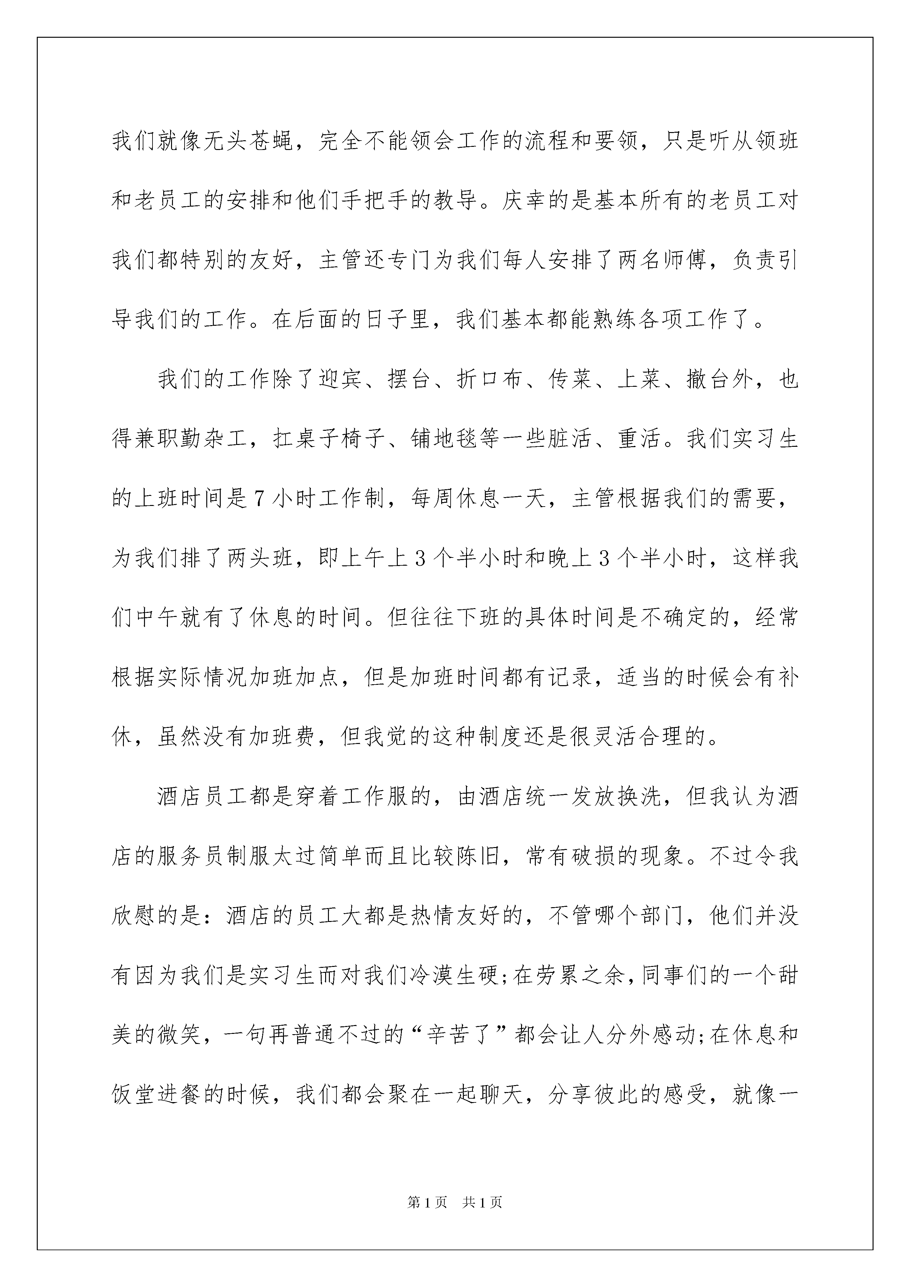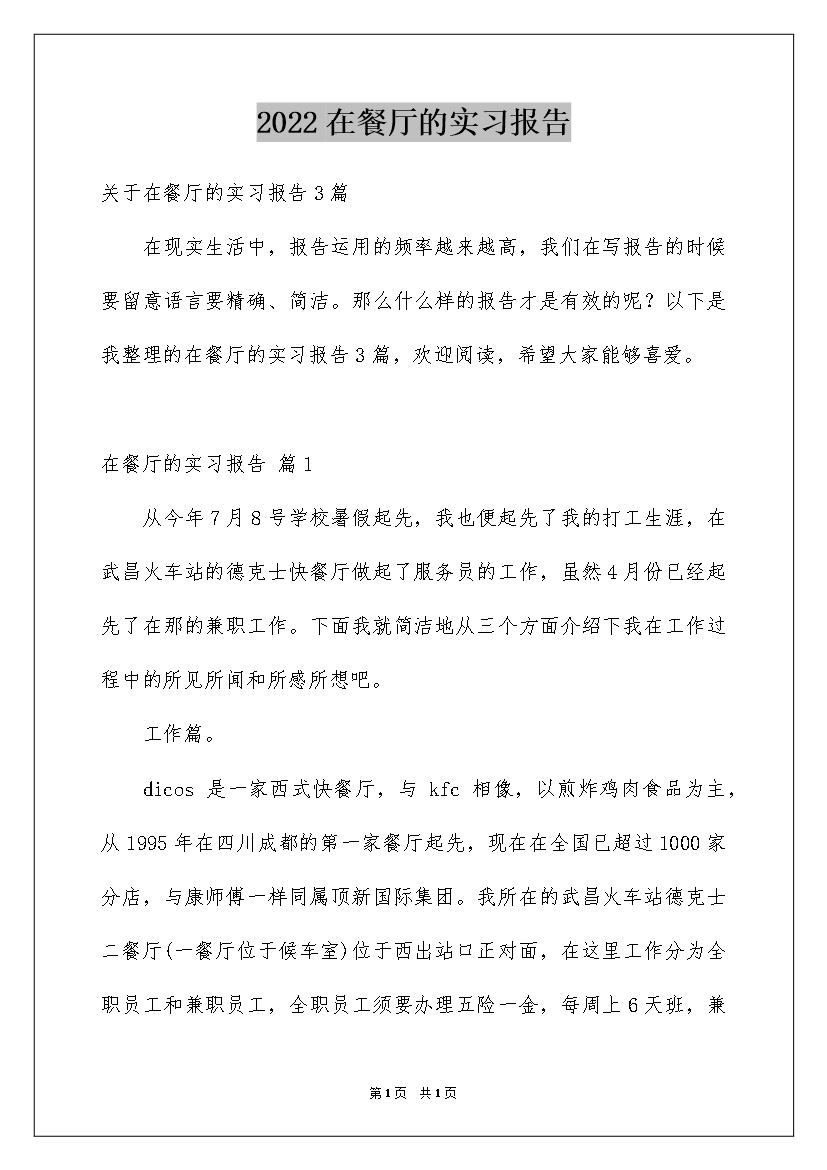 2022在餐厅的实习报告关于在餐厅的实习报告3篇在现实生活中,报告运用的频率越来越高,我们在写报告的时候要留意语言要精确、简洁。那么什么样的报告才是有效的呢?以下是我整理的在餐厅的实习报告3篇,欢迎阅读,希望大家能够喜爱。在餐厅的实习报告篇1从今年7月8号学校暑假起先,我也便起先了我的打工生涯,在武昌火车站的德克士快餐厅做起了服务员的工作,虽然4月份已经起先了在那的兼职工作。