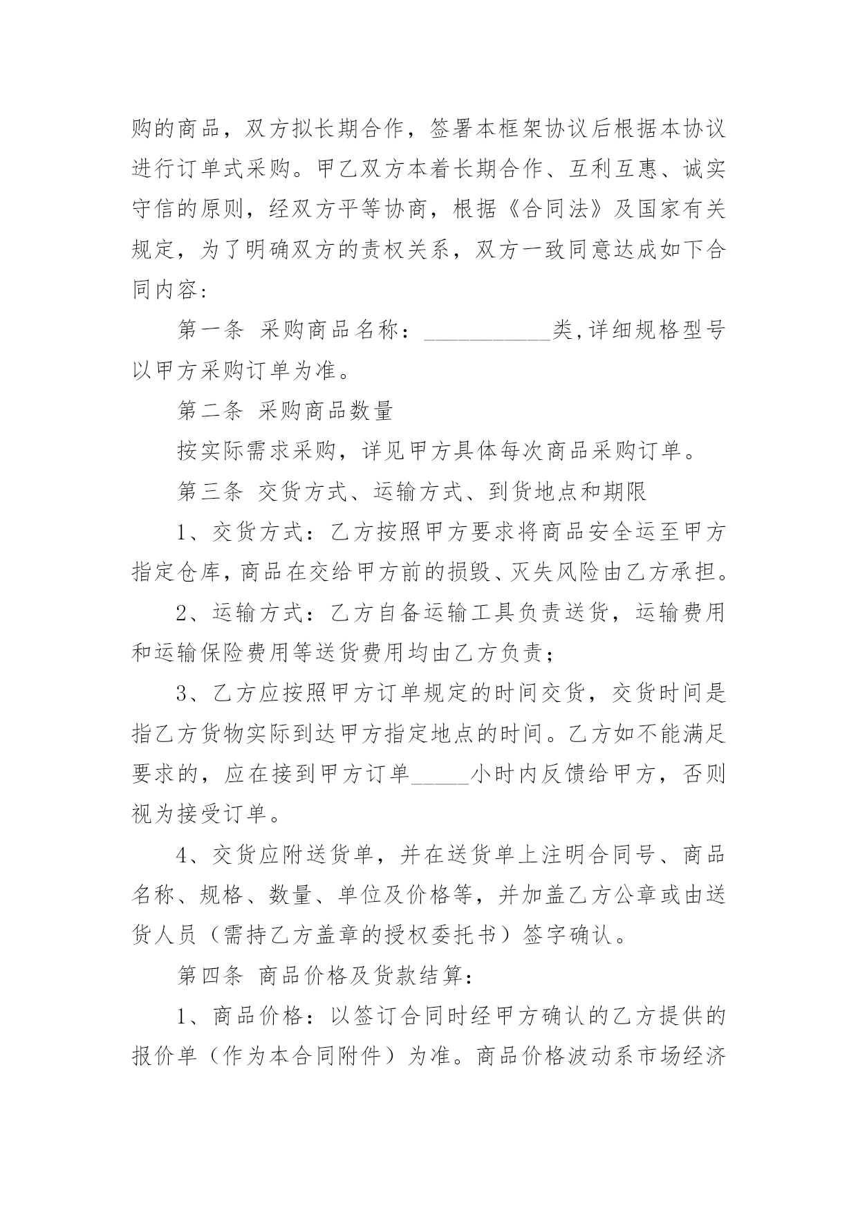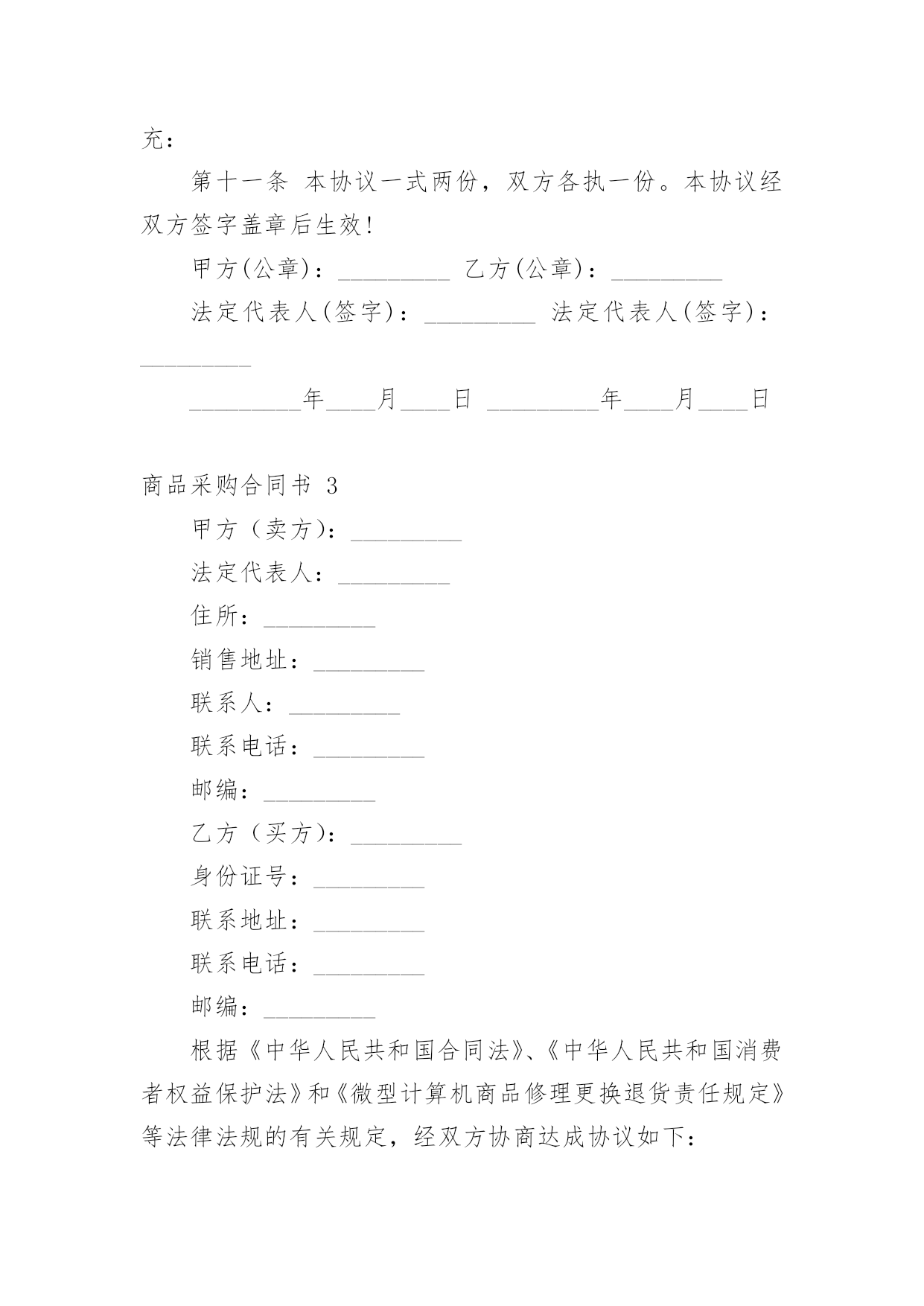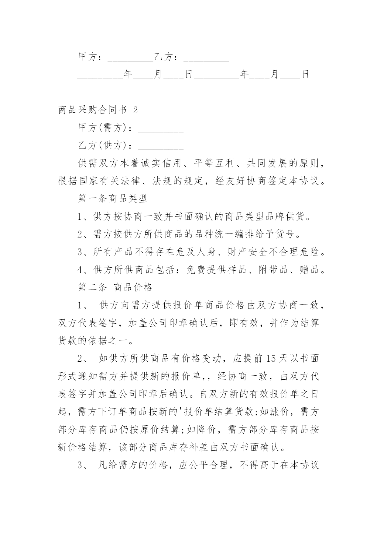 商品采购合同书甲方(需方):乙方(供方):供需双方本着诚实信用、平等互利、共同发展的'原则,根据国家有关法律、法规的规定,经友好协商签定本协议。第一条商品类型;品牌或商标;附报价单明细。特别约定:1、供方按协商一致并书面确认的商品类型品牌供货。2、需方按供方所供商品的品种统一编排给予货号。3、所有产品不得存在危及人身、财产安全不合理危险。4、供方所供商品包括:免费提供样品、附带品、赠品。第二条商品价格1、供方向需方提供报价单商品价格由双方协商一致,双方代表签字,加盖公司印章确认后,即有效,并作为结算货款的
