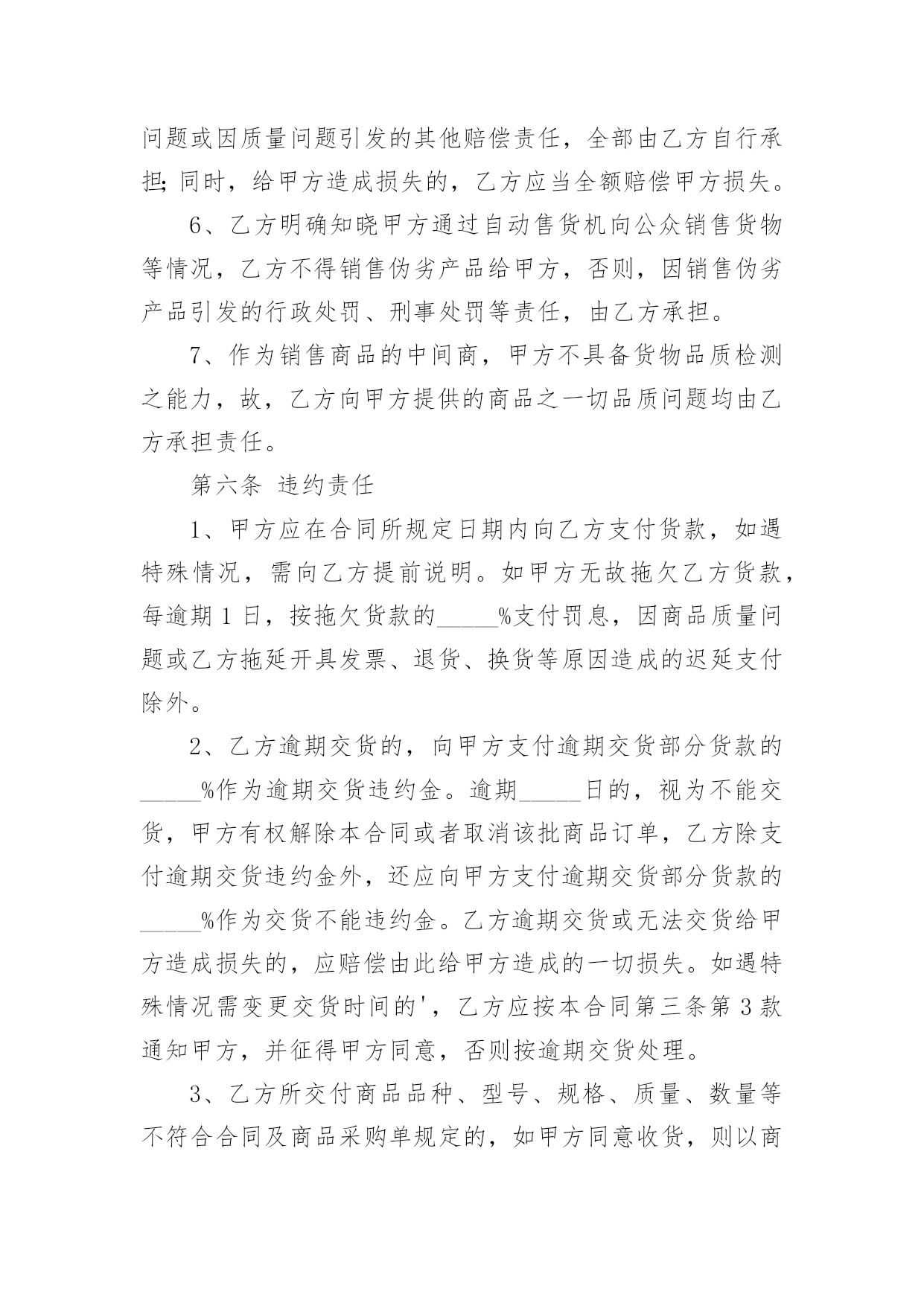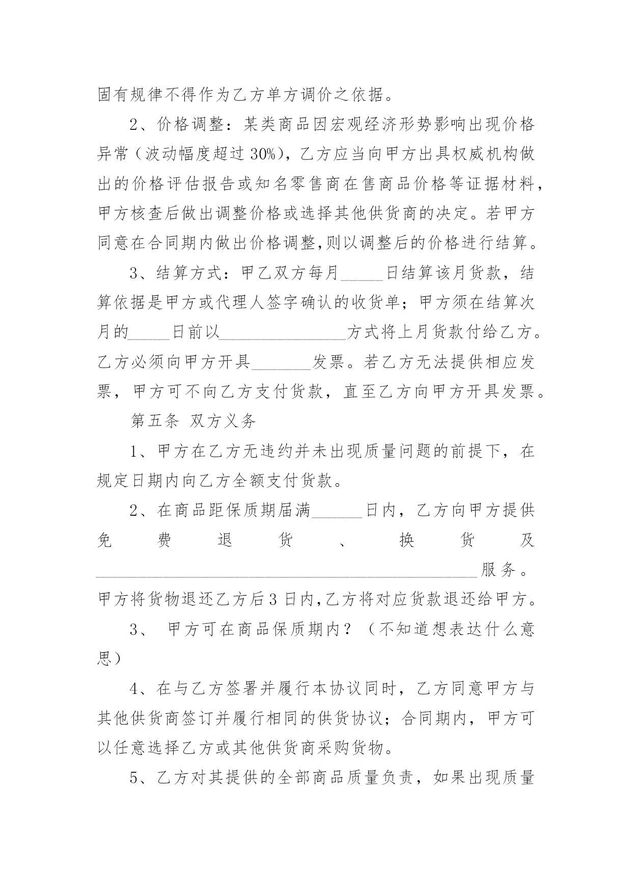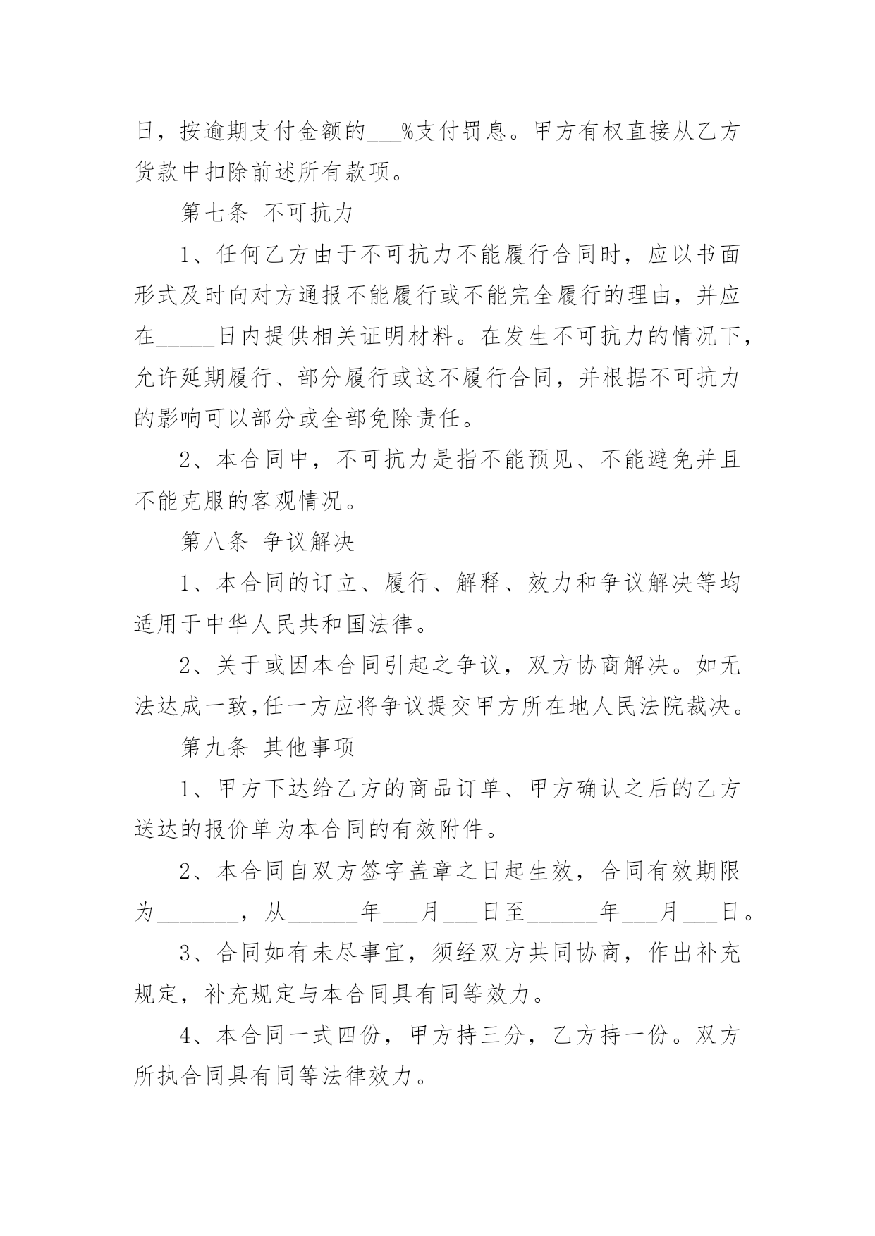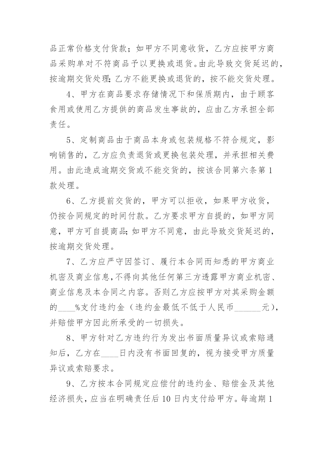 此资料由网络收集而来如有侵权请告知上传者立即删除。资料共分享我们负责传递知识。商品采购合同书商品采购工作既要高效有序还要防止腐败。制度建设是规范采购工作的重要基础是防腐反腐的重要保证。商品采购合同书怎么写呢?以下是小编为大家整理的商品采购合同书范文欢迎参考阅读。商品采购合同书范文1甲方(需方):乙方(供方):供需双方本着诚实信用、平等互利、共同发展的原则根据国家有关法律、法规的规定经友好协商签定本协议。第一条商品类型;品牌或商标;附报价单明细。特别约定:1、供方按协商一致并书面