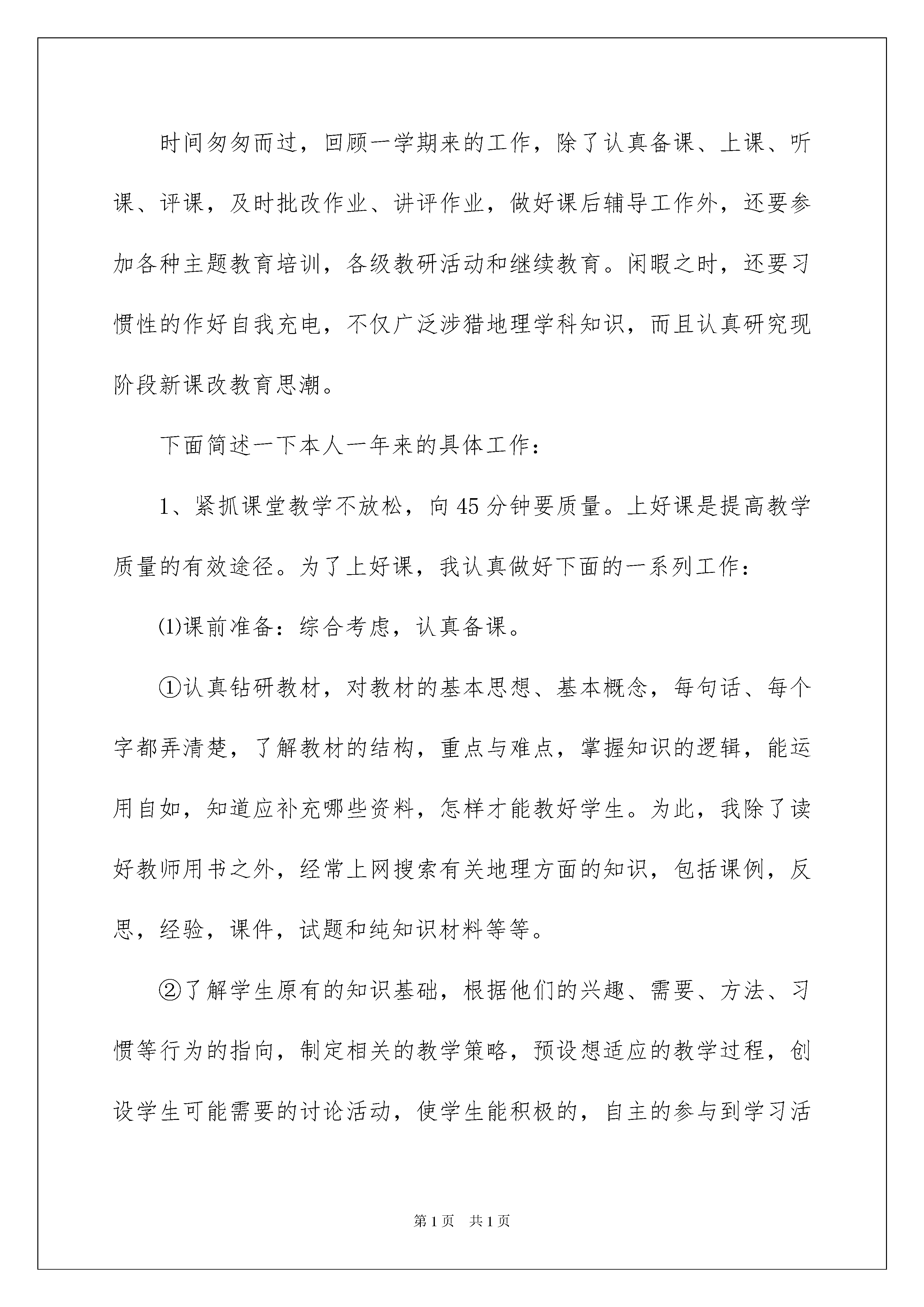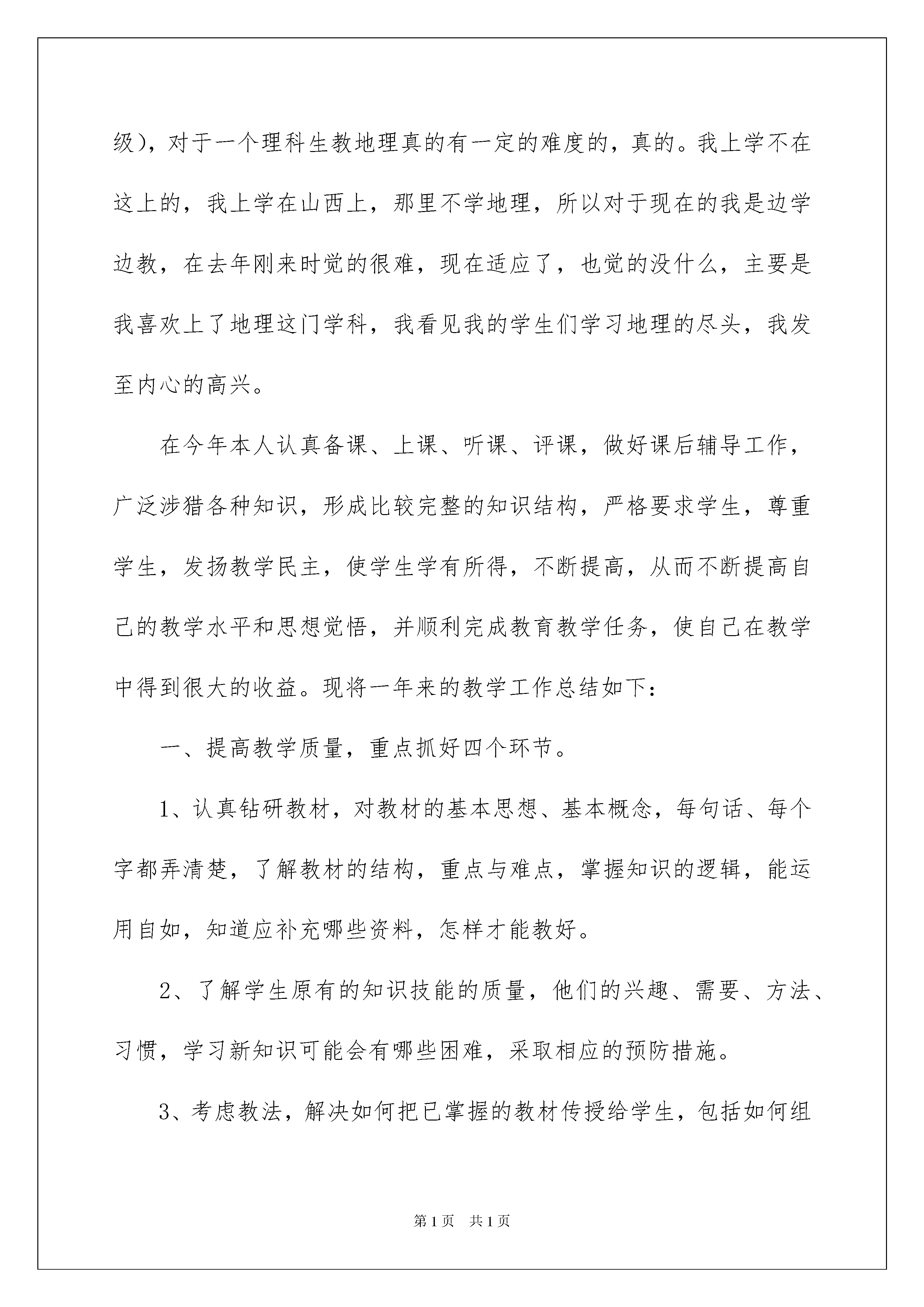 2022地理教师教学个人工作总结地理教师教学个人工作总结总结是把一定阶段内的有关情况分析研究,做出有指导性结论的书面材料,通过它可以全面地、系统地了解以往的学习和工作情况,快快来写一份总结吧。我们该怎么写总结呢?下面是我整理的地理教师教学个人工作总结,欢迎阅读与收藏。地理教师教学个人工作总结1“人地关系”是学习地理知识的主要线索,因此列举的问题和地理