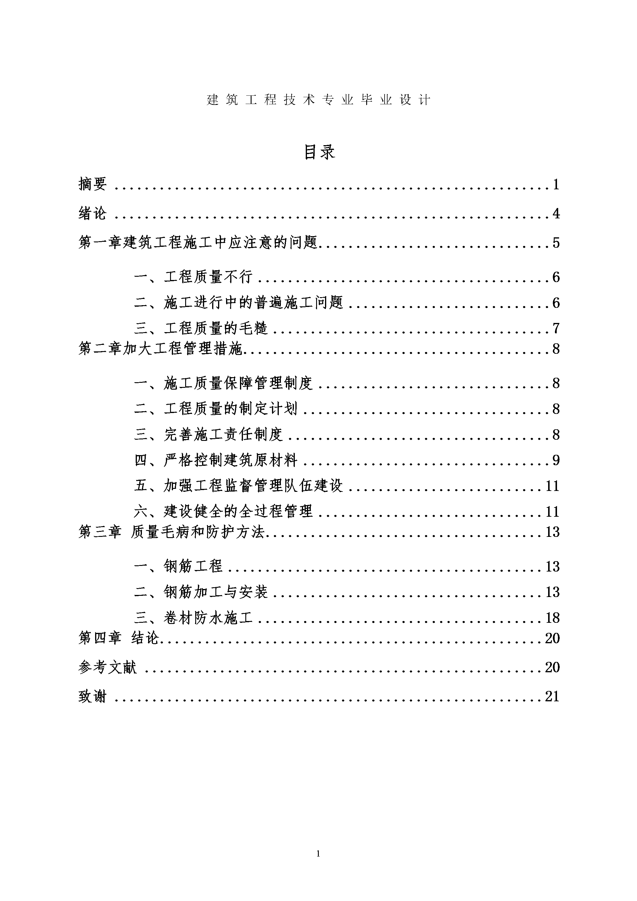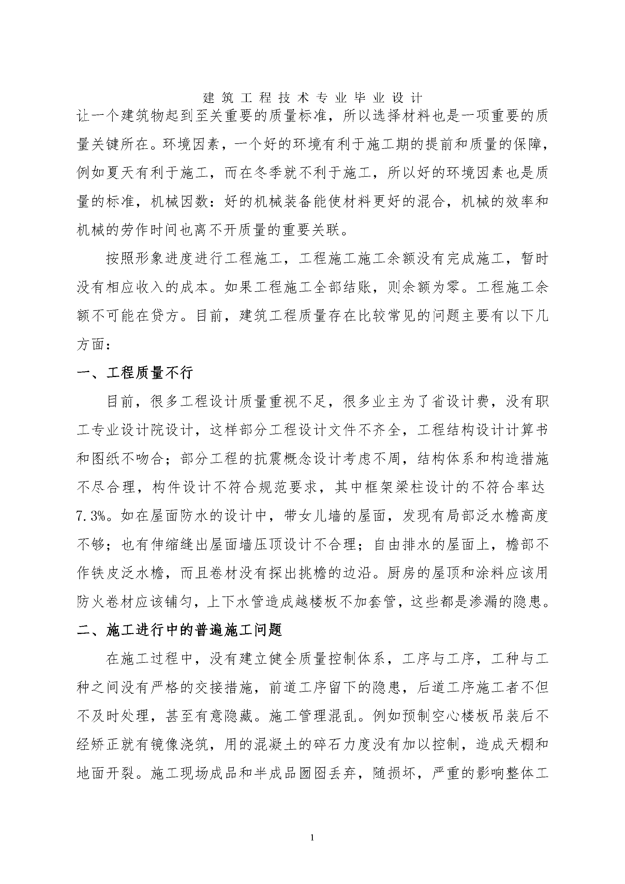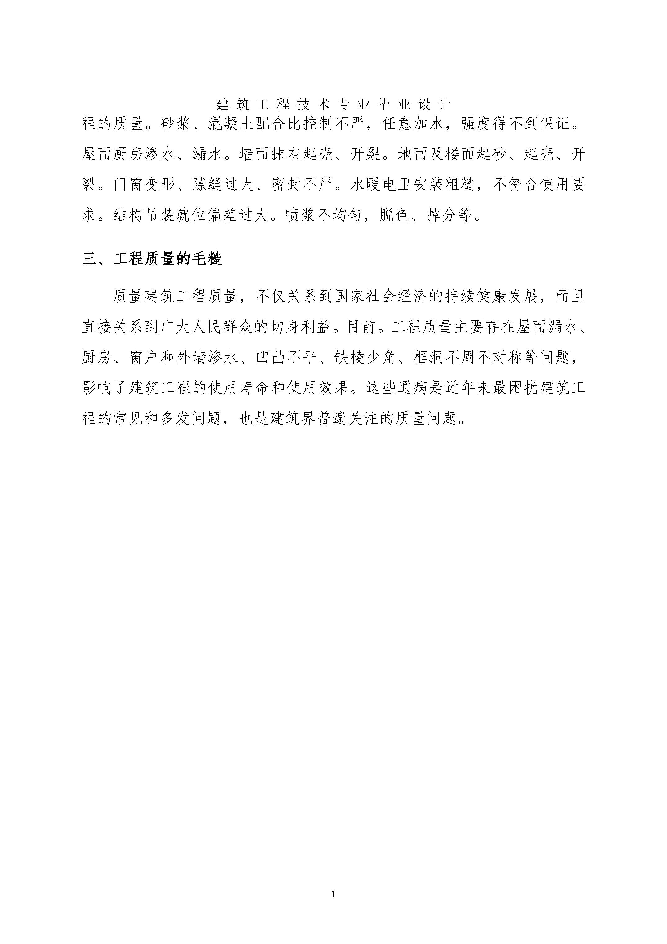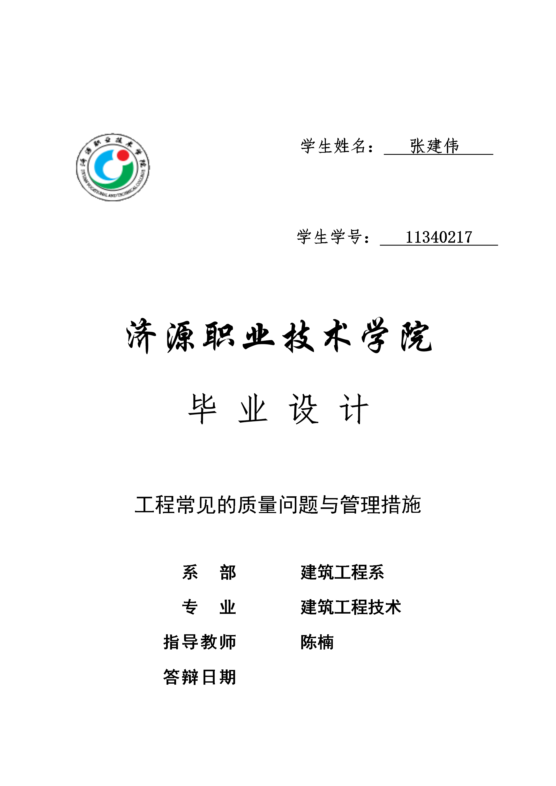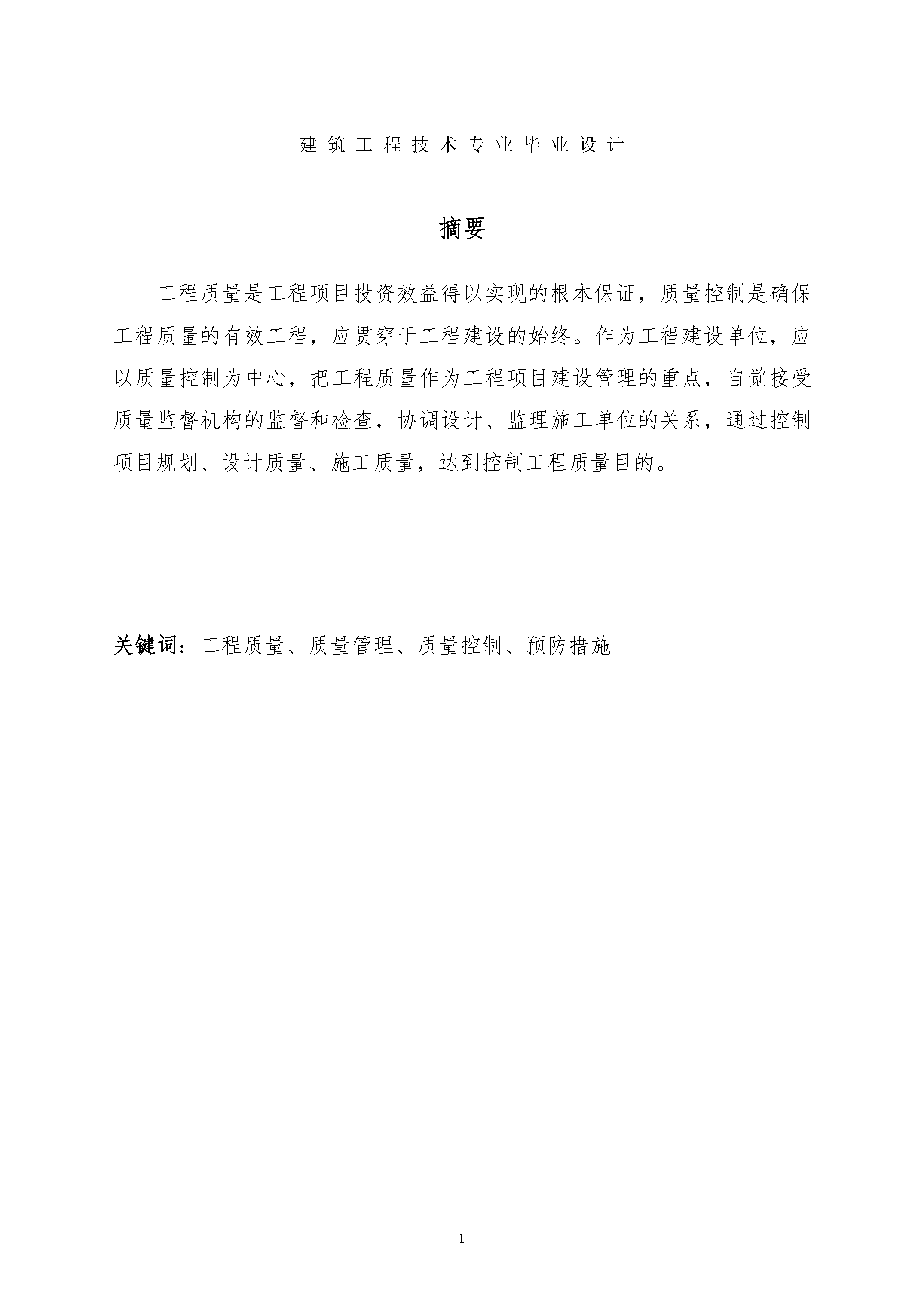 建筑工程技术专业毕业设计表格SEQ表格\*ARABIC1先生姓名:张建伟先生学号:11340217济源职业技术学院毕业设计工程常见的质量问题与管理措施系部:建筑工程系专业:建筑工程技术指点教师:陈楠答辩日期:摘要工程质量是工程项目投资效益得以实现的根本保证,质量控制是确保工程质量的有效工程,应贯穿于工程建设的始终。作为工程建设单位,应以质量控制为中心,把工程质量作为工程项目建设管理的重点,盲目接受质量监督机构的监督和检查,调和设计、监理施工单位的关系,通过控制项目规划、设计质量、施工质量,达到控制工