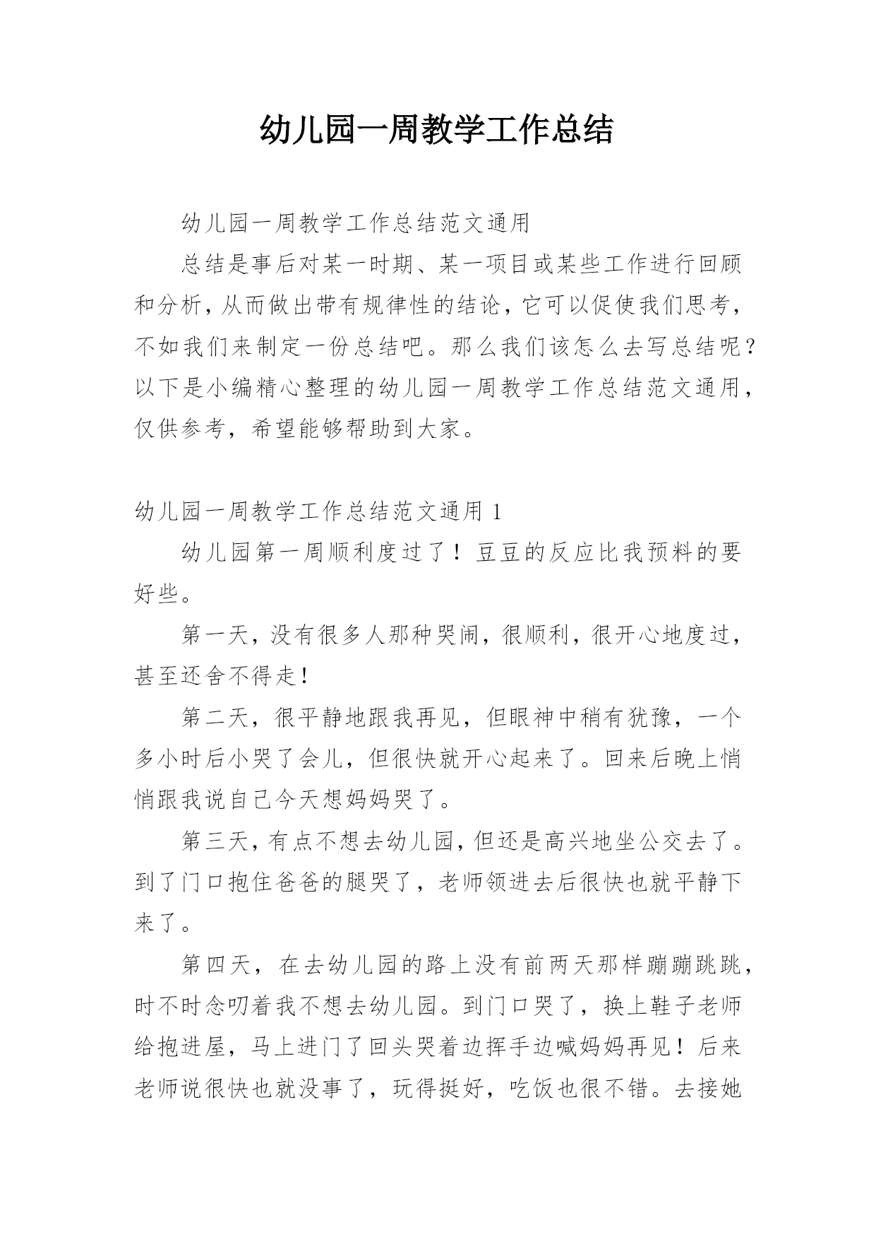 幼儿园一周教学工作总结幼儿园一周教学工作总结范文通用总结是事后对某一时期、某一项目或某些工作进行回顾和分析,从而做出带有规律性的结论,它可以促使我们思考,不如我们来制定一份总结吧。那么我们该怎么去写总结呢?以下是小编精心整理的幼儿园一周教学工作总结范文通用,仅供参考,希望能够帮助到大家。幼儿园一周教学工作总结范文通用1幼儿园第一周顺利度过了!豆豆的反应比我预料的要好些。第一天,没有很多人那种哭闹,很顺利,很开心地度过,甚至还舍不得走!第二天,很平静地跟我再见,但眼神中稍有犹豫,一个多小时后小哭了会儿,但很