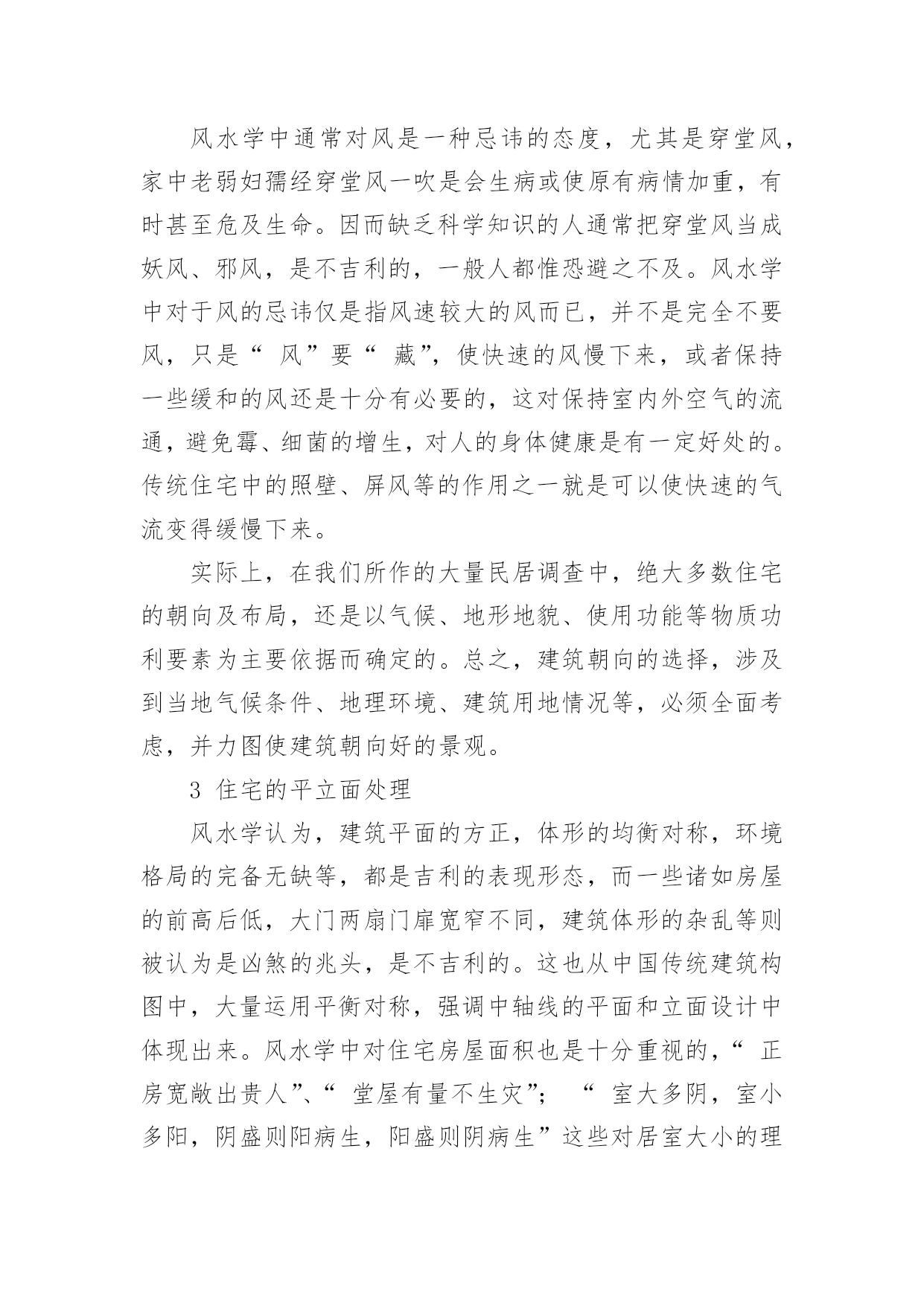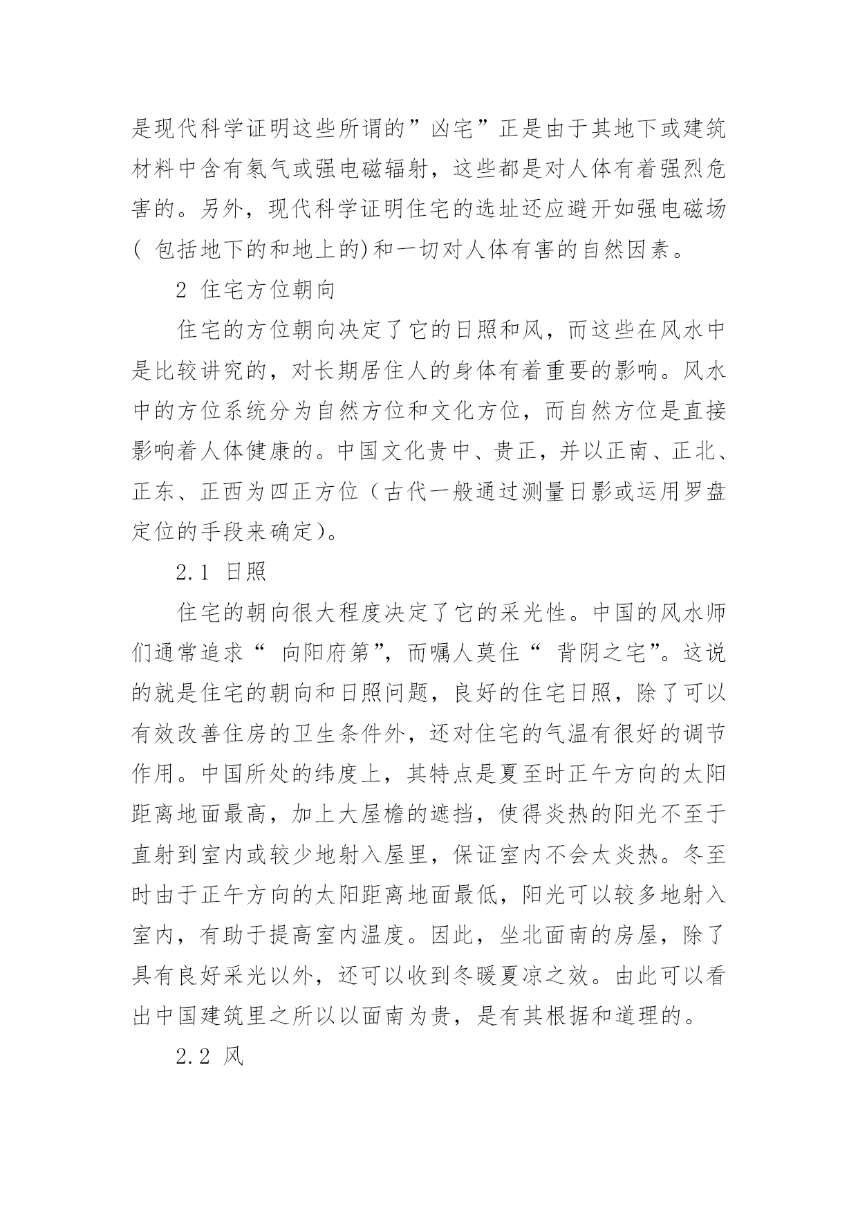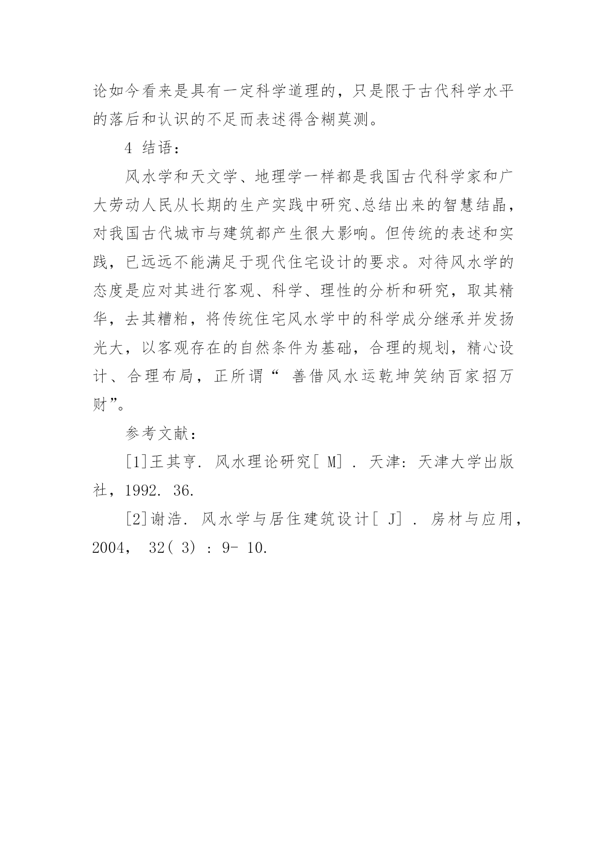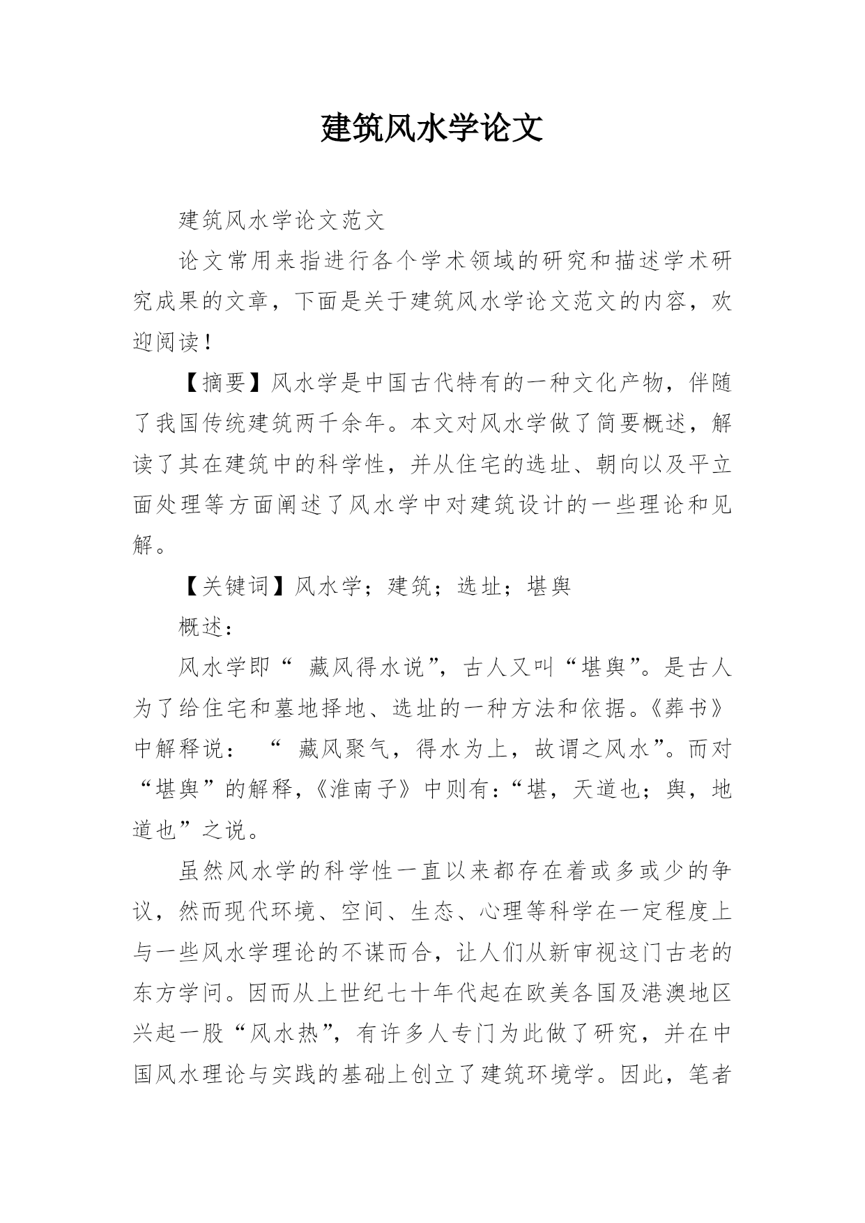 建筑风水学论文建筑风水学论文范文论文常用来指进行各个学术领域的研究和描述学术研究成果的文章,下面是关于建筑风水学论文范文的内容,欢迎阅读!【摘要】风水学是中国古代特有的一种文化产物,伴随了我国传统建筑两千余年。本文对风水学做了简要概述,解读了其在建筑中的科学性,并从住宅的选址、朝向以及平立面处理等方面阐述了风水学中对建筑设计的一些理论和见解。【关键词】风水学;建筑;选址;堪舆概述:风水学即“藏风得水说”,古人又叫“堪舆”。是古人为了给住宅和墓地择地、选址的一种方法和依据。《葬书》中解释说:“藏风聚气,得水