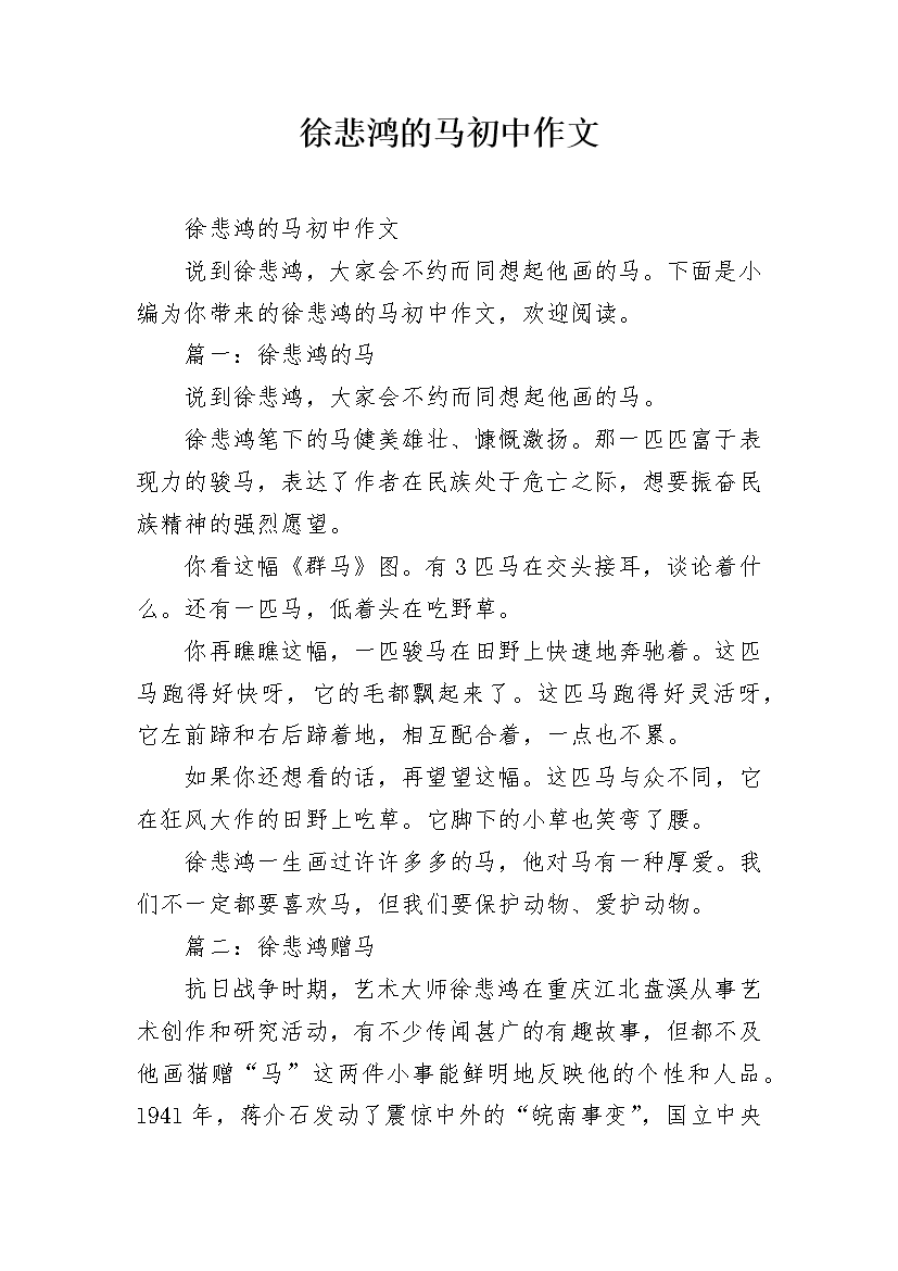 徐悲鸿的马初中作文徐悲鸿的马初中作文说到徐悲鸿,大家会不约而同想起他画的马。下面是小编为你带来的徐悲鸿的马初中作文,欢迎阅读。篇一:徐悲鸿的马说到徐悲鸿,大家会不约而同想起他画的马。徐悲鸿笔下的马健美雄壮、慷慨激扬。那一匹匹富于表现力的骏马,表达了作者在民族处于危亡之际,想要振奋民族精神的强烈愿望。你看这幅《群马》图。有3匹马在交头接耳,谈论着什么。还有一匹马,低着头在吃野草。你再瞧瞧这幅,一匹骏马在田野上快速地奔驰着。这匹马跑得好快呀,它的毛都飘起来了。这匹马跑得好灵活呀,它左前蹄和右后蹄着地,相互配合