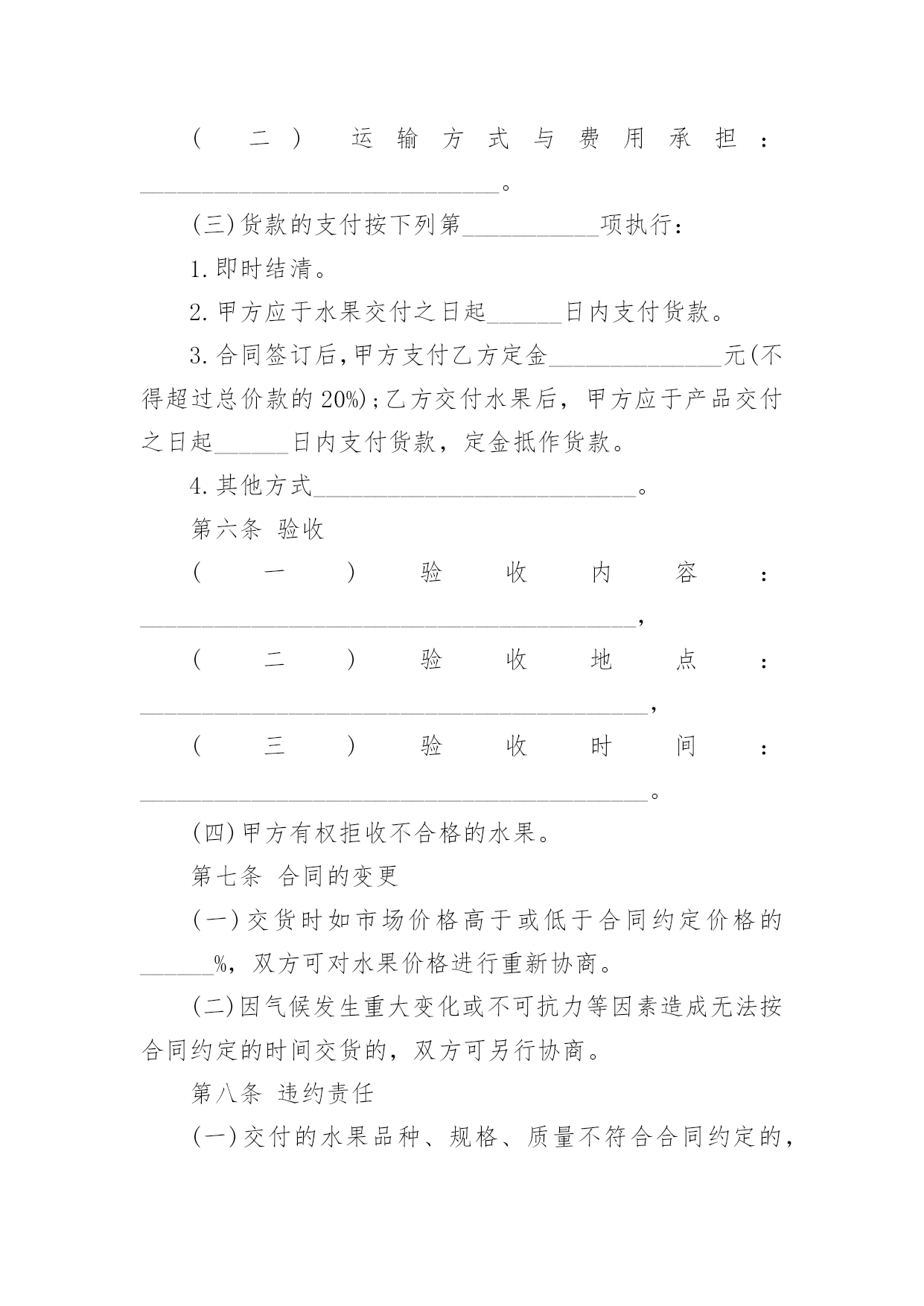 买卖水果合同买卖水果合同在人们愈发重视契约的社会中,能够利用到合同的场合越来越多,合同是对双方的保障又是一种约束。那么正式、规范的合同是什么样的呢?下面是小编精心整理的买卖水果合同,欢迎阅读,希望大家能够喜欢。买卖水果合同1订立合同双方:_______(以下简称甲方)_______(以下简称乙方)甲、乙双方代表经过平等协商订立如下合同,以资共同遵守。一、乙方向甲方提供红糯米样荔枝20000公斤,其中一级、二级各半,每种各10000公斤。一级的每公斤10元,二级的每公斤8元,总货款为18万元人民币。二、乙方