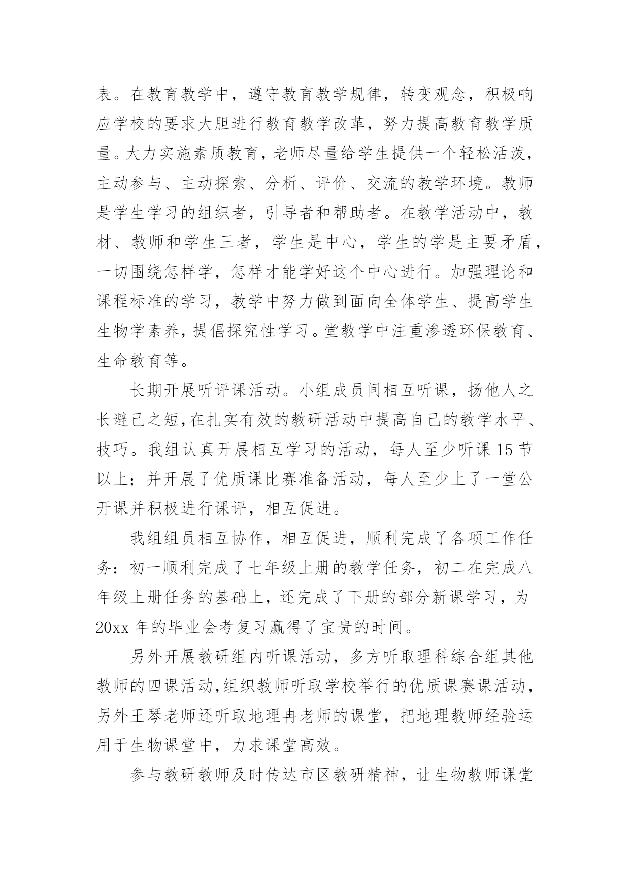生物备课组总结关于生物备课组总结(通用6篇)总结是在一段时间内对学习和工作生活等表现加以总结和概括的一种书面材料,通过它可以正确认识以往学习和工作中的优缺点,让我们好好写一份总结吧。总结怎么写才不会流于形式呢?以下是小编精心整理的关于生物备课组总结(通用6篇),仅供参考,欢迎大家阅读。生物备课组总结120XX-20XX学年第一学期已经过去,为了更好的提高课堂教学效益,增强集体备课的实效,反思与总结过去一学期的教育教学行为,现将本学期初一、初二生物备课组教育、教学情况作一总结。一、坚持新课程理念,精心设计教