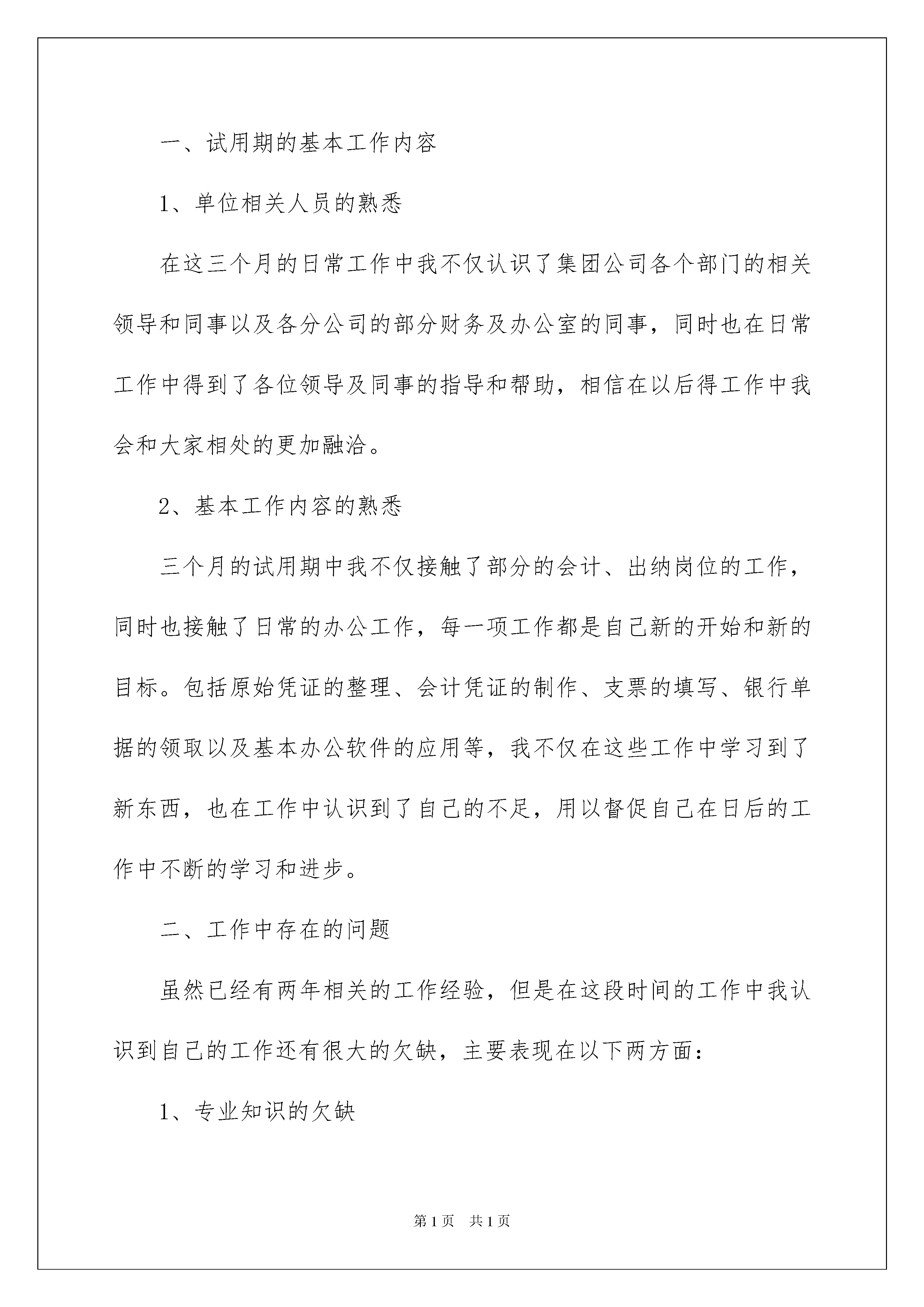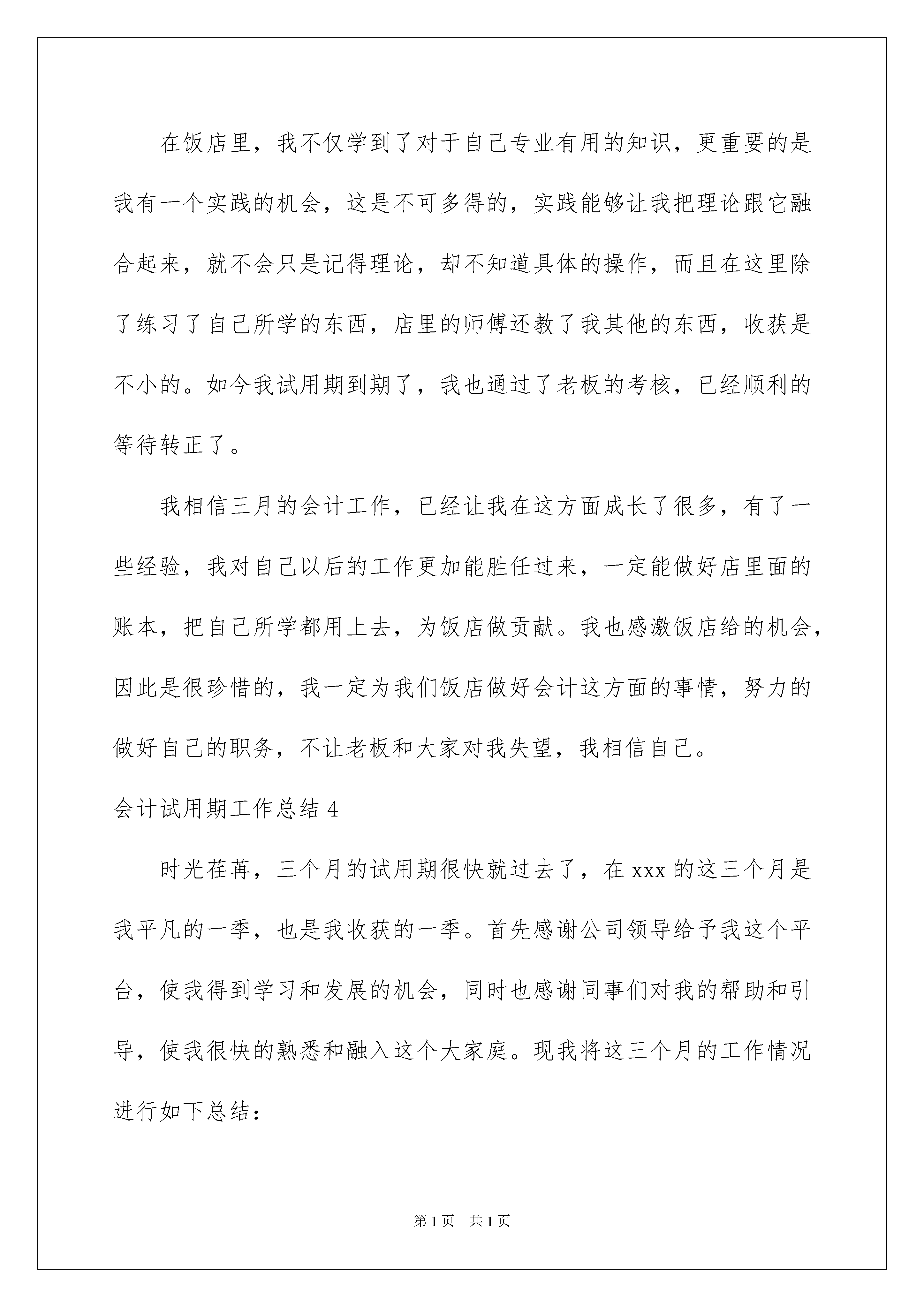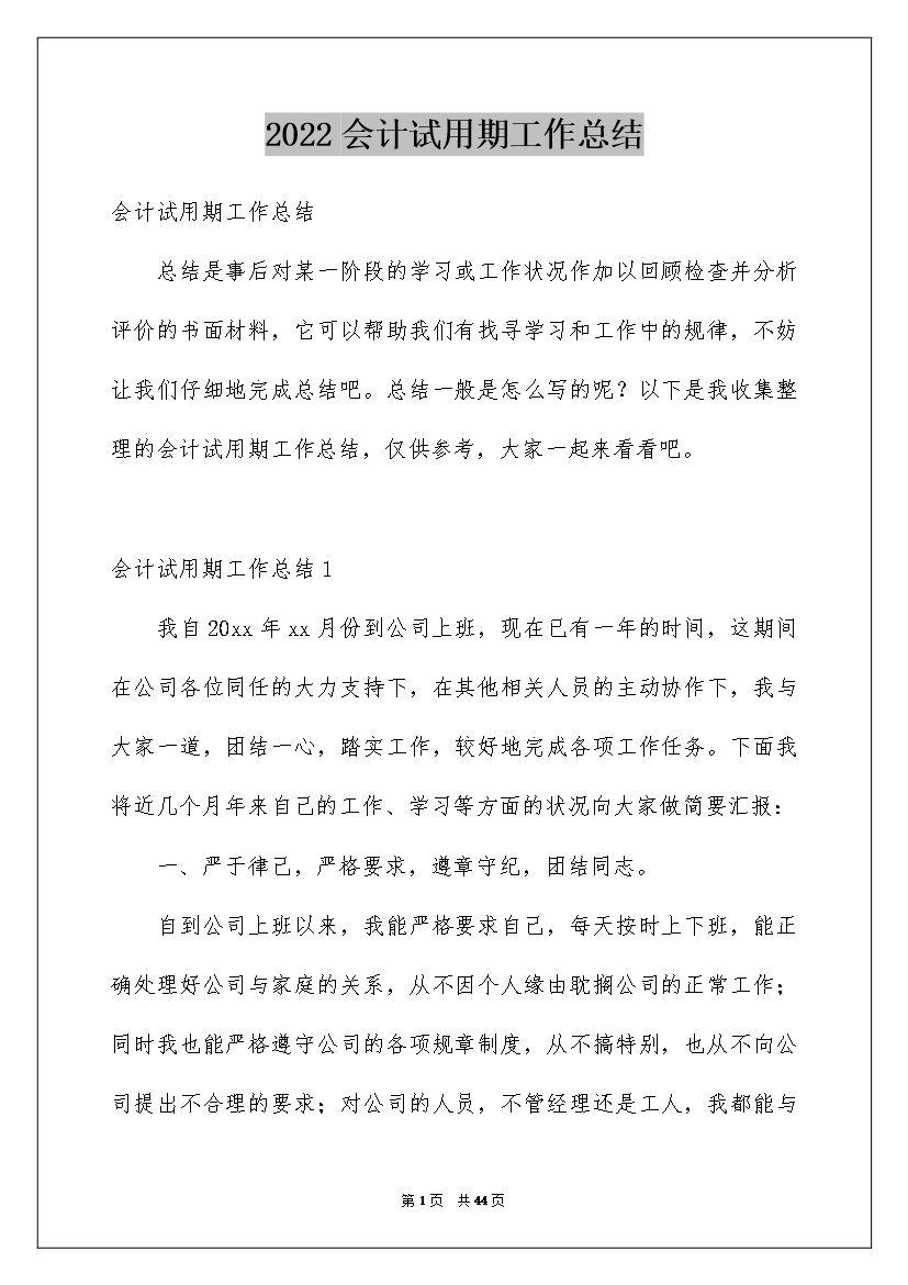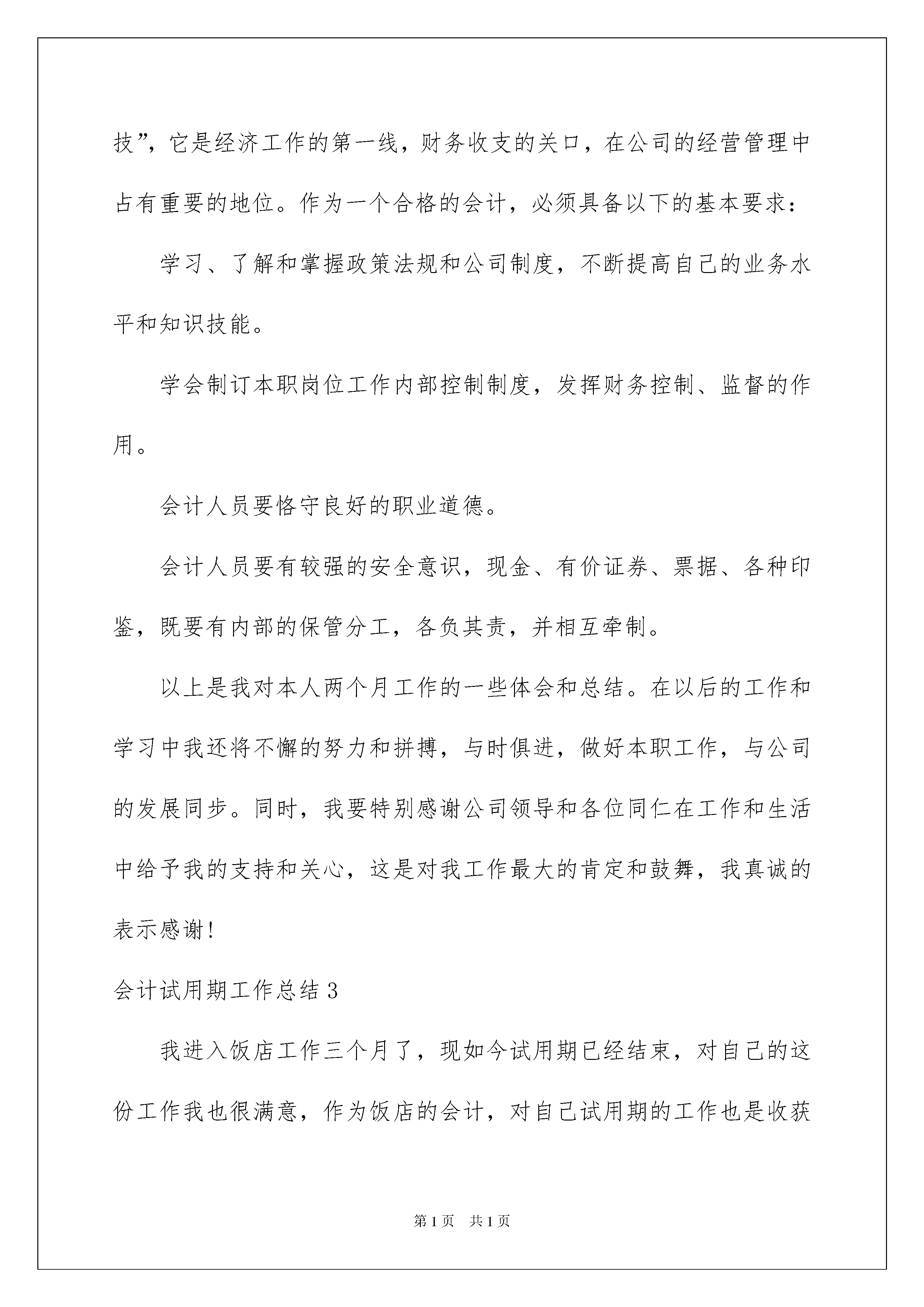 2022会计试用期工作总结会计试用期工作总结总结是指对某一阶段的工作、学习或思想中的经验或情况加以总结和概括的书面材料它能够给人努力工作的动力让我们来为自己写一份总结吧。那么总结要注意有什么内容呢?下面是我收集整理的会计试用期