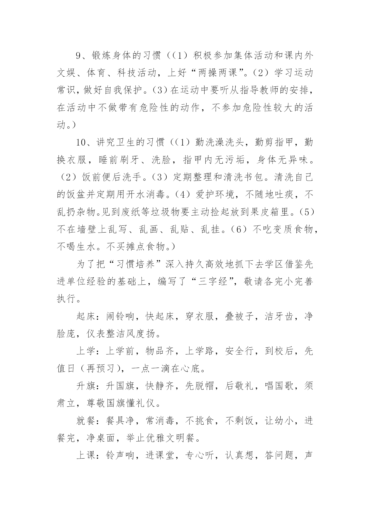行为习惯养成教育实施方案行为习惯养成教育实施方案为了确保我们的努力取得实效,通常需要提前准备好一份方案,方案的内容多是上级对下级或涉及面比较大的工作,一般都用带“文件头”形式下发。那么大家知道方案怎么写才规范吗?下面是小编精心整理的行为习惯养成教育实施方案,欢迎阅读,希望大家能够喜欢。行为习惯养成教育实施方案1为了进一步落实科学发展观,深入推进素质教育,切实提高我中心小学学生的文明素质,努力创办人民满意的教育,依据《南五十家子学区中心校中小学生良好行为习惯养成教育提升工程实施方案》,特制定本方案。一、指导