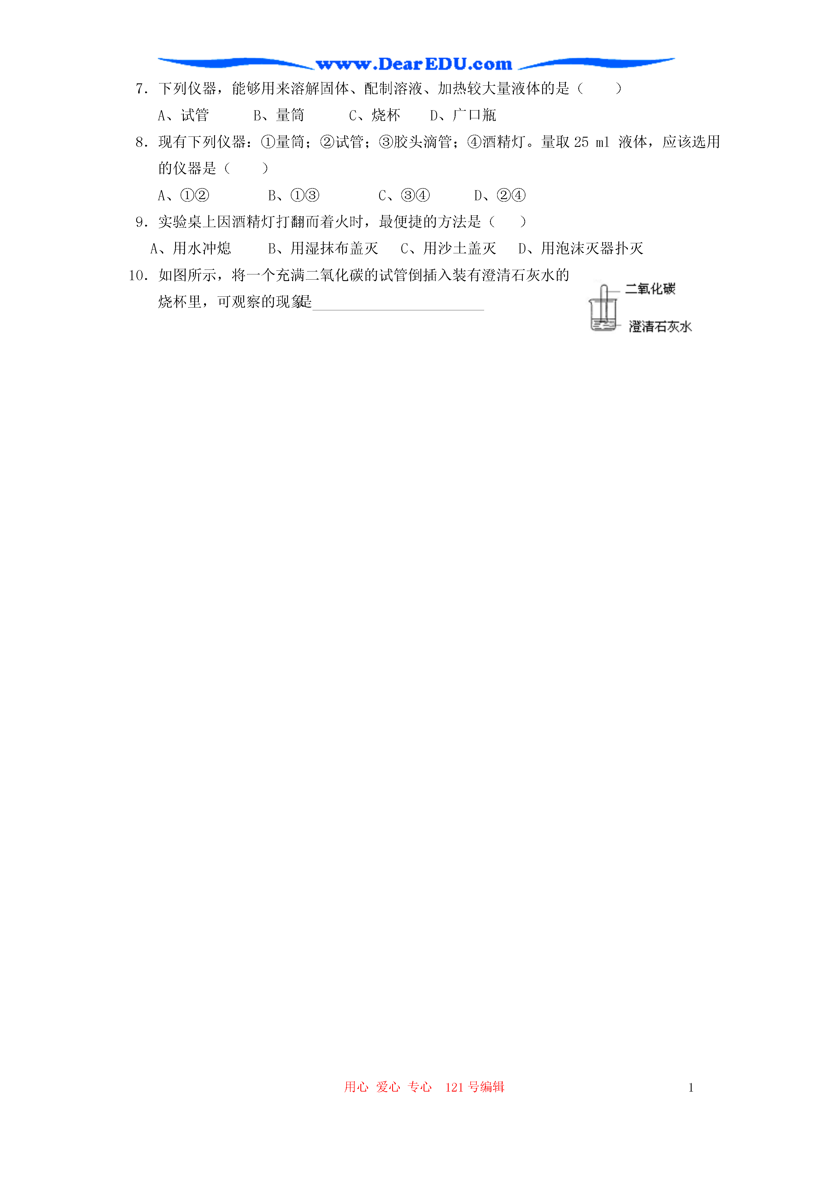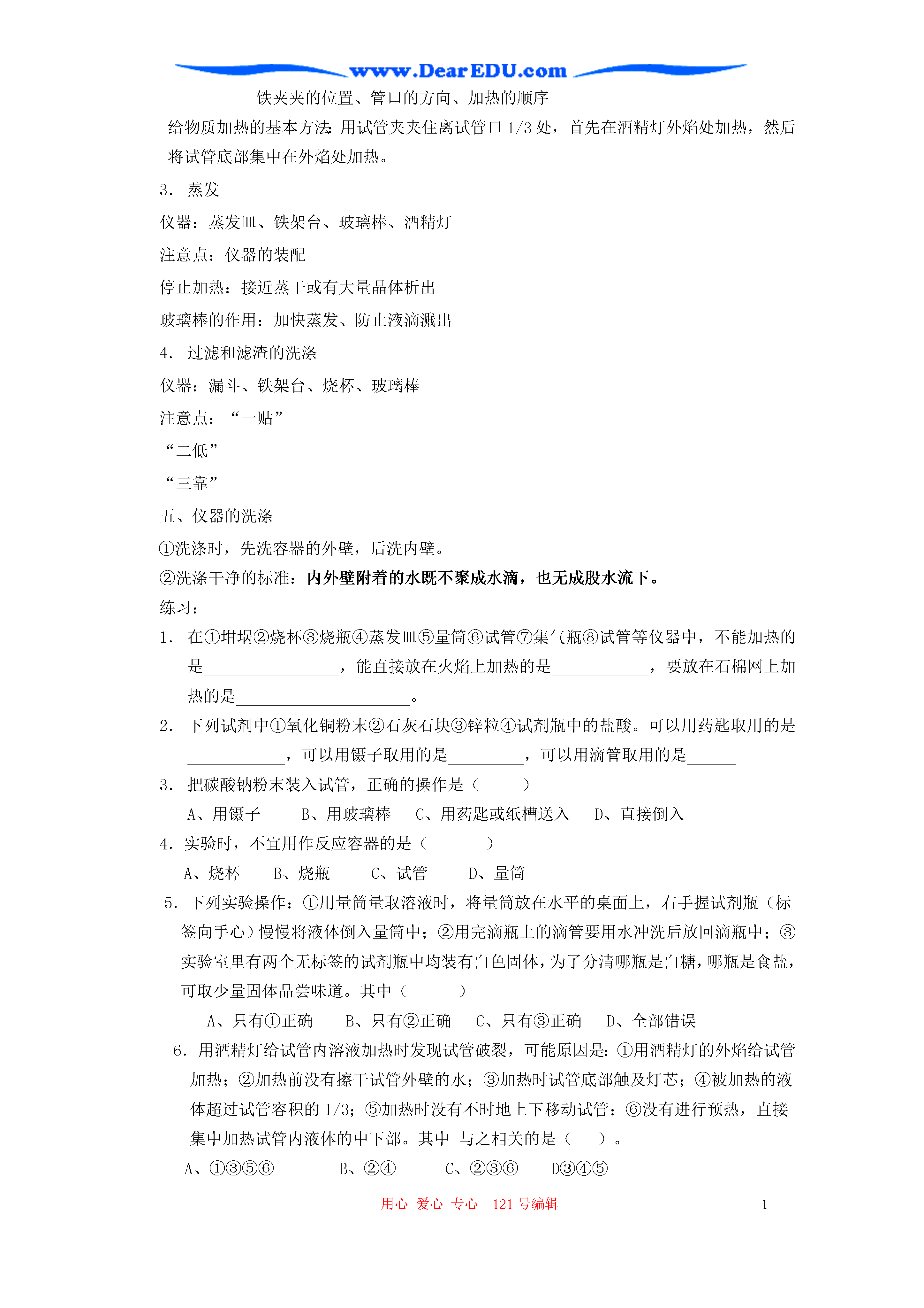 用心爱心专心119号编辑1走进化学世界单元综合复习刘秀全(一)重点、热点突破本单元的内容是:1.化学是一门使人类生活得更美好的自然科学,研究物质的组成、结构、性质以及变化规律。2.学习化学的一个重要途径是科学探究,实验是科学探究的重要手段。3.严谨的科学态度、合理的实验步骤和正确的操作方法是实验成功的关键。本单元的重点和热点是化学实验的基本操作,它不仅考查同学们对常见仪器的识别、实验操作方法的了解,主要是考查同学们的实际动手操作能力,检验同学们在化学学习过程中,参与实验活动的程度,在
