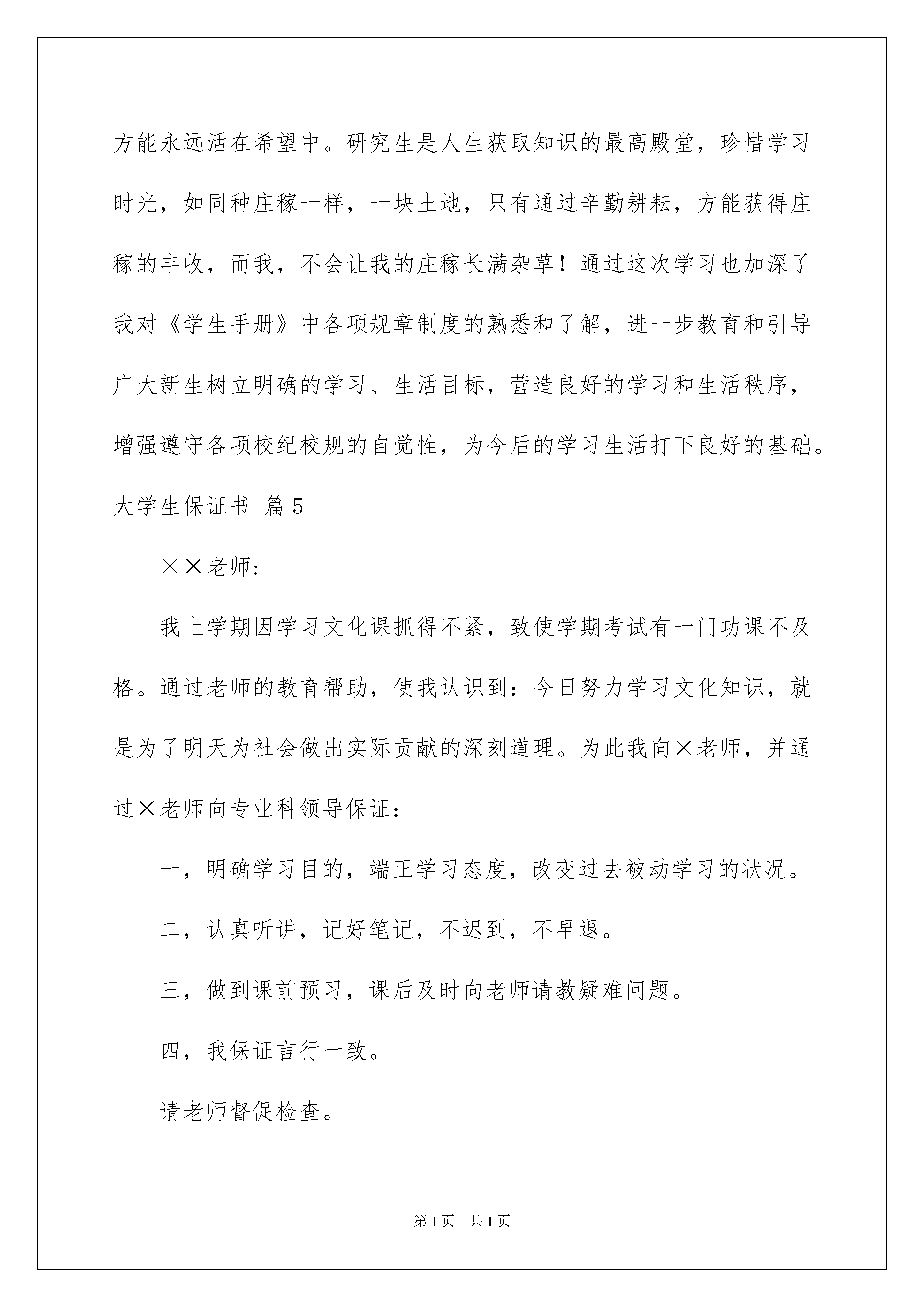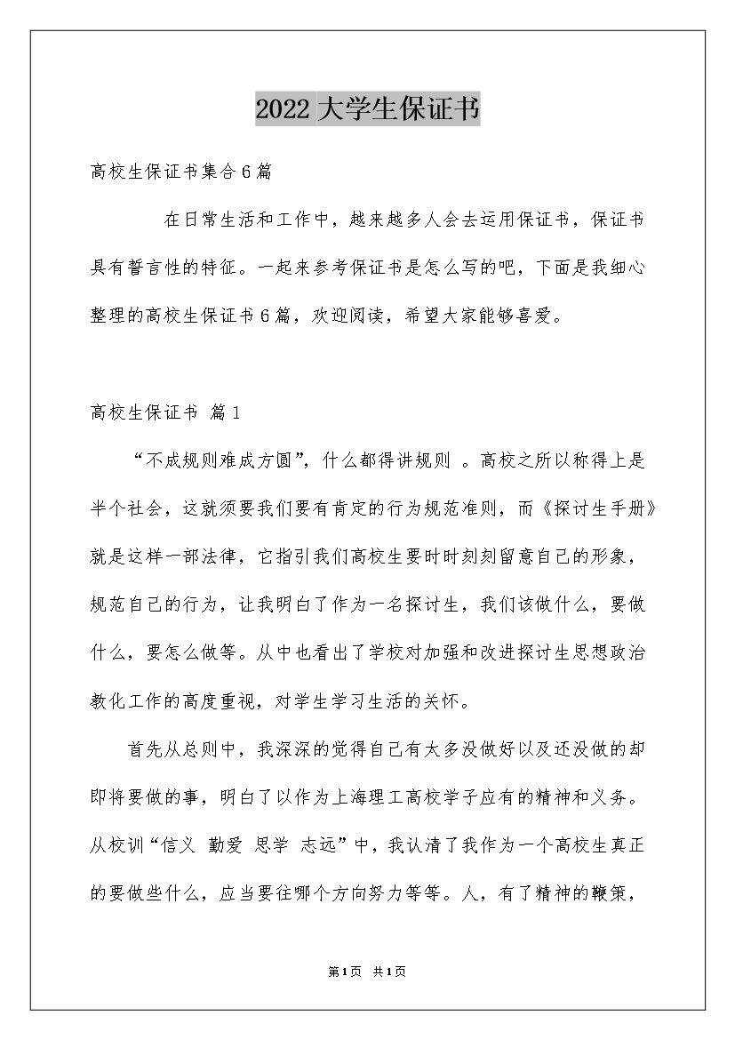 2022大学生保证书大学生保证书在当下社会我们使用保证书的情况越来越多保证书具有誓言性的特征。那么保证书应该怎么写才合适呢?下面是我帮大家整理的大学生保证书仅供参考大家一起来看看吧。大学生保证书1我自愿申请不在学院统一规定
