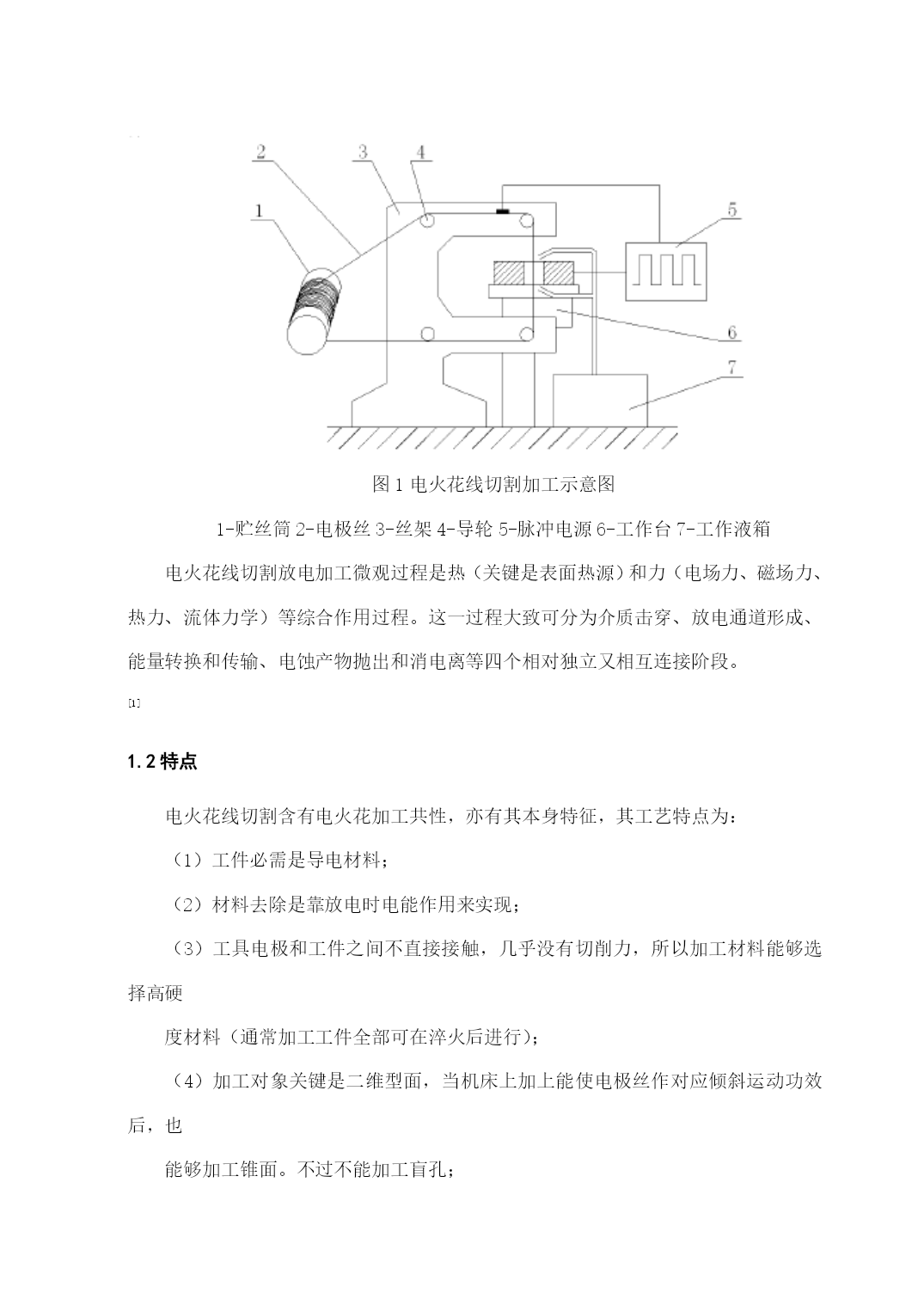 上下双速走丝电火花线切割工艺姓名:班级:学号:1.电火花线切割技术简介电火花线切割加工〔Wire-cutElectricDischargeMachine,以下简称WEDM〕是采纳线状电极作为工具对工件进行脉冲放电实现加工的。线切割机床按电极丝的运丝速度可分为高速走丝机床和低速走丝机床。电极丝运动速度7~10m/s的为高速走丝电火花线切割〔简称HSWEDM〕机床,低于/s的为低速走丝电火花线切割〔简称LSWEDM〕机床。国产的尽大多数为HSWEDM机床,国外的和台湾地区根基上LSWEDM机床。目前,国内外的