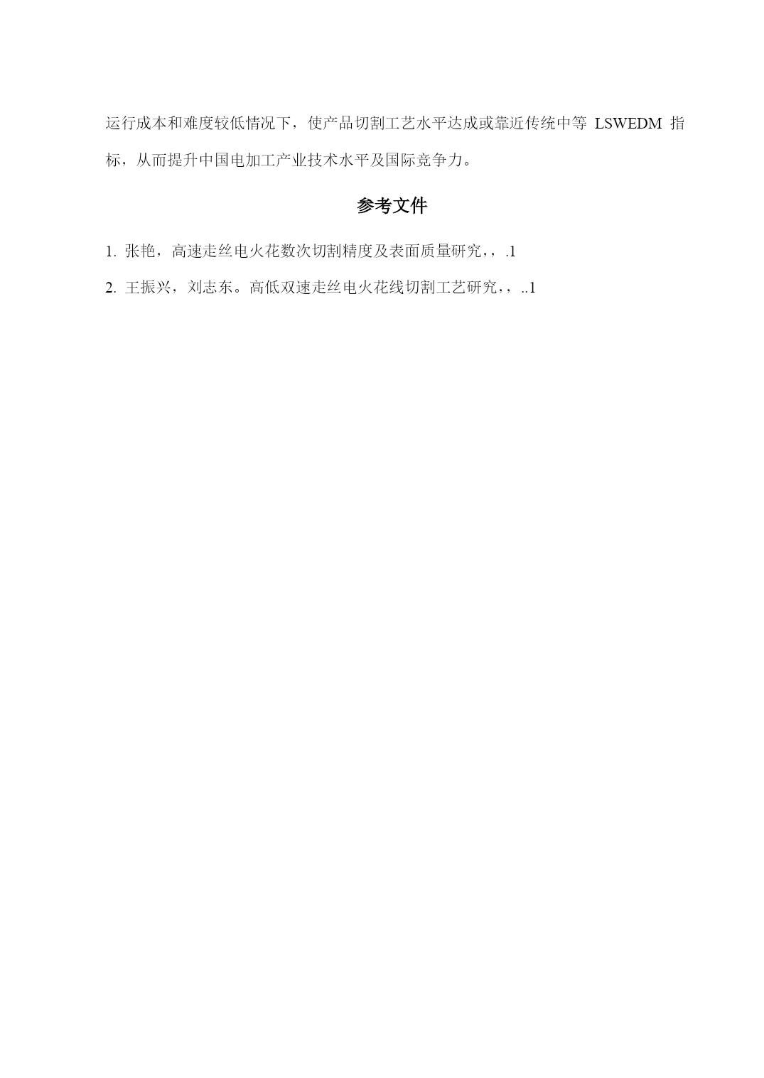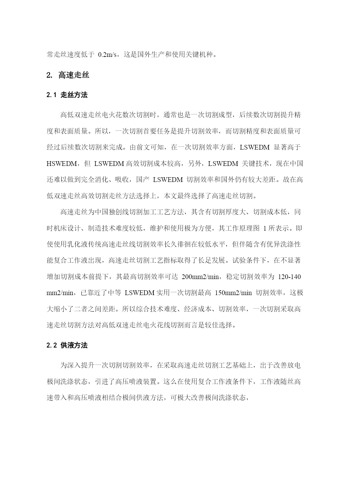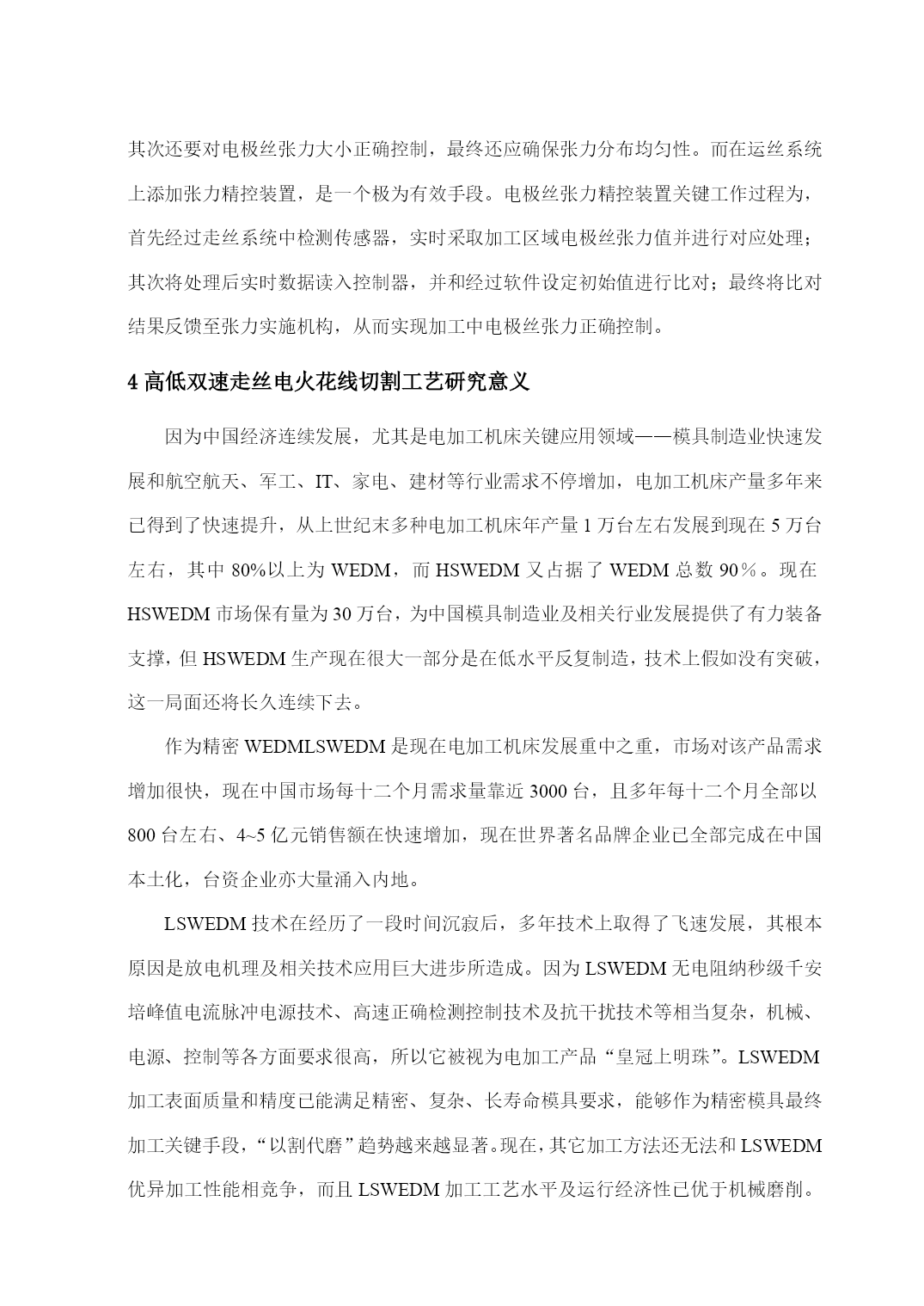 高低双速走丝电火花线切割工艺研究的开题报告一、选题背景及意义随着现代工业的不断发展和电子技术的日益成熟,走丝电火花线切割机已经成为现代制造业中不可或缺的一种技术。其主要工作原理是通过使用电火花将电极上的材料剥落下来,从而将工件切割成所需形状。而高低双速走丝电火花线切割是走丝电火花线切割技术的一种重要改进,可以更好地满足一些特殊场合下的工艺需求。二、研究内容与目的本文旨在对高低双速走丝电火花线切割工艺进行深入的研究和探讨,探究其在实际应用中的优势和应用范围。具体研究内容如下:1.研究高低双速走丝电火花线切割