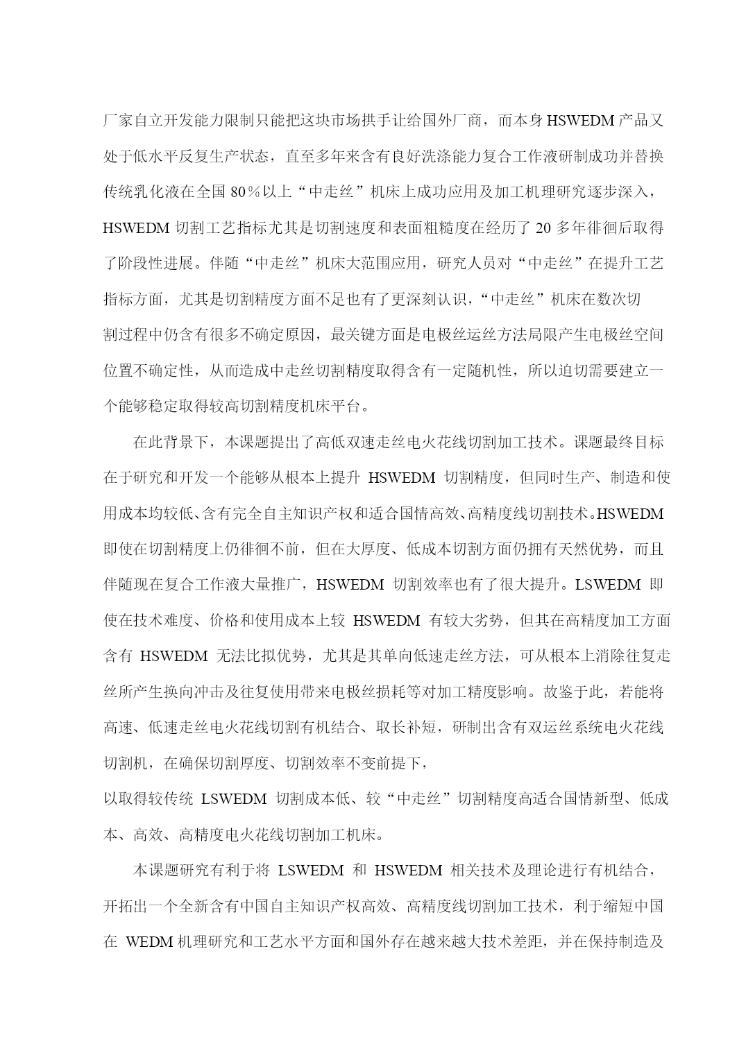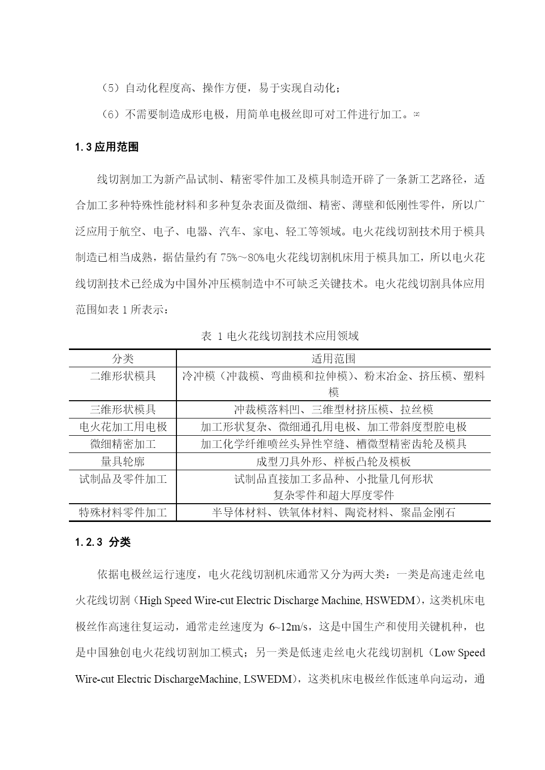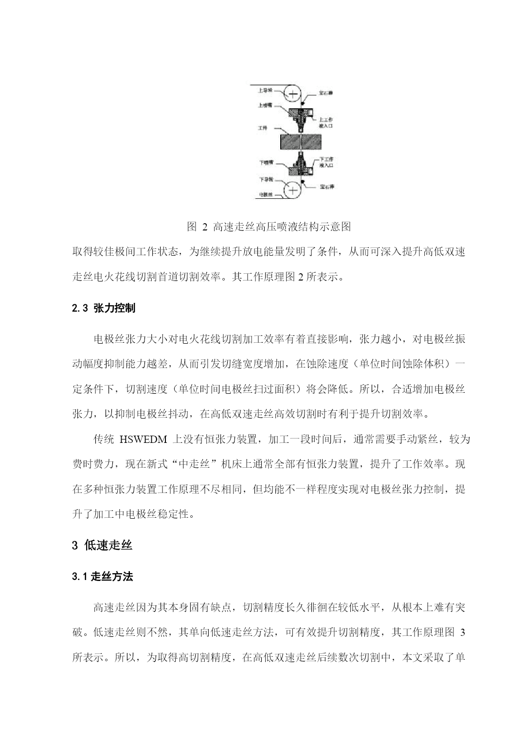 高低双速走丝电火花线切割工艺研究的开题报告一、选题背景及意义随着现代工业的不断发展和电子技术的日益成熟,走丝电火花线切割机已经成为现代制造业中不可或缺的一种技术。其主要工作原理是通过使用电火花将电极上的材料剥落下来,从而将工件切割成所需形状。而高低双速走丝电火花线切割是走丝电火花线切割技术的一种重要改进,可以更好地满足一些特殊场合下的工艺需求。二、研究内容与目的本文旨在对高低双速走丝电火花线切割工艺进行深入的研究和探讨,探究其在实际应用中的优势和应用范围。具体研究内容如下:1.研究高低双速走丝电火花线切割