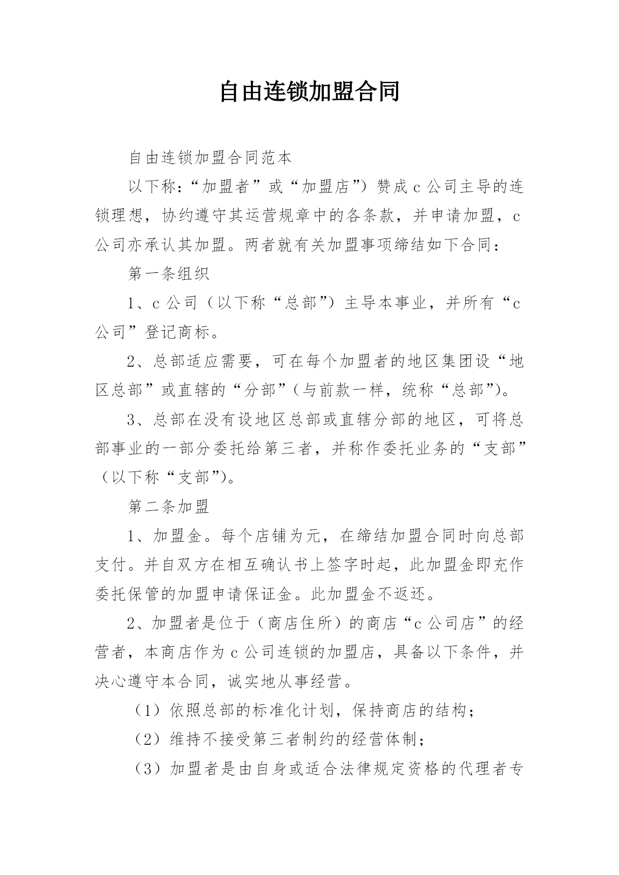 /NUMPAGES12协议编号:自由连锁加盟协议甲方:乙方:20**年**月自由连锁加盟协议(以下称:“加盟者”或“加盟店”)赞成C公司主导的连锁理想,协约遵守其运营规章中的各条款,并申请加盟,C公司亦承认其加盟。两者就关于加盟事项缔结如下协议:第一条组织1、C公司(以下称“总部”)主导本事业,并所有“C公司”登记商标。2、总部适应需要,可在每个加盟者的地区集团设“地区总部”或直辖的“分部”(与前款一样,统称“总部”)。3、总部在没有设地区总部或直辖分部的地区,可将总部事业的一部分