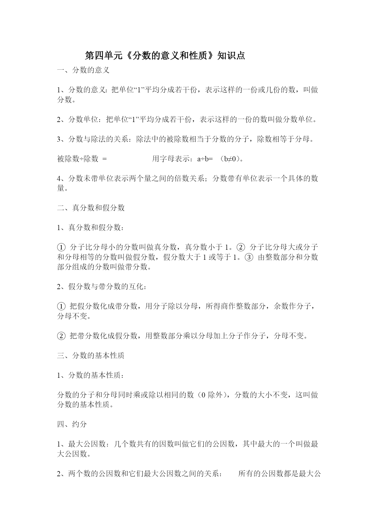 第四单元《分数的意义和性质》知识点一、分数的意义1、分数的意义:把单位“1”平均分成若干份,表示这样的一份或几份的数,叫做分数。2、分数单位:把单位“1”平均分成若干份,表示这样的一份的数叫做分数单位。3、分数与除法的关系:除法中的被除数相当于分数的分子,除数相等于分母。被除数÷除数=用字母表示:a÷b=(b≠0)。4、分数未带单位表示两个量之间的倍数关系;分数带有单位表示一个具体的数量。二、真分数和假分数1、真分数和假分数:①分子比分母小的分数叫做真分数,真分数小于1。②分子比分母大或分子和分母相等的分
