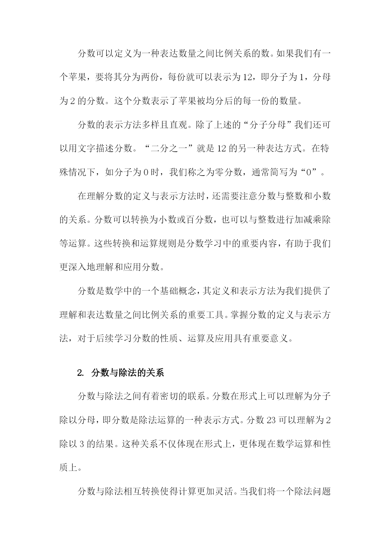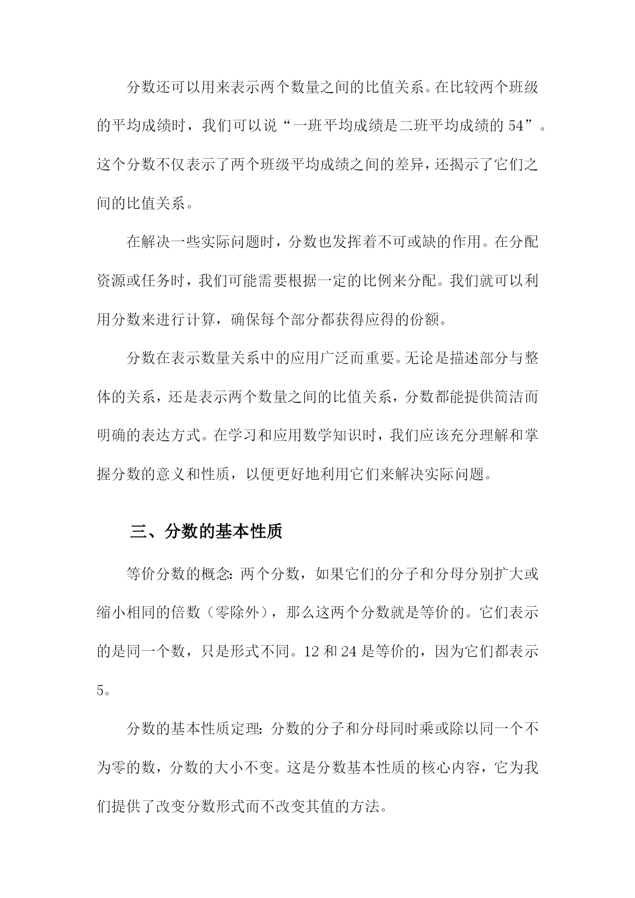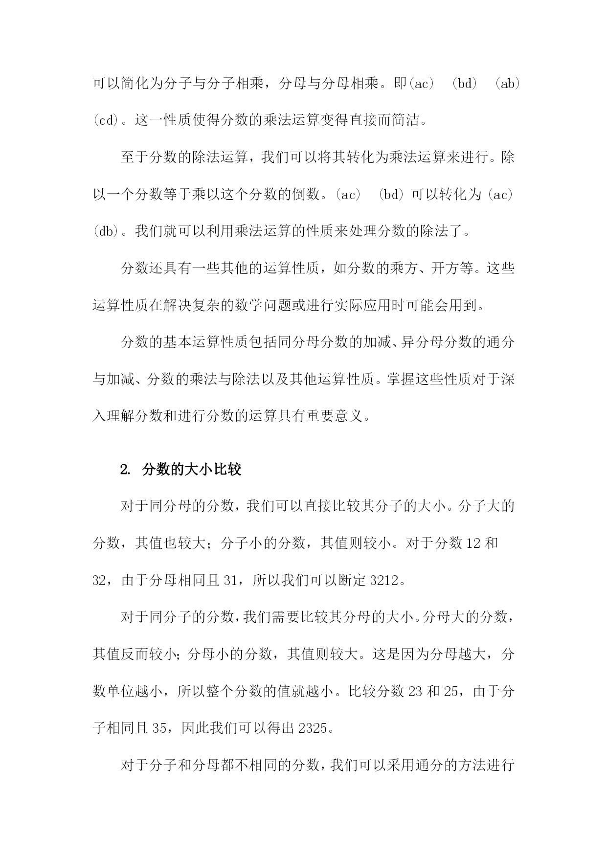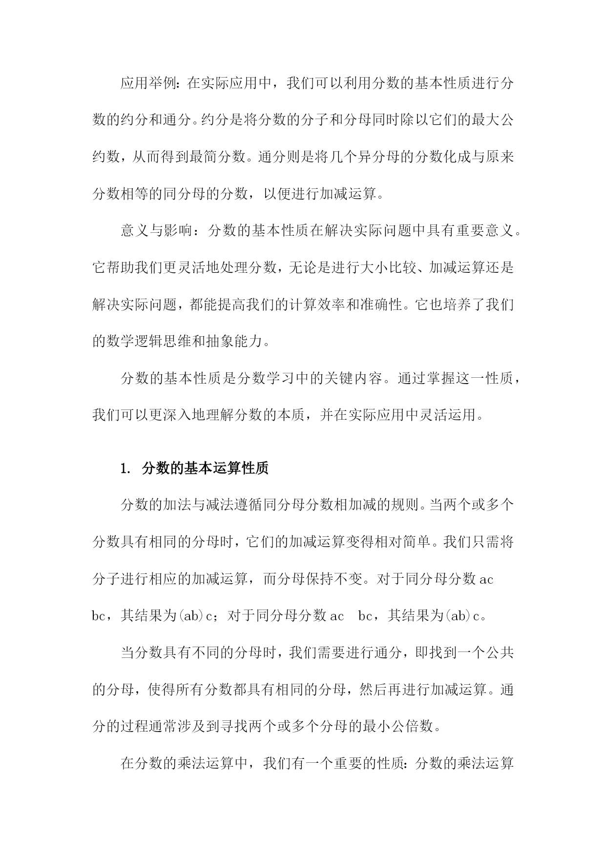 分数的意义和性质知识点总结一、概述作为数学中的一个基本概念,其意义和性质在日常生活和学习中都有着广泛的应用。顾名思义,就是整体的一部分,它表示一个数被另一个数除的结果,通常用分子和分母的形式来表示。分子表示被除数,分母表示除数,而分数线则代表除法运算。分数的意义不仅在于表示数量的一部分,更在于它揭示了数与数之间的关系。我们可以比较不同数量的大小,进行加减乘除等运算,甚至解决复杂的数学问题。理解和掌握分数的意义是学习数学的基础。分数的性质也是其重要组成部分。分数的性质包括分数的基本性质、约分与通分、分数与除