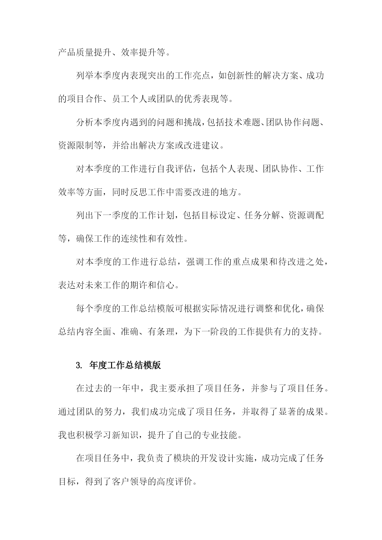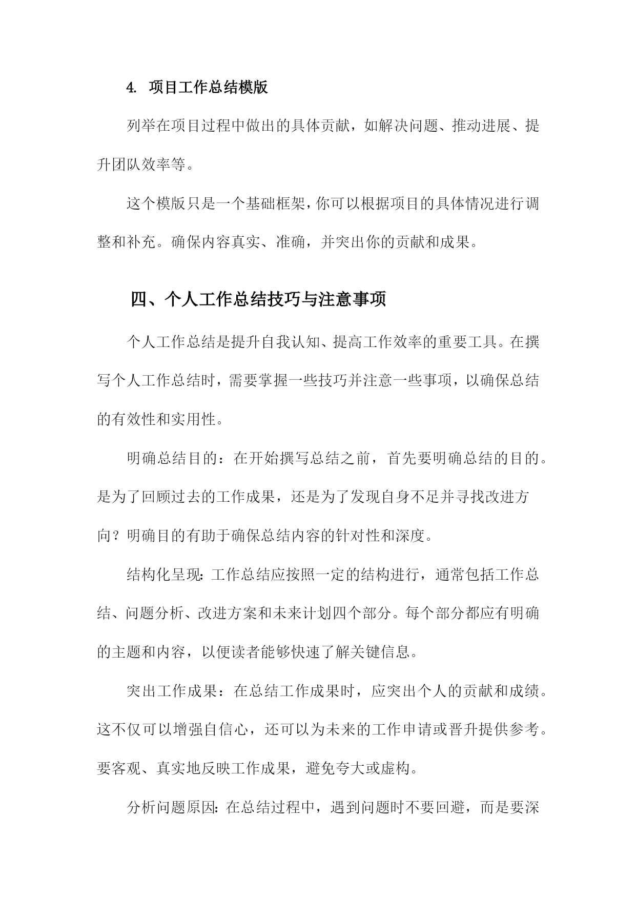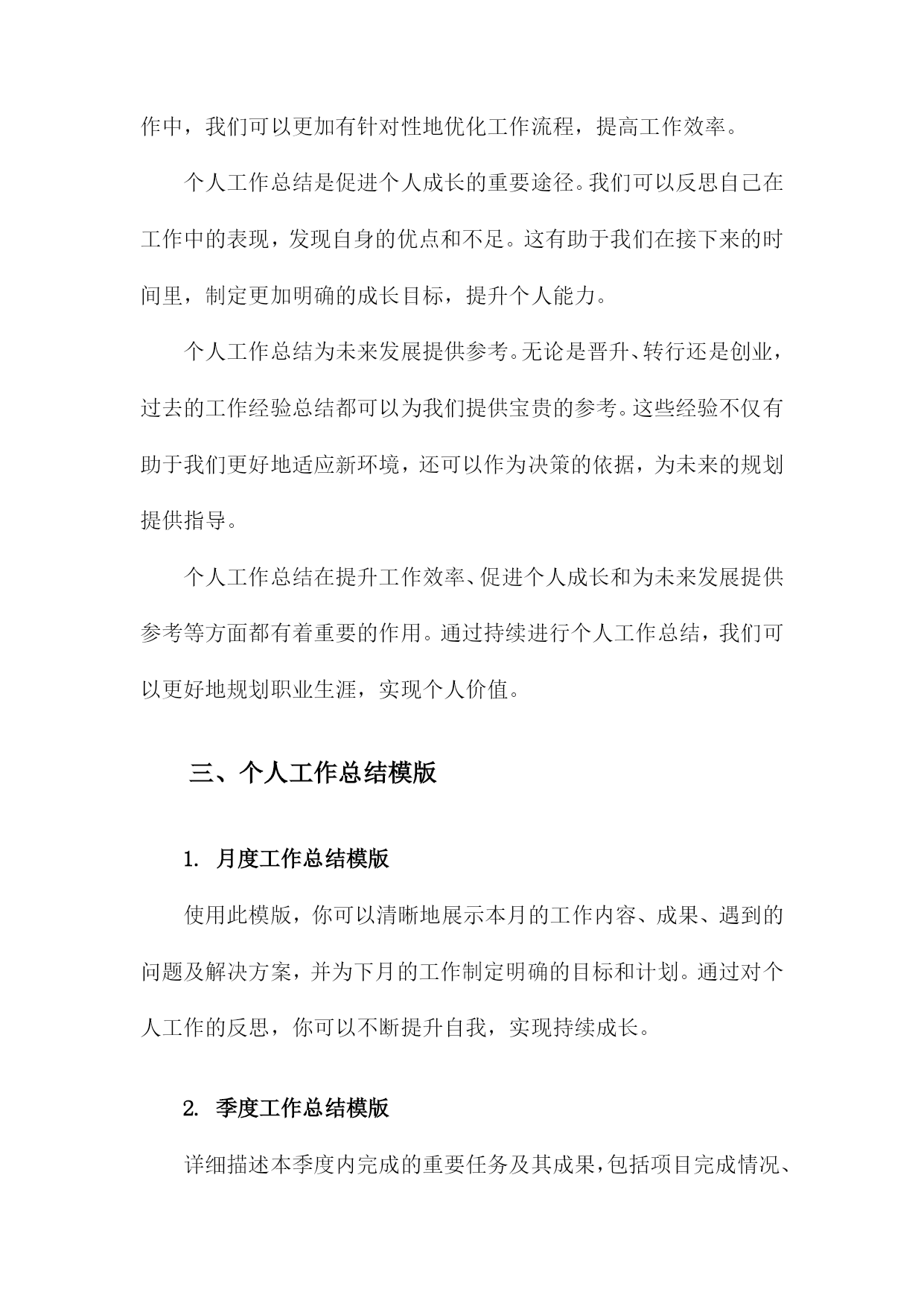 最好的个人工作总结模版大全一、概述在过去的一年中,我全身心地投入到工作中,始终秉持着敬业、认真、负责的态度,努力提升自己的专业技能和综合素质。通过不断学习和实践,我取得了显著的进步,不仅完成了各项任务,还超额完成了部分工作,为公司的发展贡献了自己的力量。在这一年里,我主要负责了项目的管理和推进工作。通过深入了解项目需求,我制定了详细的工作计划,并有效地协调了各方资源,确保了项目的顺利进行。我还积极参与了公司的其他项目,提供了我的专业意见和支持,为公司的发展做出了贡献。在团队合作方面,我始终坚持良好的沟通和