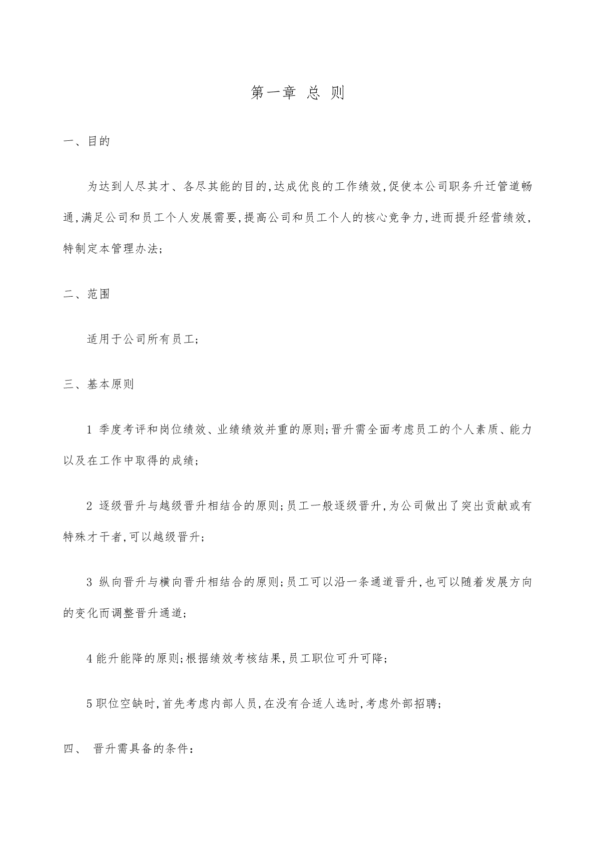 第一章总则一、目的为达到人尽其才、各尽其能的目的,达成优良的工作绩效,促使本公司职务升迁管道畅通,满足公司和员工个人发展需要,提高公司和员工个人的核心竞争力,进而提升经营绩效,特制定本管理办法;二、范围适用于公司所有员工;三、基本原则1季度考评和岗位绩效、业绩绩效并重的原则;晋升需全面考虑员工的个人素质、能力以及在工作中取得的成绩;2逐级晋升与越级晋升相结合的原则;员工一般逐级晋升,为公司做出了突出贡献或有特殊才干者,可以越级晋升;3纵向晋升与横向晋升相结合的原则;员工可以沿一条通道晋升,也可以随着发展方