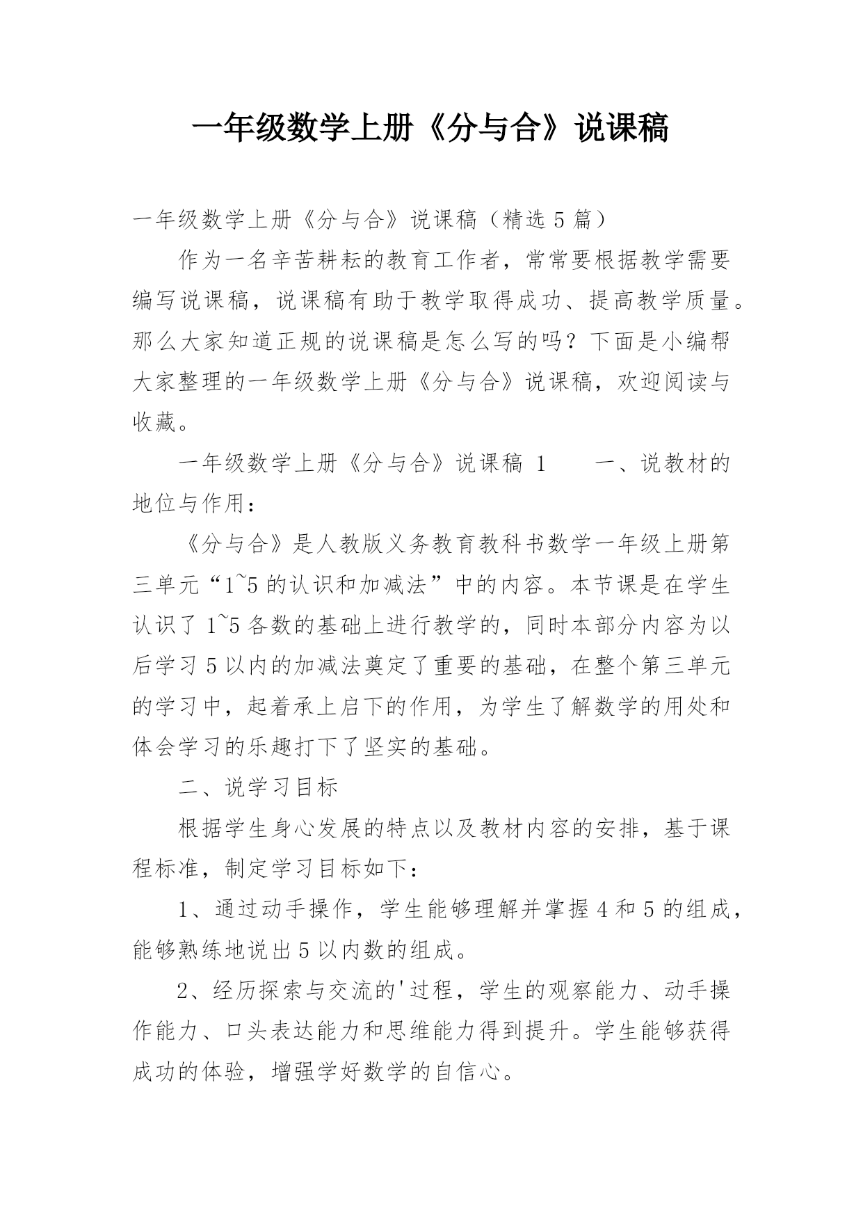 一年级数学上册《分与合》说课稿一年级数学上册《分与合》说课稿(精选5篇)作为一名辛苦耕耘的教育工作者,常常要根据教学需要编写说课稿,说课稿有助于教学取得成功、提高教学质量。那么大家知道正规的说课稿是怎么写的吗?下面是小编帮大家整理的一年级数学上册《分与合》说课稿,欢迎阅读与收藏。一年级数学上册《分与合》说课稿1一、说教材的地位与作用:《分与合》是人教版义务教育教科书数学一年级上册第三单元“1~5的认识和加减法”中的内容。本节课是在学生认识了1~5各数的基础上进行教学的,同时本部分内容为以后学习5以内的加减