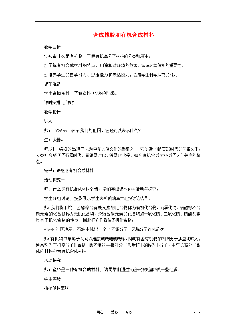 -1-用心爱心专心合成橡胶和有机合成材料教学目标:1.知道什么是有机物,了解有机高分子材料的分类和用途。2.了解有机合成材料的特点、用途和对环境的危害,认识环境保护的重要性。3.培养学生的自学能力、思维能力和表达能力,发展学生科学探究的能力。课前准备:学生查阅资料,了解塑料制品的利与弊。课时安排1课时教学设计:导入师:“China”表示我们的祖国,它还可以表示什么?生:瓷器。师:对!瓷器的出现已成为中华民族文化的象征之一,它创造了新石器时代的仰韶文化。人类社会经历了