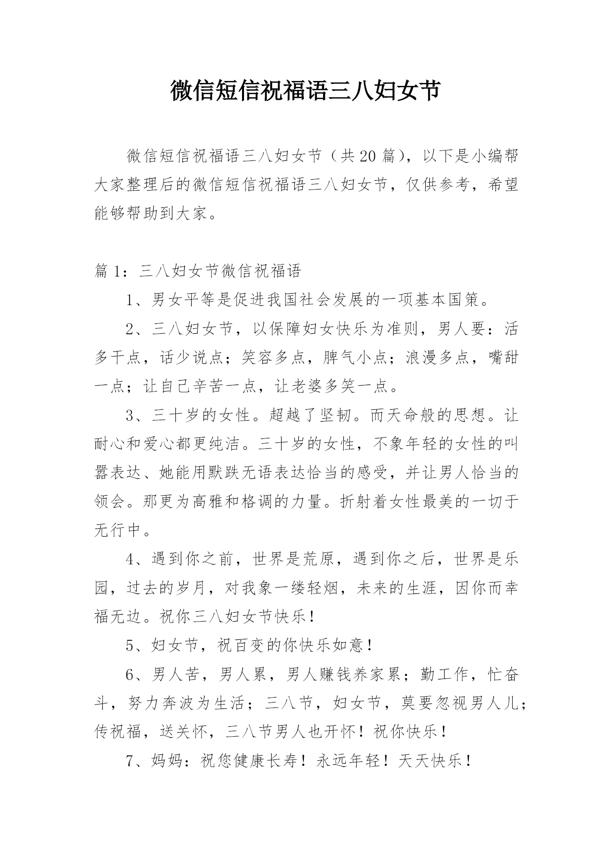 微信短信祝福语三八妇女节微信短信祝福语三八妇女节(共20篇),以下是小编帮大家整理后的微信短信祝福语三八妇女节,仅供参考,希望能够帮助到大家。篇1:三八妇女节微信祝福语1、男女平等是促进我国社会发展的一项基本国策。2、三八妇女节,以保障妇女快乐为准则,男人要:活多干点,话少说点;笑容多点,脾气小点;浪漫多点,嘴甜一点;让自己辛苦一点,让老婆多笑一点。3、三十岁的女性。超越了坚韧。而天命般的思想。让耐心和爱心都更纯洁。三十岁的女性,不象年轻的女性的叫嚣表达、她能用默跌无语表达恰当的感受,并让男人恰当的领会。