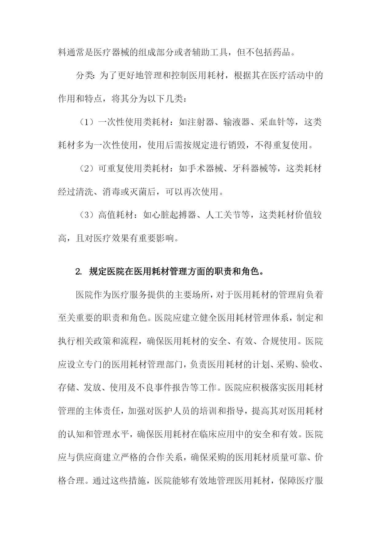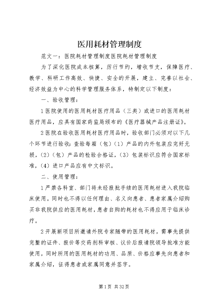 医用耗材管理制度范文一:医院耗材管理制度医院耗材管理制度为了深化医院成本核算,厉行节约,增收节支,保障医疗、教学、科研工作高效、快捷、安全的开展,建立、完善以社会、经济效益为中心的科学管理服务体系,特制定以下制度:一、验收管理:1医院使用的医用耗材医疗用品(三类)或进口的医用耗材医疗用品,应具有国家药监局颁布的《医疗器械产品注册证》。2医院在验收医用耗材医疗用品时,验收部门必须对以下几个环节进行验收:查验每箱(包)(1)产品的内外包装应完好无损,(2)(包)产品的检验合格证,(3)包装标识应符合国家标准,