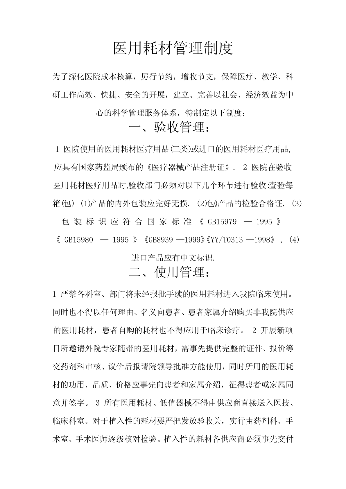 医用耗材管理制度为了深化医院成本核算,厉行节约,增收节支,保障医疗、教学、科研工作高效、快捷、安全的开展,建立、完善以社会、经济效益为中心的科学管理服务体系,特制定以下制度:一、验收管理:1医院使用的医用耗材医疗用品(三类)或进口的医用耗材医疗用品,应具有国家药监局颁布的《医疗器械产品注册证》.2医院在验收医用耗材医疗用品时,验收部门必须对以下几个环节进行验收:查验每箱(包)(1)产品的内外包装应完好无损.(2)包()产品的检验合格证.(3)包装标识应符合国家标准《GB15979—1995》《GB1598