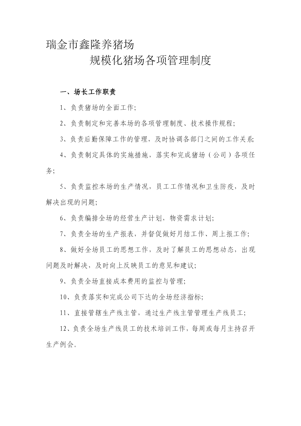 瑞金市鑫隆养猪场规模化猪场各项管理制度一、场长工作职责1、负责猪场的全面工作;2、负责制定和完善本场的各项管理制度、技术操作规程;3、负责后勤保障工作的管理,及时协调各部门之间的工作关系;4、负责制定具体的实行措施,贯彻和完毕猪场(公司)各项任务;5、负责监控本场的生产情况,员工工作情况和卫生防疫,及时解决出现的问题;6、负责编排全场的经营生产计划,物资需求计划;7、负责全场的生产报表,并督促做好月结工作、周上报工作;8、做好全场员工的思想工作,及时了解员工的思想动态,出现问题及时解决,及时向上反映员工的
