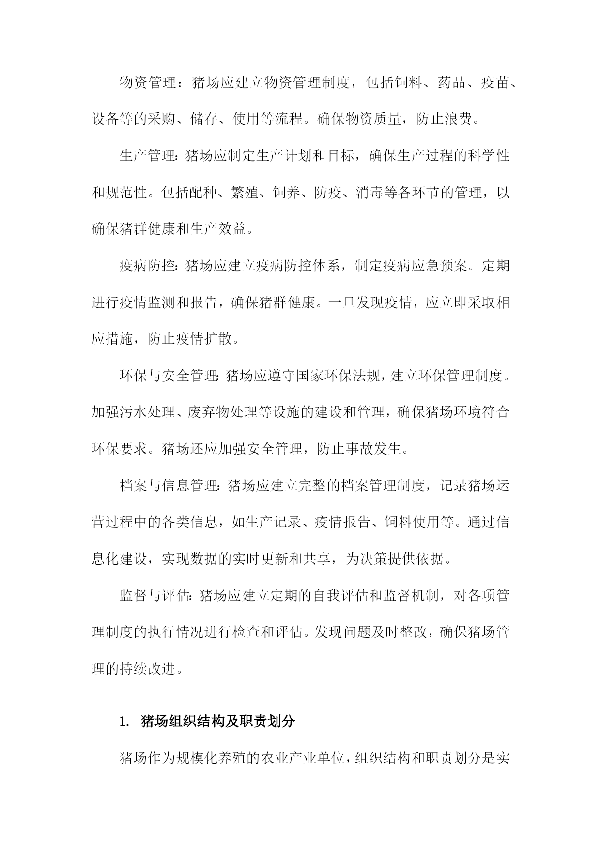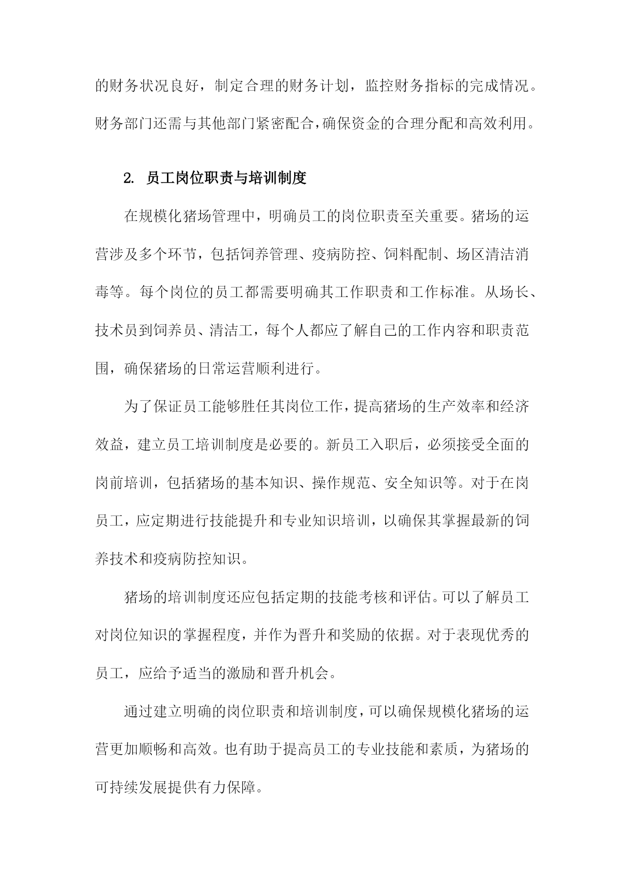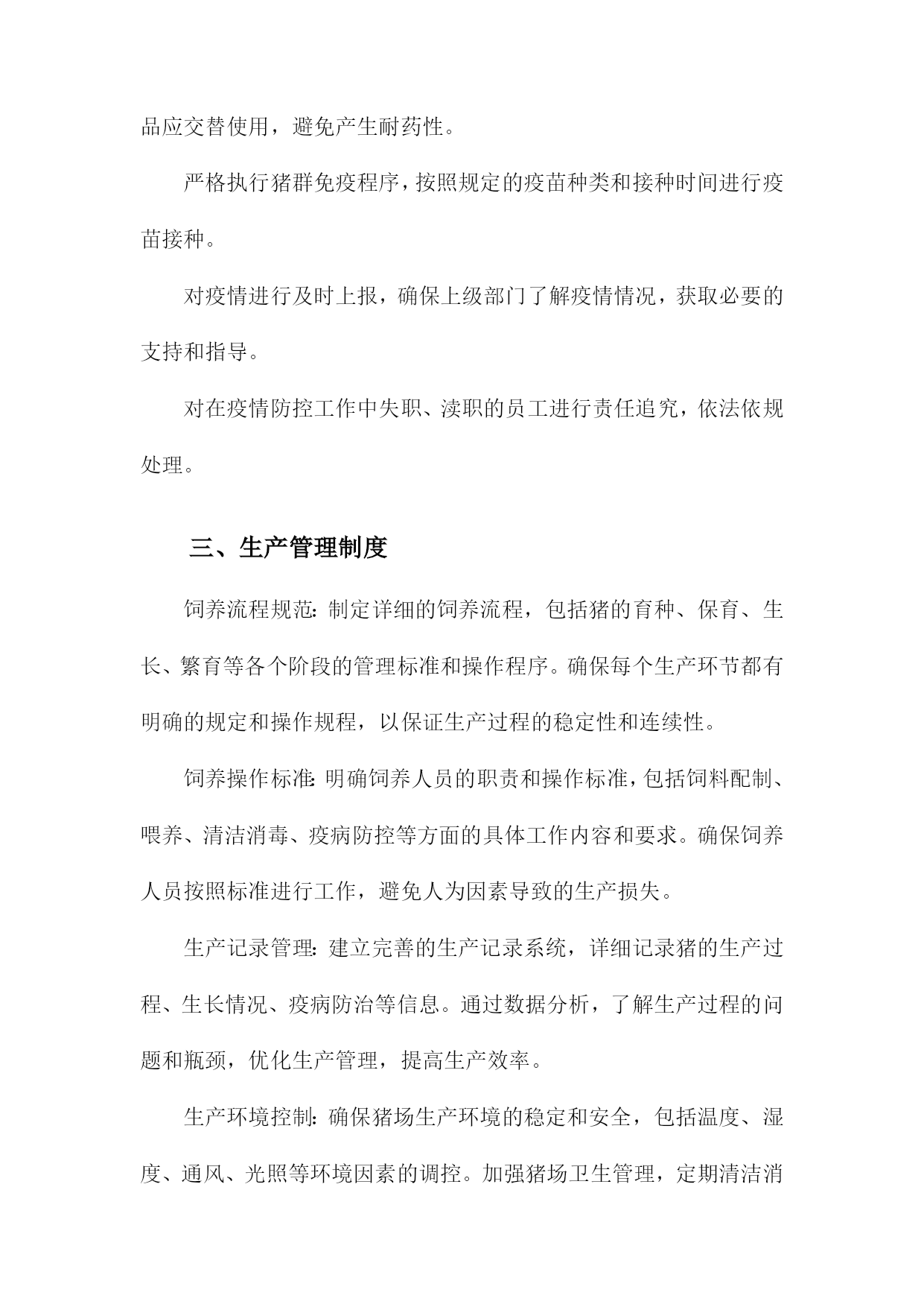 规模化猪场各项管理制度一、文章标题:《规模化猪场各项管理制度》随着畜牧业的快速发展,规模化猪场在我国各地如雨后春笋般涌现。为了保障猪场的正常运营,提高生产效率和经济效益,制定一套科学、合理、实用的管理制度显得尤为重要。本文将详细介绍规模化猪场的各项管理制度,以期为相关从业者提供有益的参考。人员管理是规模化猪场管理的基础,涉及到员工的招聘、培训、考核等方面。猪场应建立严格的招聘制度,确保员工具备相应的专业知识和职业素养。定期开展员工培训,提高员工的业务水平和安全意识。建立科学的考核机制,通过公平公正的评估激