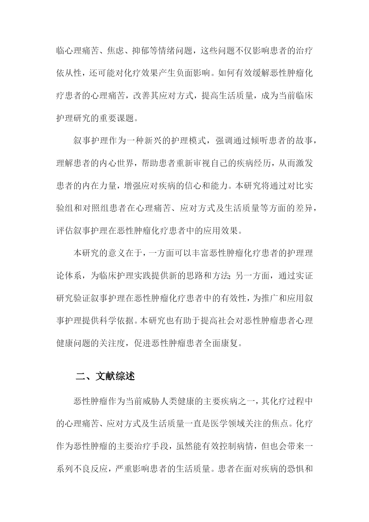 叙事护理对恶性肿瘤化疗患者心理痛苦、应对方式及生活质量的干预研究摘要:《叙事护理对恶性肿瘤化疗患者心理痛苦、应对方式及生活质量的干预研究》文章摘要本研究旨在探讨叙事护理对恶性肿瘤化疗患者心理痛苦、应对方式及生活质量的干预效果。采用随机对照试验设计,将恶性肿瘤化疗患者分为叙事护理组和常规护理组,对比两组患者在心理痛苦、应对方式及生活质量方面的差异。研究结果表明,叙事护理组患者在心理痛苦程度、应对方式及生活质量方面均表现出显著的改善。叙事护理组患者的焦虑、抑郁等心理痛苦症状明显减轻,积极应对方式增加,生活质量