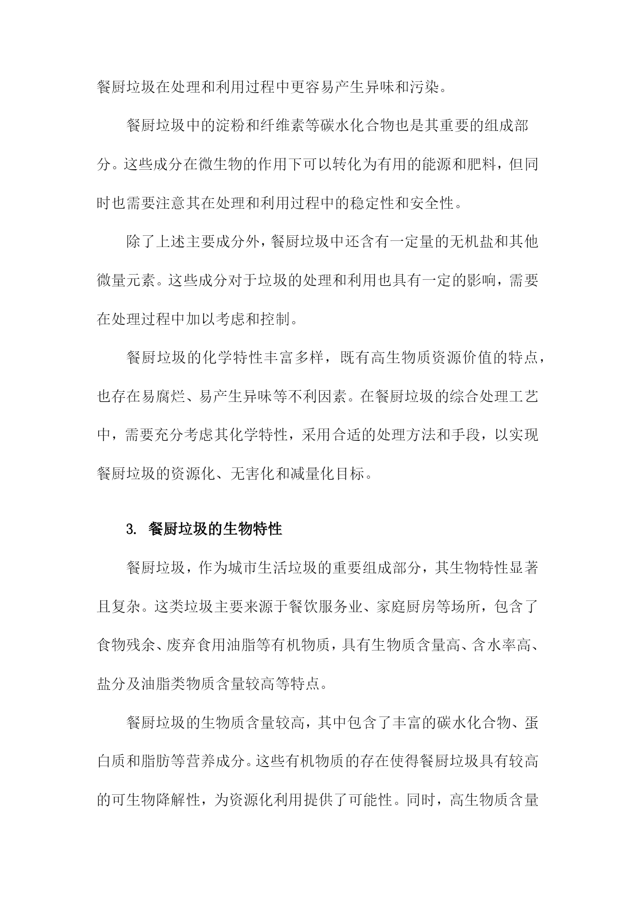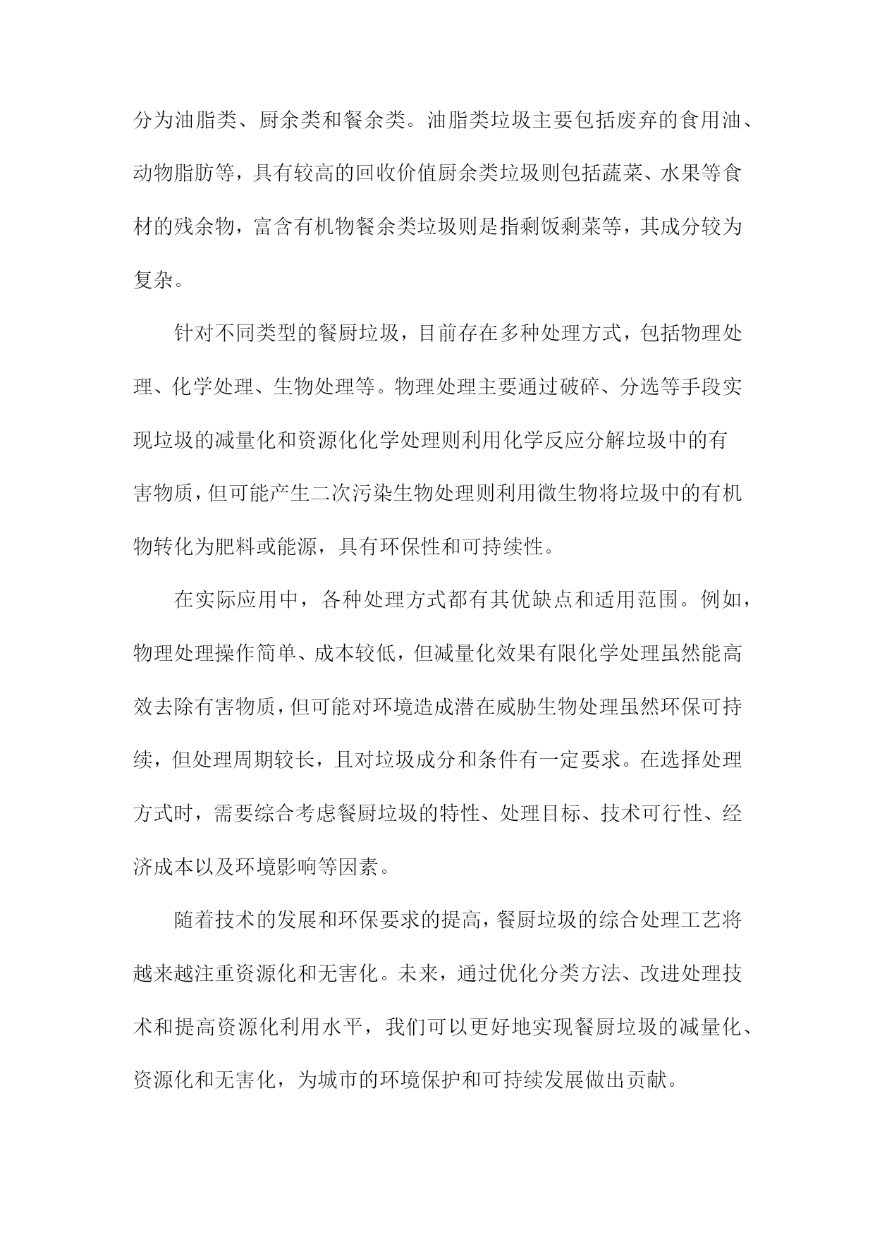 餐厨垃圾的综合处理工艺及应用研究的开题报告一、研究背景随着城市化进程的加快,餐厨垃圾的数量和种类不断增加,给城市环境带来了很大的压力。同时,餐厨垃圾中含有大量的有机物质,处理不当不仅会污染环境,还会对人健康造成威胁。因此,探索餐厨垃圾的综合处理工艺,将其转化为资源,对于保护环境、促进可持续发展具有重要意义。二、研究内容与目的本研究将主要研究餐厨垃圾的综合处理工艺及应用,包括以下内容:1.餐厨垃圾的特点及其来源分析;2.餐厨垃圾的处理工艺,包括生物处理、物理处理和化学处理等;3.借鉴国内外餐厨垃圾处理的先进