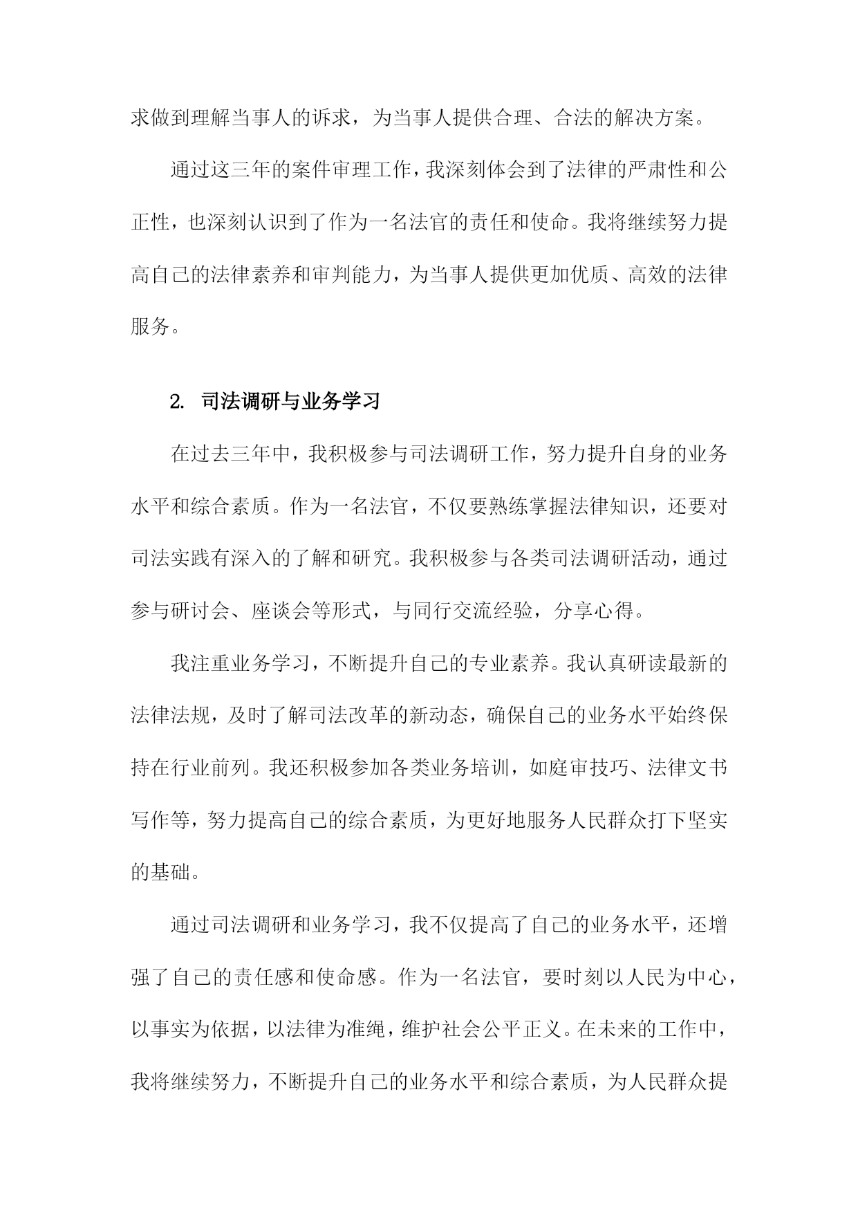 法官三年工作总结法官三年工作总结总结是在某一特定时间段对学习和工作生活或其完成情况,包括取得的成绩、存在的问题及得到的经验和教训加以回顾和分析的书面材料,通过它可以正确认识以往学习和工作中的优缺点,不妨让我们认真地完成总结吧。如何把总结做到重点突出呢?以下是小编为大家收集的法官三年工作总结,仅供参考,欢迎大家阅读。法官三年工作总结1作为掌握审判大权的人民法官,廉洁问题往往决定着思想和行为。当前全国法院廉政建设正在逐步深入,最高法院把“公正高效廉洁”作为司法核心价值观,体现出保持廉洁应成为每个法官遵守的基本