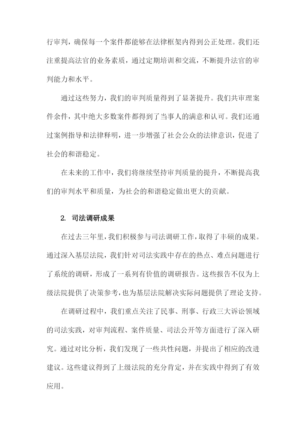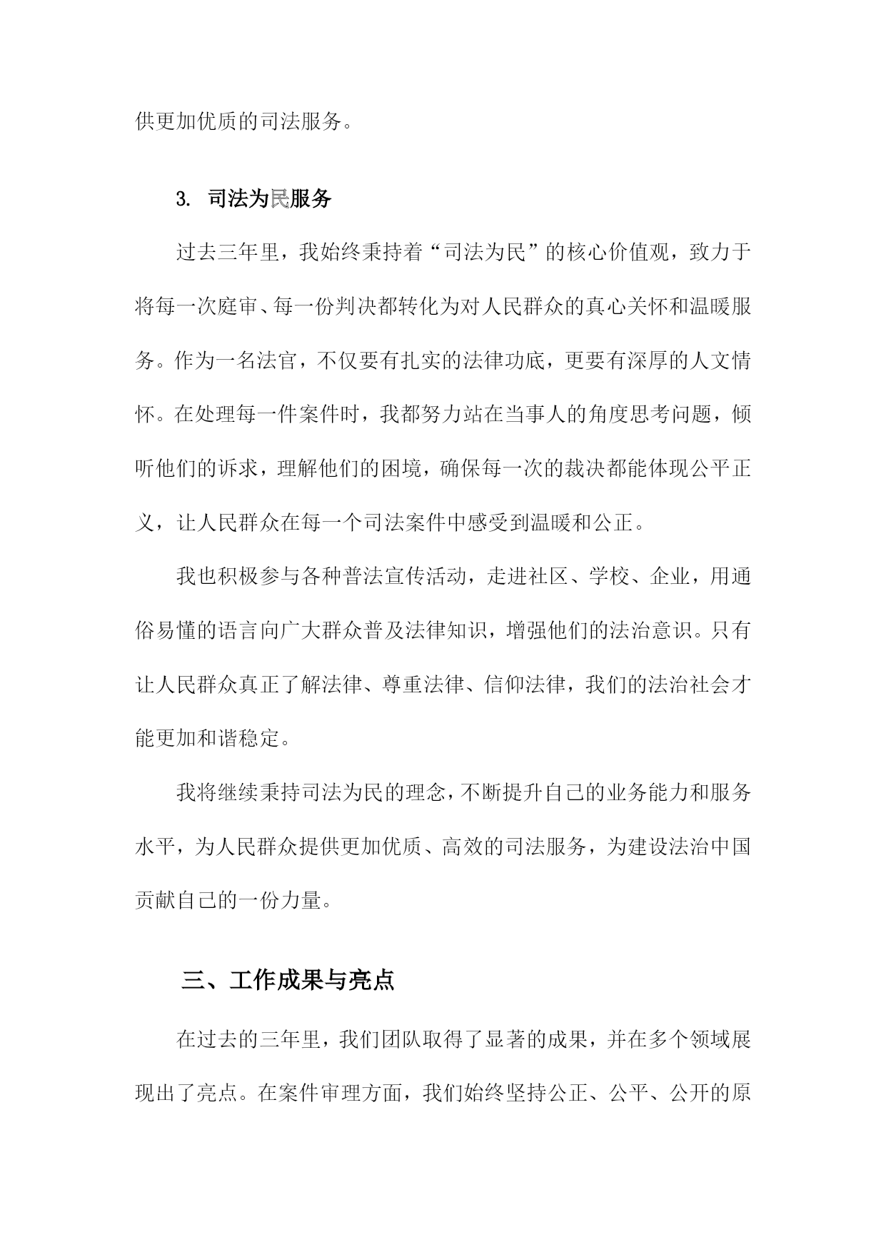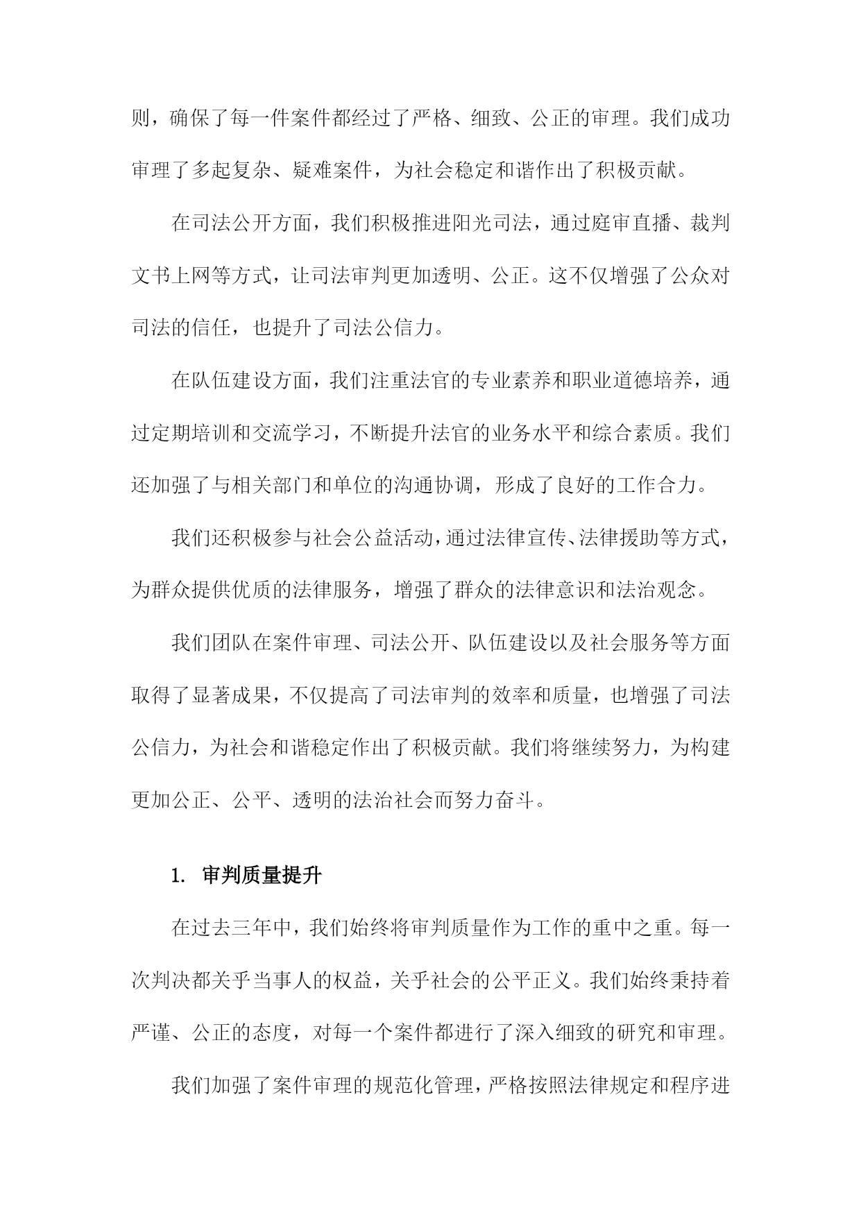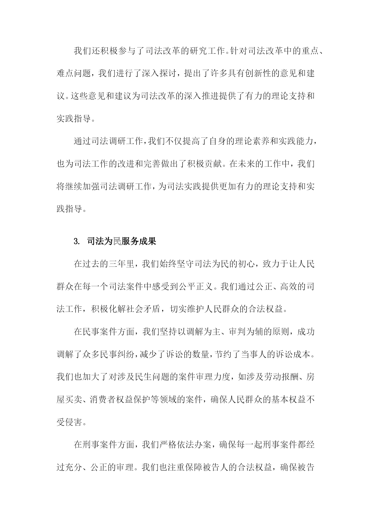 法官三年工作总结一、概述在过去的三年里,作为一名法官,我秉持着公正、公平、公开的原则,努力为每一起案件提供准确、公正的判决。我的主要工作职责包括但不限于审理各类案件、保证庭审公正、及时出具裁判文书以及维持法庭秩序。我共审理了数百起案件,涉及民事、刑事、行政等多个领域,其中不乏重大、疑难、复杂的案件。在案件审理过程中,我始终坚持依法办案,注重证据审查,确保每一个判决都建立在充分的事实和法律依据之上。我也注重与当事人的沟通,耐心听取他们的意见和诉求,力求在保护当事人合法权益的实现法律效果和社会效果的有机统一。