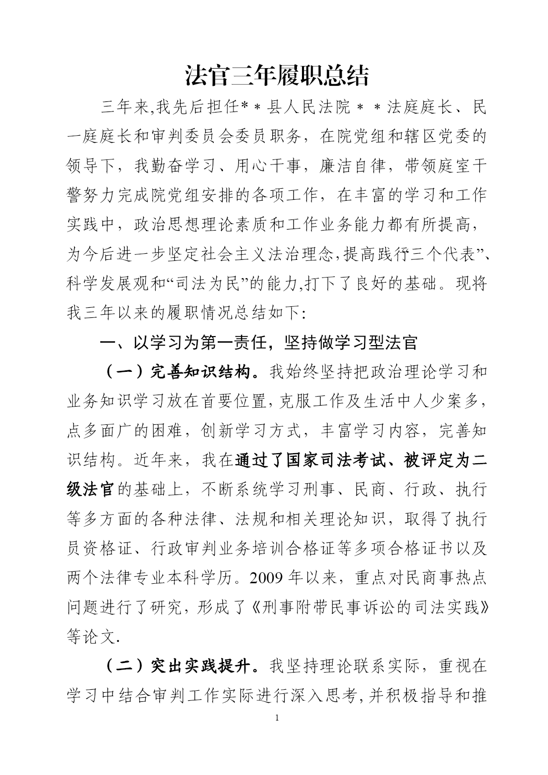法官三年履职总结三年来,我先后担任**县人民法院**法庭庭长、民一庭庭长和审判委员会委员职务,在院党组和辖区党委的领导下,我勤奋学习、用心干事,廉洁自律,带领庭室干警努力完成院党组安排的各项工作,在丰富的学习和工作实践中,政治思想理论素质和工作业务能力都有所提高,为今后进一步坚定社会主义法治理念,提高践行“三个代表”、科学发展观和“司法为民”的能力,打下了良好的基础。现将我三年以来的履职情况总结如下:一、以学习为第一责任,坚持做学习型法官(一)完善知识结构。我始终坚持把政治理