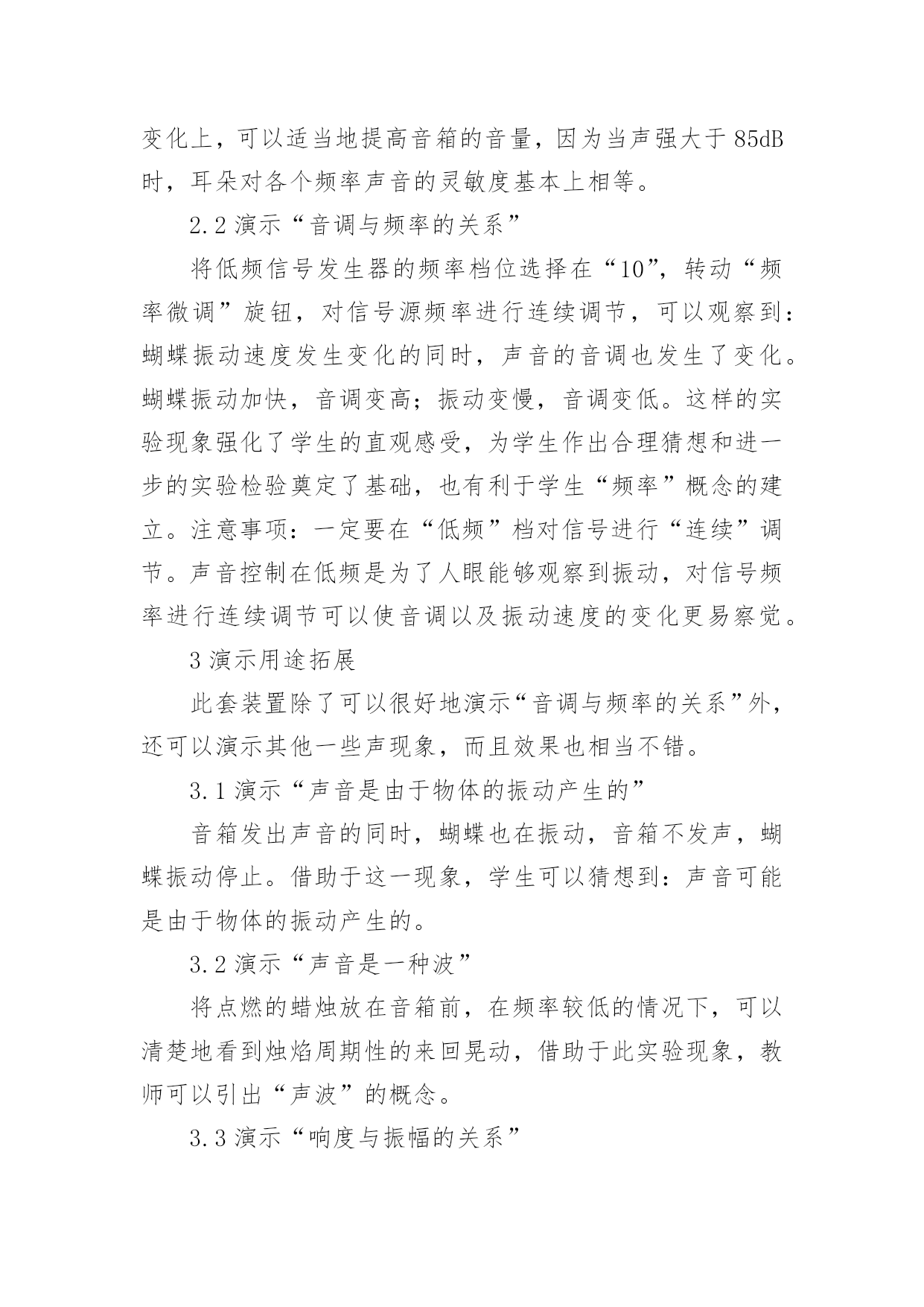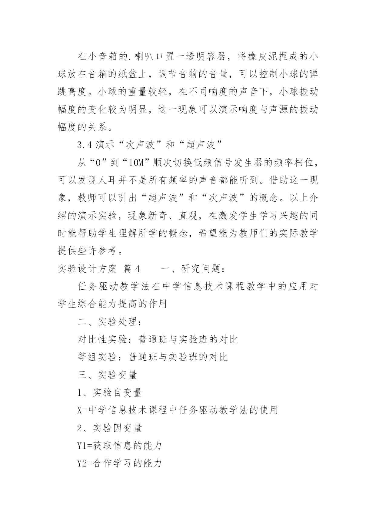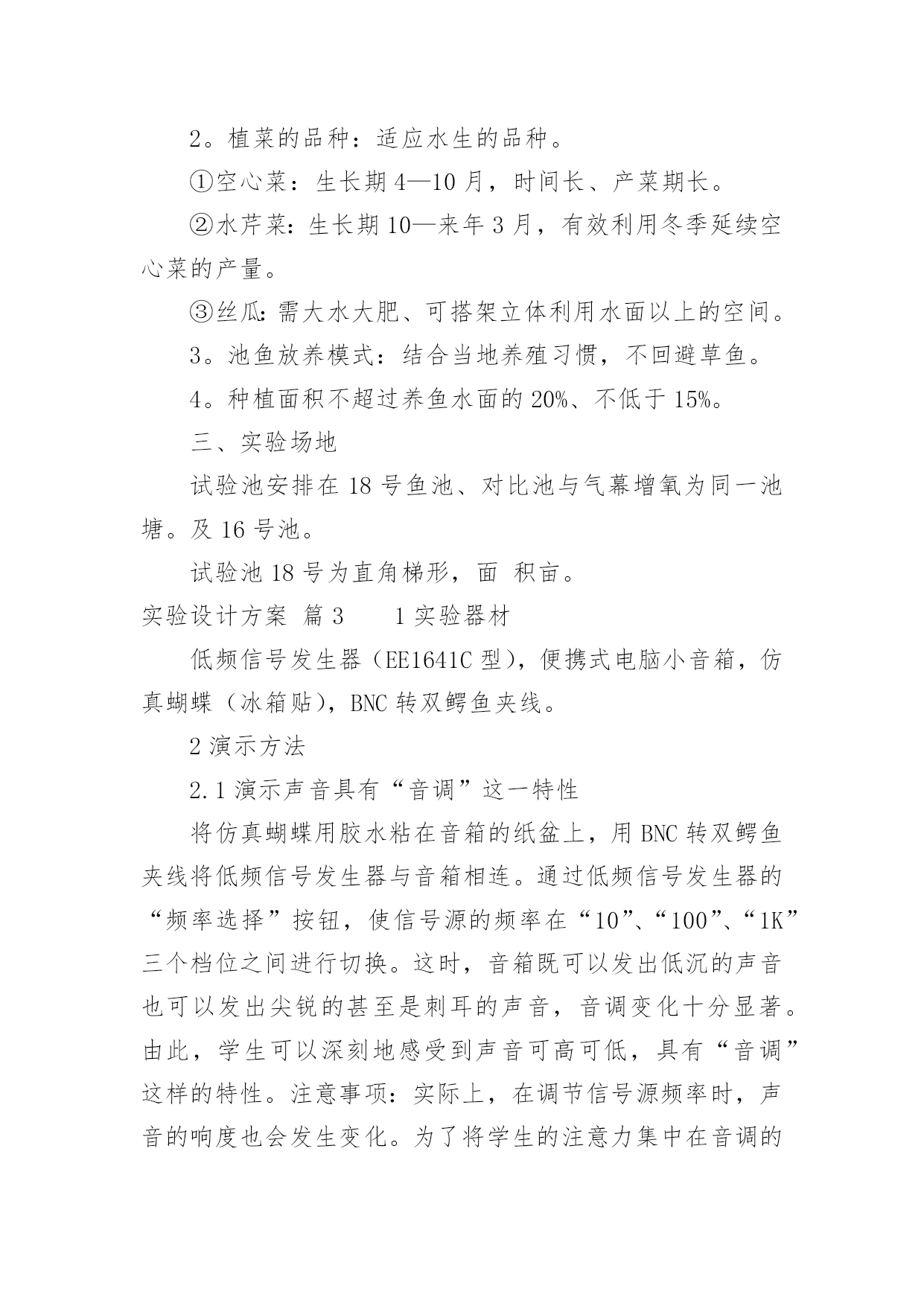 实验设计方案实验设计方案集锦8篇为了保障事情或工作顺利、圆满进行,时常需要预先制定一份周密的方案,方案是有很强可操作性的书面计划。那么制定方案需要注意哪些问题呢?下面是小编收集整理的实验设计方案8篇,仅供参考,希望能够帮助到大家。实验设计方案篇11实验器材低频信号发生器(EE1641C型),便携式电脑小音箱,仿真蝴蝶(冰箱贴),BNC转双鳄鱼夹线。2演示方法2.1演示声音具有“音调”这一特性将仿真蝴蝶用胶水粘在音箱的纸盆上,用BNC转双鳄鱼夹线将低频信号发生器与音箱相连。通过低频信号发生器的“频率选择”按