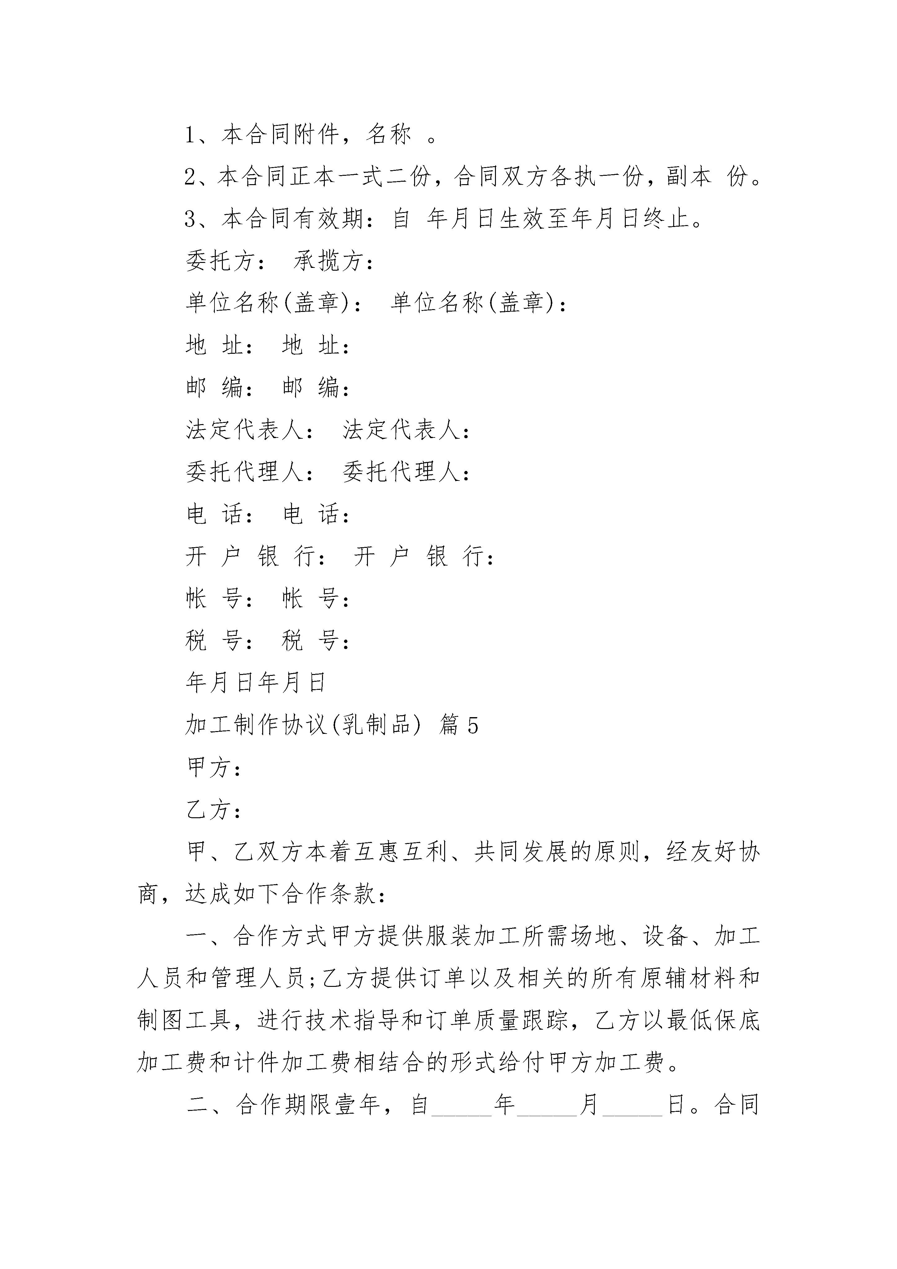 加工制作协议(乳制品)加工制作协议(乳制品)(精选19篇)加工制作协议(乳制品)篇1订货方:____________(以下简称甲方)销售方:_________________(以下简称乙方)根据国家有关法律法规,经双方协商一致,就甲方订购加油站储油罐签订本销售合同,以资双方共同遵守:一、交易内容及价款二、产品生产标准和质量要求1、储油罐生产执行国家行业标准《钢制焊接常压容器》的有关规定要求。2、所有油罐应设置单人孔,且人孔内径不应小于______mm,且封头厚度不应小于______mm,油罐壁板厚度为