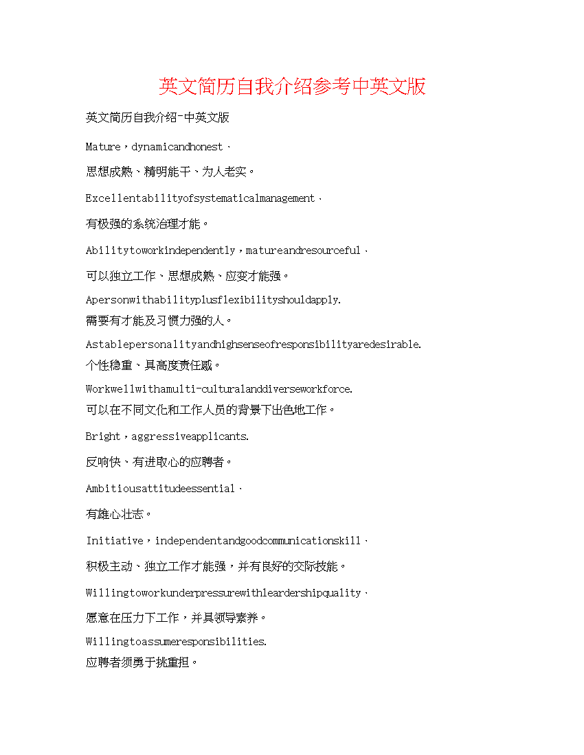 英文简历自我介绍-中英文版英文简历自我介绍-中英文版英文简历自我介绍-中英文版Mature,dynamicandhonest.思想成熟、精明能干、为人诚实。Excellentabilityofsystematicalmanagement.有极强的系统管理能力。Abilitytoworkindependent1y,matureandresourcefu1.能够独立工作、思想成熟、应变能力强。Apersonwithabilityplusflexibilityshouldapp1y.需要有能力及适应力强的人。A