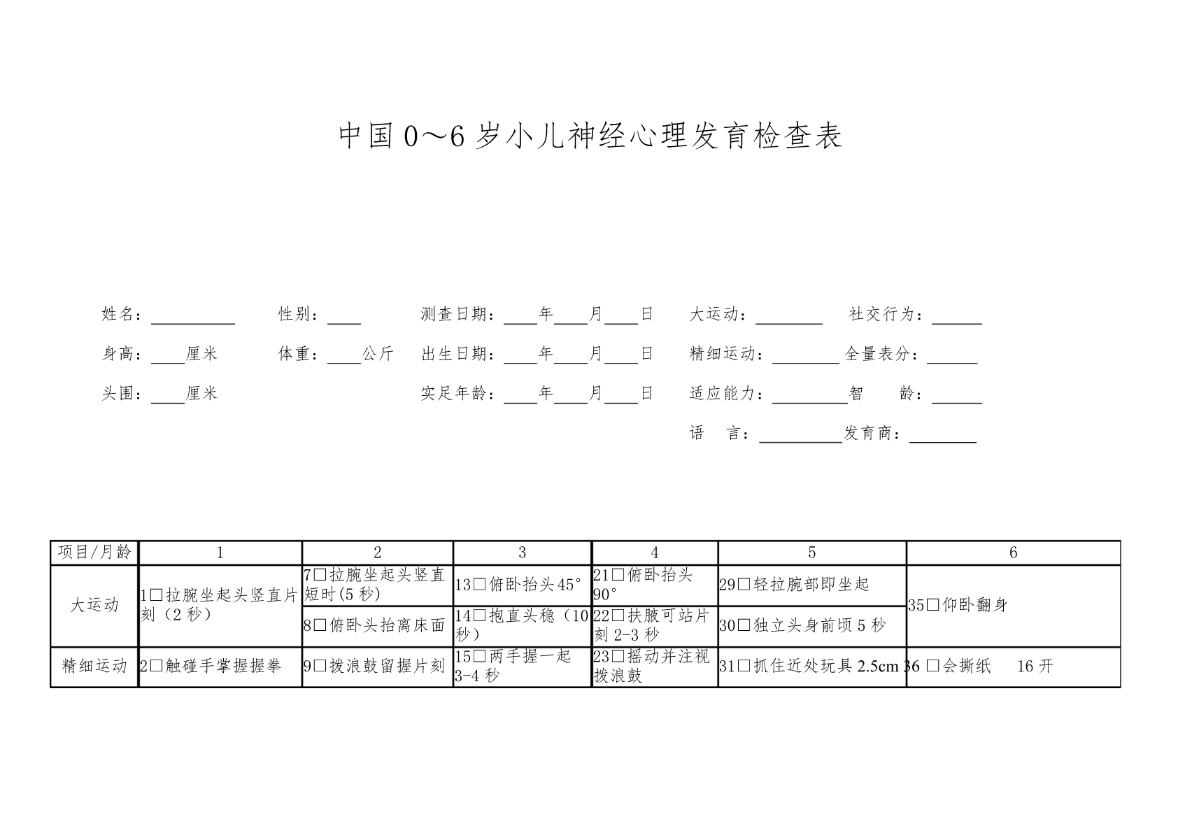 中国0~6岁小儿神经心理发育检查表姓名:性别:测查日期:年月日大运动:社交行为:身高:厘米体重:公斤出生日期:年月日精细运动:全量表分:头围:厘米实足年龄:年月日适应能力:智龄:语言:发育商:项目/月龄123456大运动1□拉腕坐起头竖直片刻(2秒)7□拉腕坐起头竖直短时(5秒)13□俯卧抬头45°21□俯卧抬头90°29□轻拉腕部即坐起35□仰卧翻身8□俯卧头抬离床面14□抱直头稳(10秒)22□扶腋可站片刻2-3秒30□独立头身前顷5秒精细运动2□触碰手掌握握拳9□拨浪鼓留握片刻15□两手握一起3