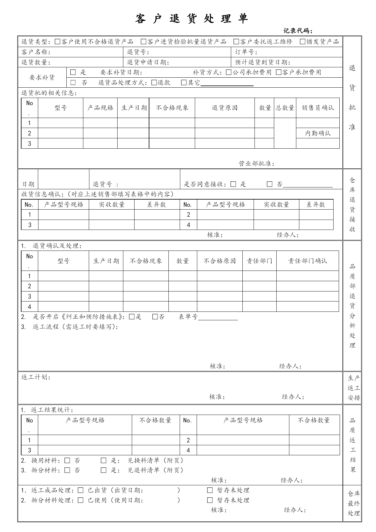 客户退货处理单记录代码:退货类型:□客户使用不合格退货产品□客户进货检验批量退货产品□客户委托返工维修□错发货产品退货批准客户名称:退货号:订单号:退货数量:退货申请日期:预计退货到货日期:要求补货□是要求补货日期:补货方式:□公司承担费用□客户承担费用否退货品处理方式:□退款□其它退货批的相关信息:No.型号产品规格生产日期不合格现象退货原因数量总数量销售员确认12内勤确认3营业部批准:来日期R退货号:S是否同意接收:□是□否仓库退货接收收货信息确认:(对应上述销售部填写表格中的内容)No.产品型号规格