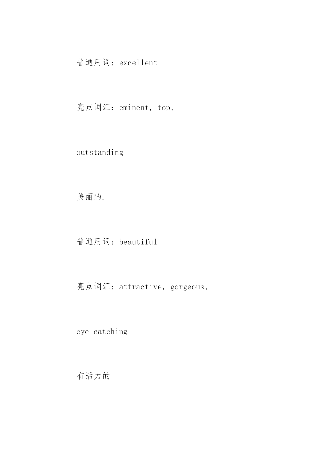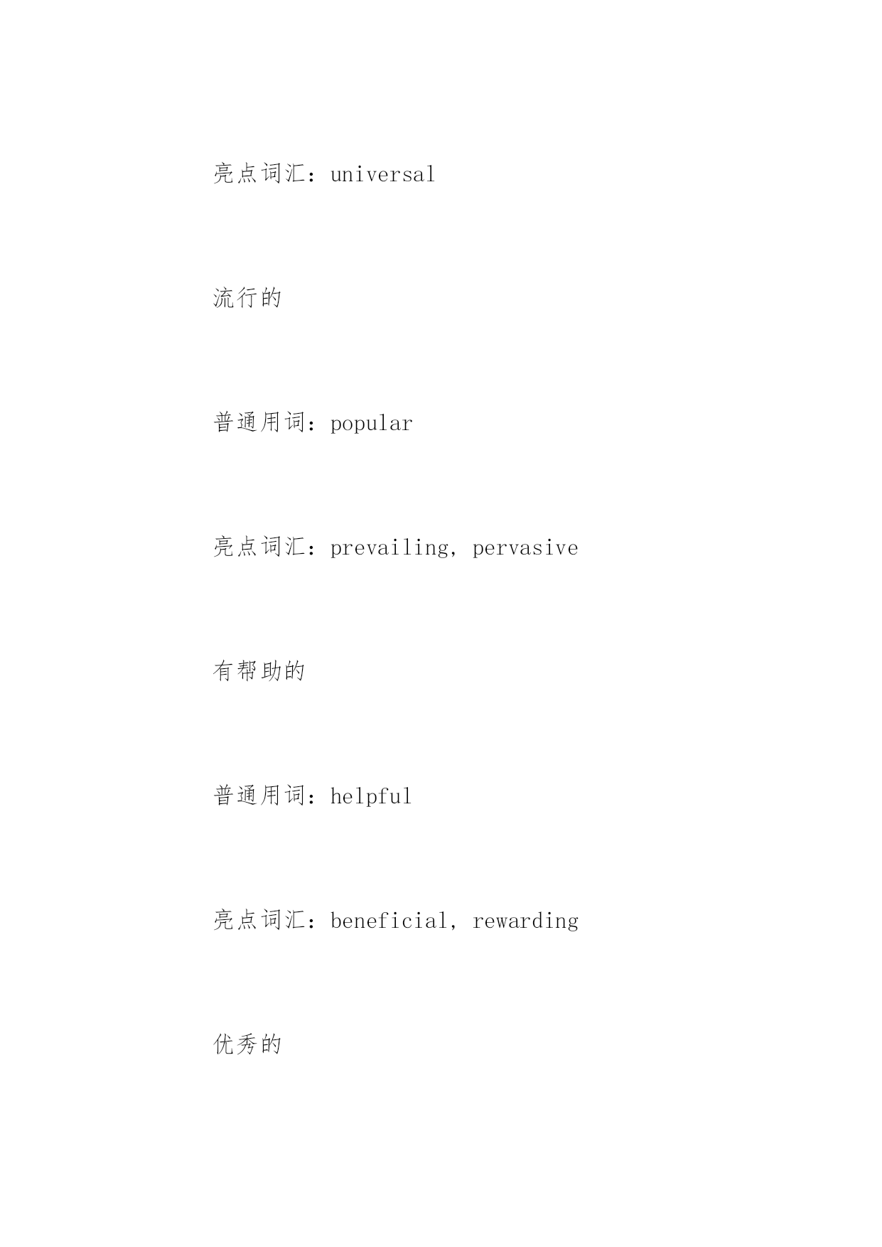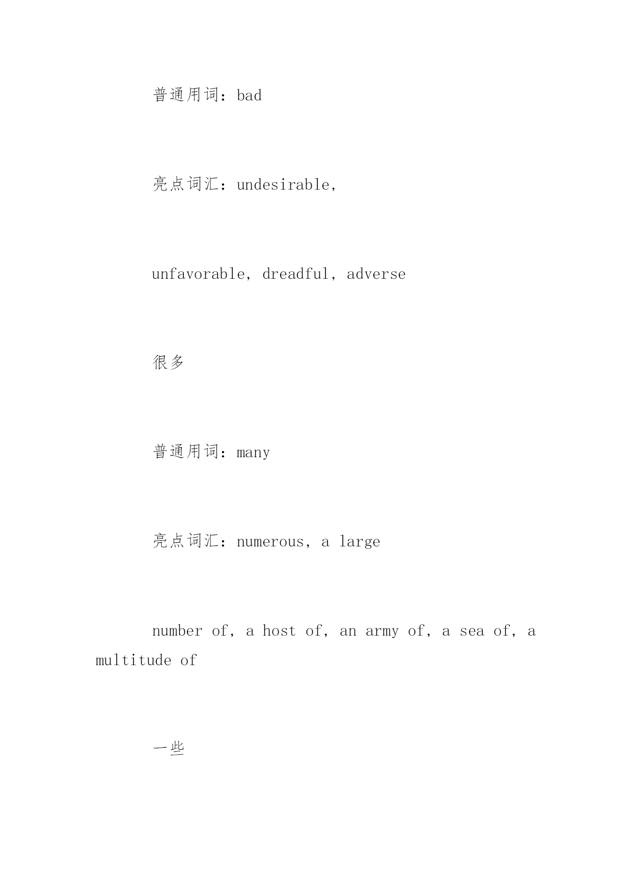 英语四六级写作高分亮点词汇英语四六级写作高分必备【亮点词汇】在写作时有什么方法可以让我们的文章变得更具吸引力呢?我们可以把一些常见的普通用词替换成亮点词汇,以使文章更加出彩,这样有助于在大学英语四六级考试中获得写作高分,英语四六级写作高分必备【亮点词汇】。普通用词:good亮点词汇:desirable,beneficial,advantageous,favorable,rosy,promising,superior坏的普通用词:bad亮点词汇:undesirable,unfavorable,dreadfu