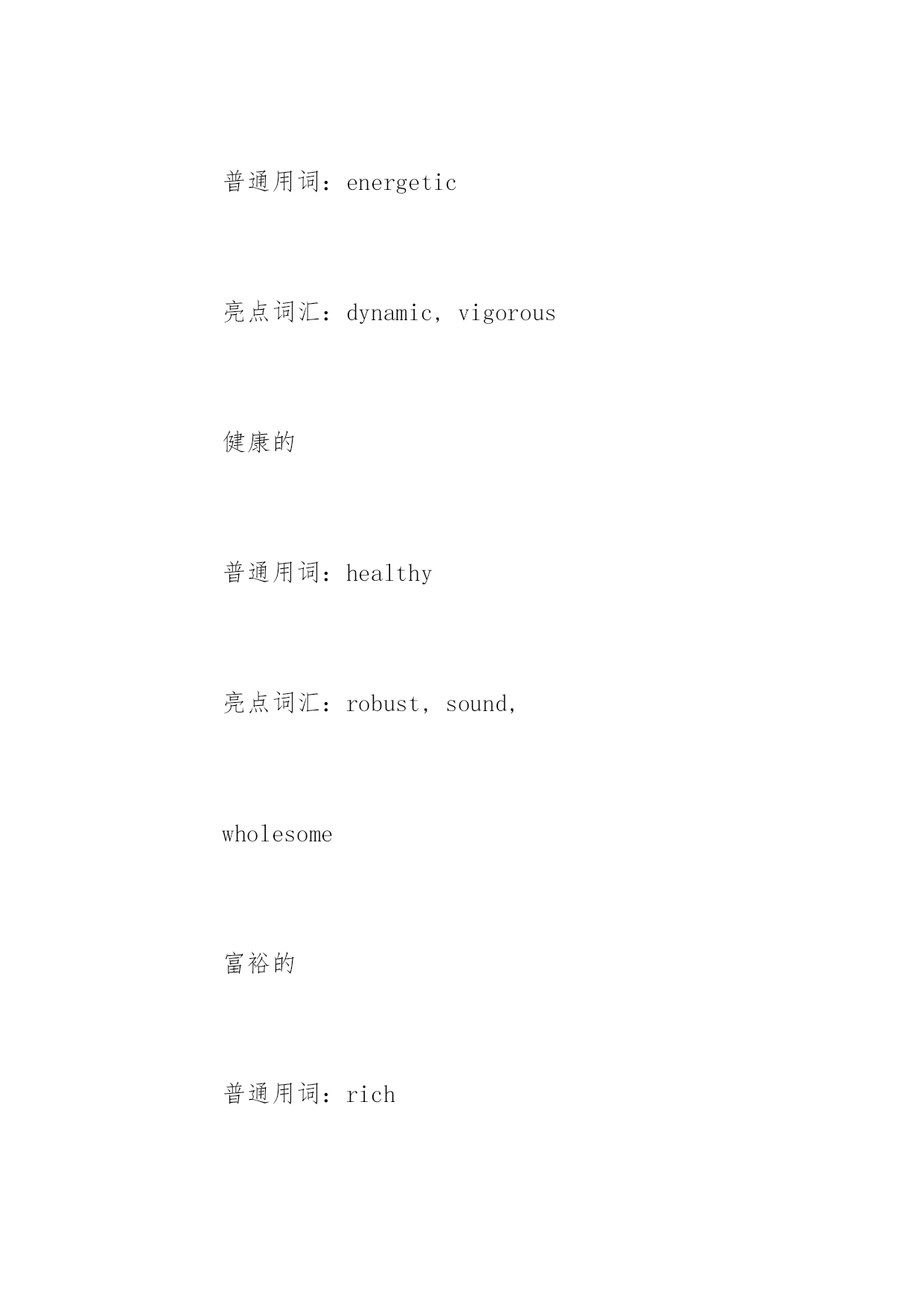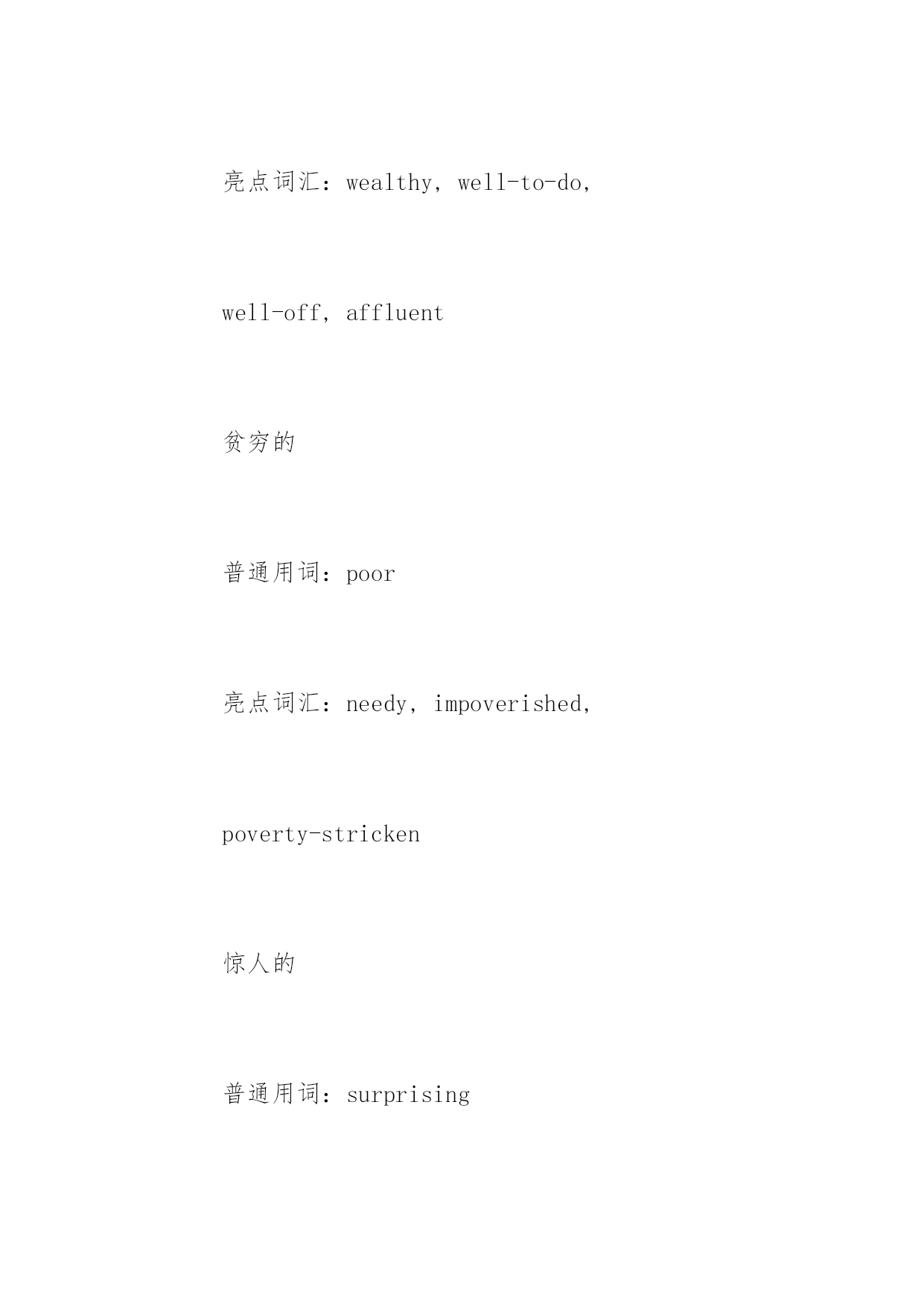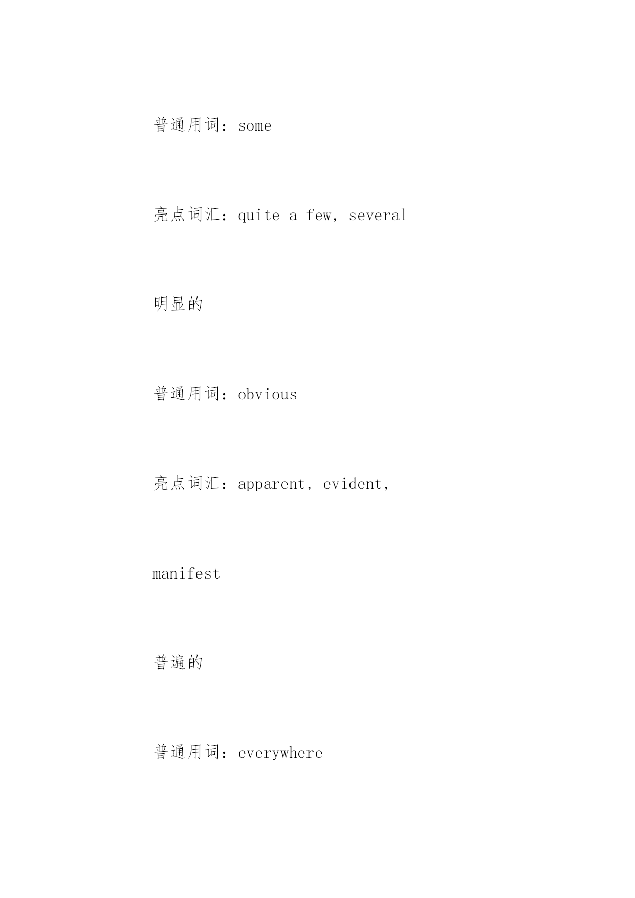 英语四六级写作高分亮点词汇英语四六级写作高分必备【亮点词汇】在写作时有什么方法可以让我们的文章变得更具吸引力呢?我们可以把一些常见的普通用词替换成亮点词汇,以使文章更加出彩,这样有助于在大学英语四六级考试中获得写作高分,英语四六级写作高分必备【亮点词汇】。普通用词:good亮点词汇:desirable,beneficial,advantageous,favorable,rosy,promising,superior坏的普通用词:bad亮点词汇:undesirable,unfavorable,dreadfu