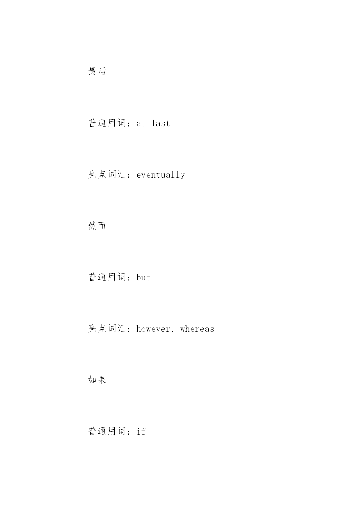 英语写作高分必背亮点词汇英语写作高分必背亮点词汇1认为,主张thinkargue,maintain,hold,2赢得,取得winearn,gain,reap3重要的、决定性的importantvital,crucial,critical,decisive4考虑considertakesth.intoconsideration,reflecton,meditateon,ponderover5下结论inaworddrawtheconclusion,arriveattheconclusion,comeintoc