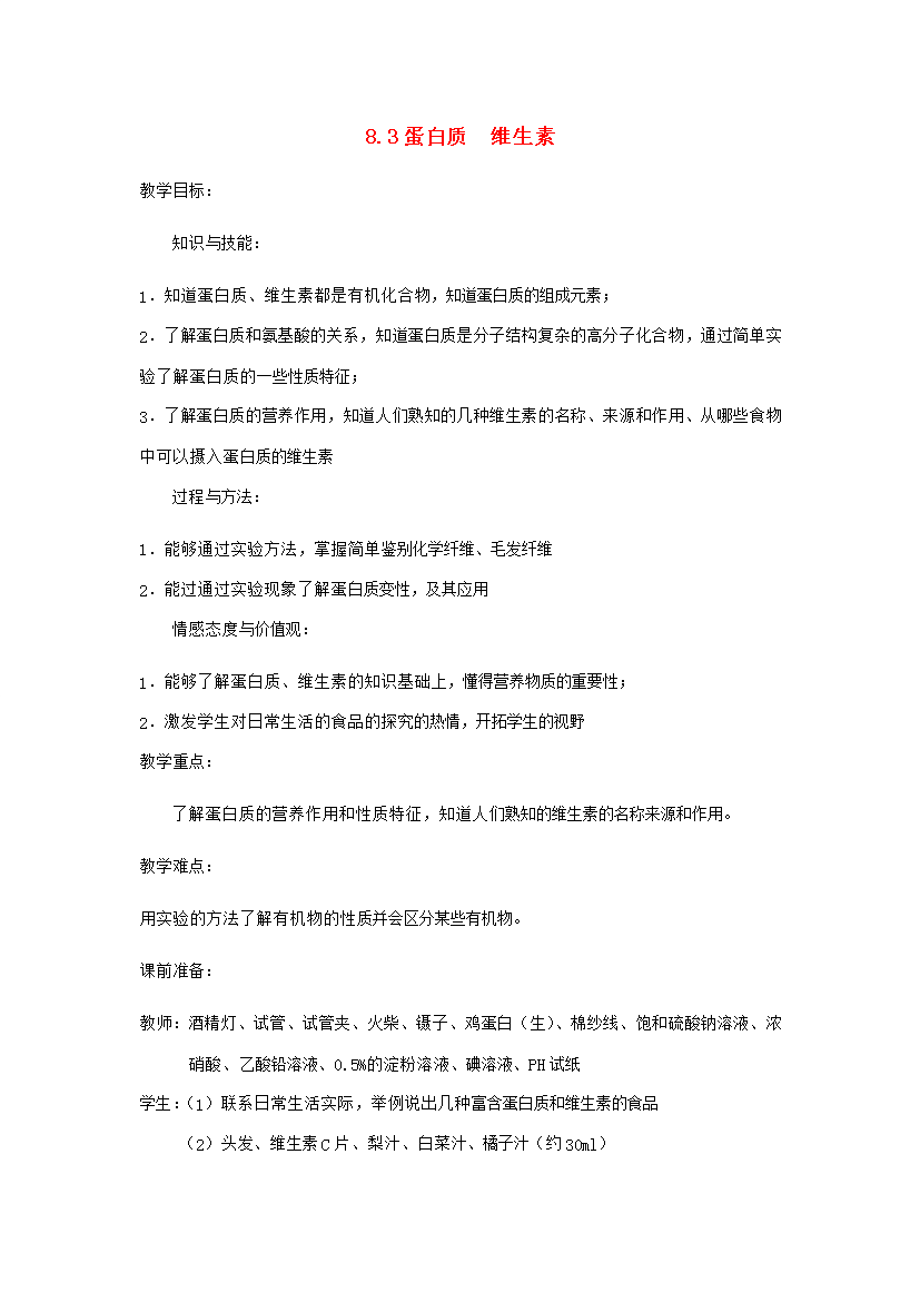 8.3蛋白质维生素教学目标:知识与技能:1.知道蛋白质、维生素都是有机化合物知道蛋白质的组成元素;2.了解蛋白质和氨基酸的关系知道蛋白质是分子结构复杂的高分子化合物通过简单实验了解蛋白质的一些性质特征;3.了解蛋白质的营养作用知道人们熟知的几种维生素的名称、来源和作用、从哪些食物中可以摄入蛋白质的维生素过程与方法:1.能够通过实验方法掌握简单鉴别化学纤维、毛发纤维2.能过通过实验现象了解蛋白质变性及其应用情感态度与价值观:1.能够了解蛋白质、维生素的知识基础上懂得营养物质的重要性;2.激发学生