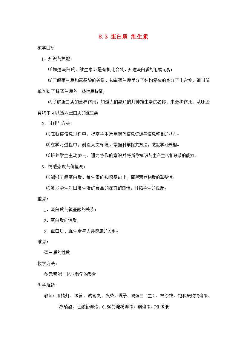 8.3蛋白质维生素教学目标1.知识与技能:⑴知道蛋白质、维生素都是有机化合物,知道蛋白质的组成元素;⑵了解蛋白质和氨基酸的关系,知道蛋白质是分子结构复杂的高分子化合物,通过简单实验了解蛋白质的一些性质特征;⑶了解蛋白质的营养作用,知道人们熟知的几种维生素的名称、来源和作用、从哪些食物中可以摄入蛋白质的维生素2.过程与方法:⑴在收集信息过程中,提高学生运用现代信息资源与信息整合的能力。⑵在学习过程中,创设人文环境,掌握科学探究方法,激发学习兴趣。⑶培养学生主动参与、通力协作的意识并将所学知识与生产生活相联系