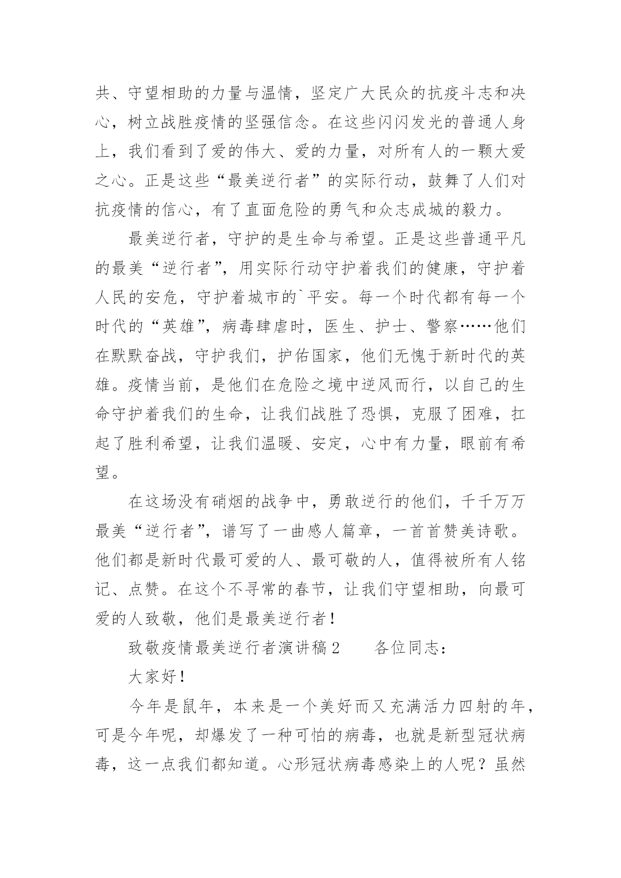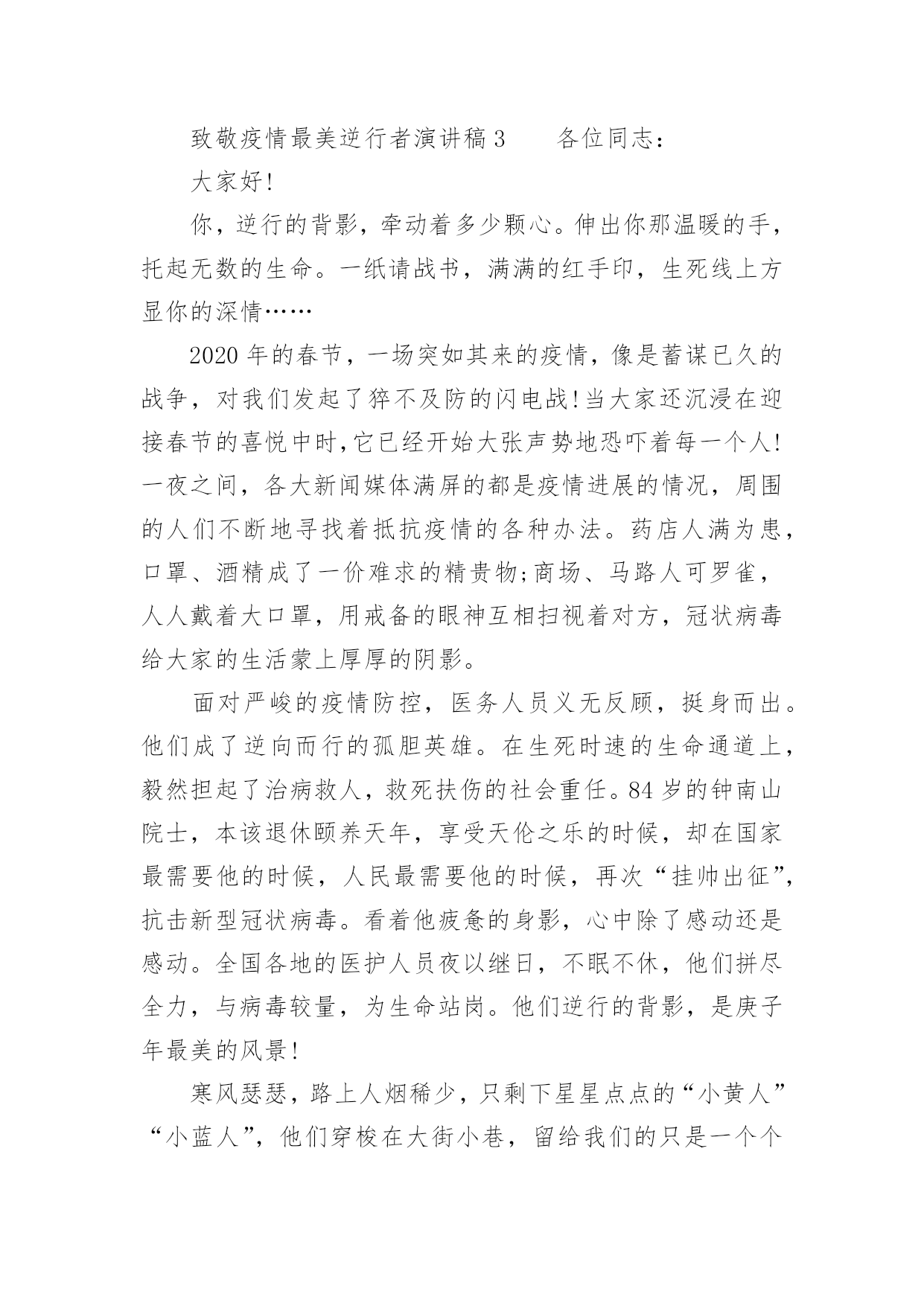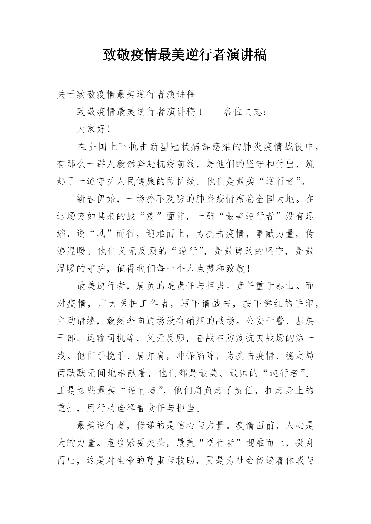 致敬疫情最美逆行者演讲稿致敬疫情最美逆行者演讲稿范文致敬疫情最美逆行者演讲稿1各位同志:大家好!在全国上下抗击新型冠状病毒感染的肺炎疫情战役中,有那么一群人毅然奔赴抗疫前线,是他们的坚守和付出,筑起了一道守护人民健康的防护线。他们是最美“逆行者”。新春伊始,一场猝不及防的肺炎疫情席卷全国大地。在这场突如其来的战“疫”面前,一群“最美逆行者”没有退缩,逆“风”而行,迎难而上,为抗击疫情,奉献力量,传递温暖。他们义无反顾的“逆行”,是最勇敢的坚守,是最温暖的守护,值得我们每一个人点赞和致敬!最美逆行者,肩负的
