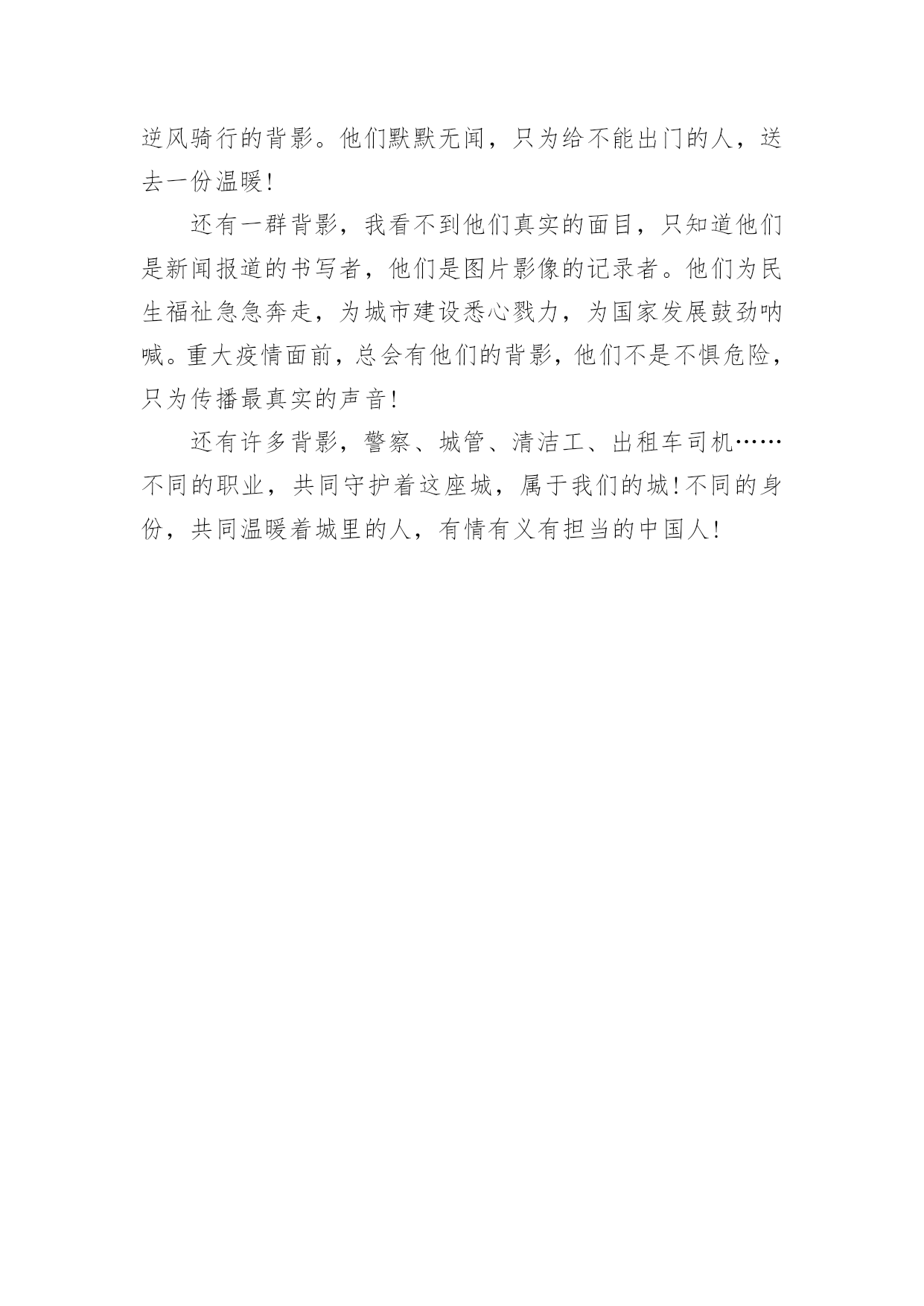 致敬疫情最美逆行者的演讲稿大家好!在全国上下抗击新型冠状病毒感染的肺炎疫情战役中,有那么一群人毅然奔赴抗疫前线,是他们的坚守和付出,筑起了一道守护人民健康的防护线。他们是最美“逆行者”。新春伊始,一场猝不及防的肺炎疫情席卷全国大地。在这场突如其来的战“疫”面前,一群“最美逆行者”没有退缩,逆“风”而行,迎难而上,为抗击疫情,奉献力量,传递温暖。他们义无反顾的“逆行”,是最勇敢的坚守,是最温暖的守护,值得我们每一个人点赞和致敬!最美逆行者,肩负的是责任与担当。责任重于泰山。面对疫情,广大医护工作者,写下请战