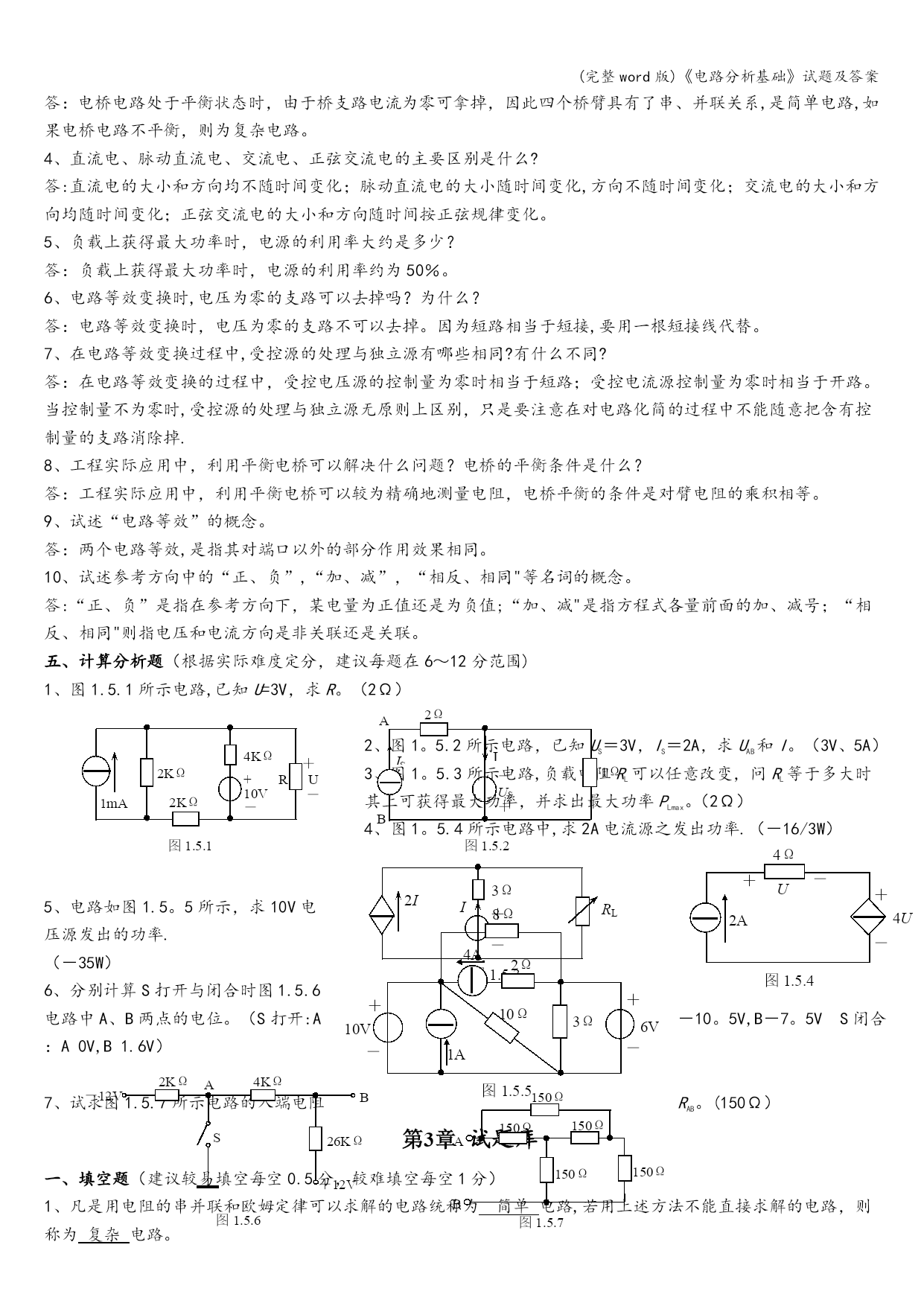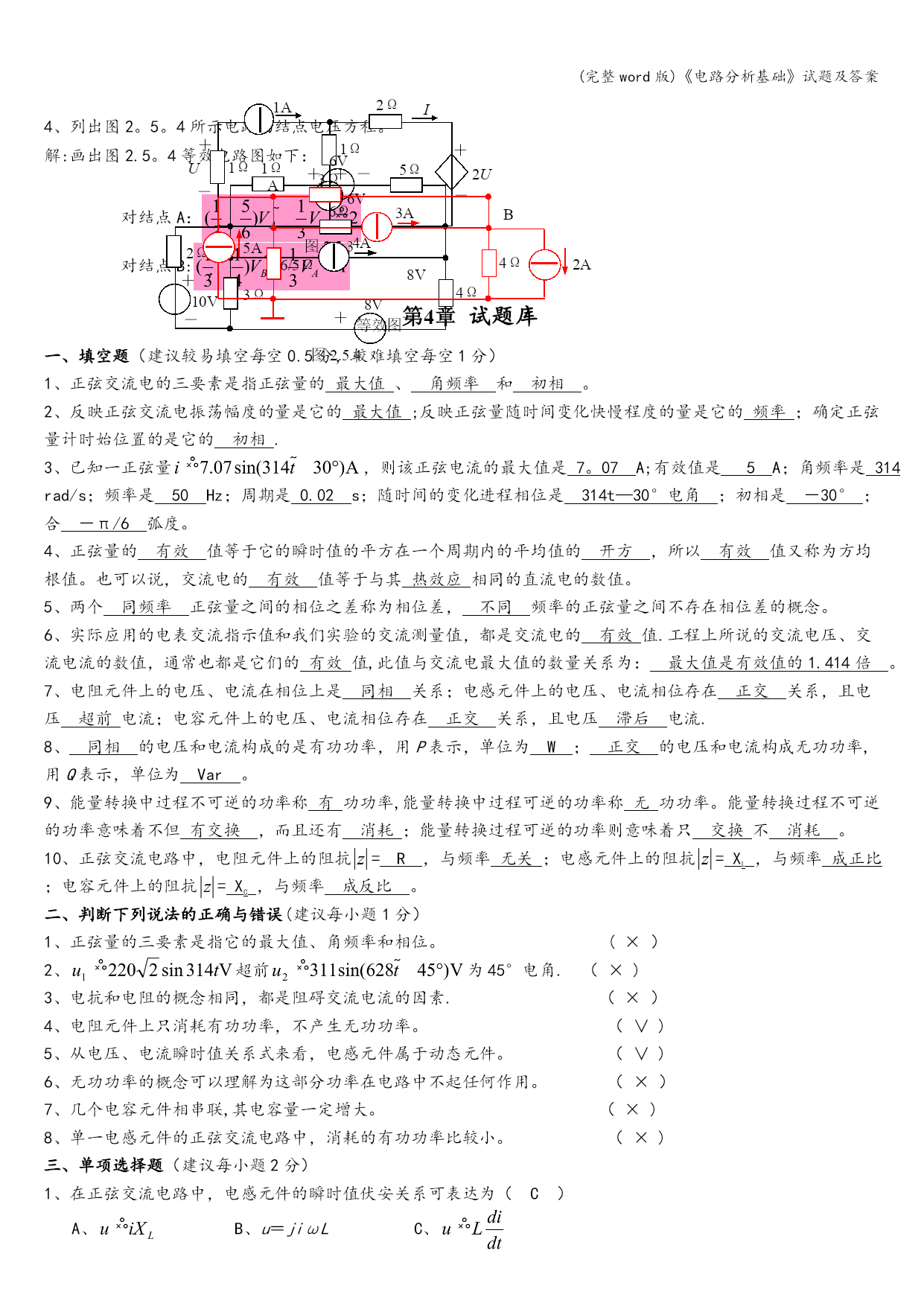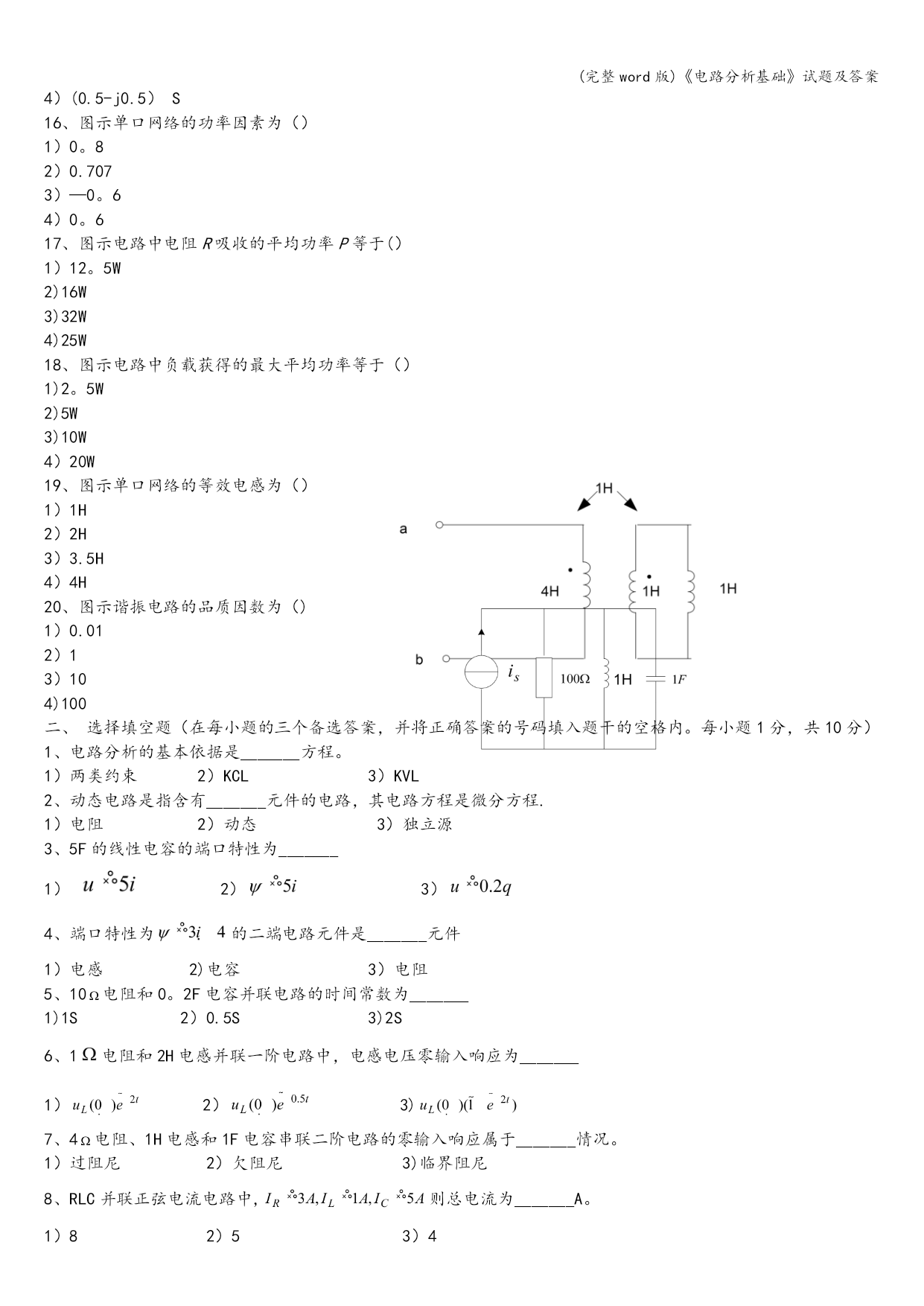 (完整word版)《电路分析基础》试题及答案(完整word版)《电路分析基础》试题及答案(完整word版)《电路分析基础》试题及答案试题库“电路分析基础”试题(120分钟)—III单项选择题(在每个小题的四个备选答案中,选出一个正确答案,并将正确答案的号码填入提干的括号内。每小题2分,共40分)图示电路中电流等于(2)1)1A2)2A3)3A4)4A2、图示单口网络的短路电流等于(1)1)1A2)1。5A3)3A4)—1A3、图示电路中电压等于(2)1)4V2)-4V3)6V4)-6V4、图示单口网络的开路电压等于(1)1)3V2)4V3)5V4)9V5、图示电路中电阻R吸收的功率P等于(3)1)3W2)4W3)9W4)12W6、图示电路中负载电阻吸收的最大功率等于(3)1)0W2)6W3)3W4)12W7、图示单口网络的等效电阻等于(4)1)2Ω2)4Ω3)6Ω4)-2Ω8、图示电路中开关断开时的电容电压等于()1)2V2)3V3)4V4)0V9、图示电路开关闭合后的电压等于()1)2V2)4V3)6V4)8V10、图示电路在开关断开后电路的时间常数等于()1)2S2)3S3)4S4)7S11、图示电路的开关闭合后,电感电流等于()1)A2)A3)A4)A12、图示正弦电流电路中电压的振幅等于()1)1V2)4V3)10V4)20V13、图示正弦电流电路中电压的初相等于()1)2)3)4)14、图示单口网络相量模型的等效阻抗等于()1)(3+j4)2)(0.33-j0。25)3)(1。92+j1。44)4)(0。12+j0.16)15、图示单口网络相量模型的等效导纳等于()1)(0.5+j0.5)S2)(1+j1)S3)(1-j1)S4)(0.5-j0.5)S16、图示单口网络的功率因素为()1)0。82)0.7073)—0。64)0。617、图示电路中电阻R吸收的平均功率P等于()1)12。5W2)16W3)32W4)25W18、图示电路中负载获得的最大平均功率等于()1)2。5W2)5W3)10W4)20W19、图示单口网络的等效电感为()1)1H2)2H3)3.5H4)4H20、图示谐振电路的品质因数为()1)0.012)13)104)100二、选择填空题(在每小题的三个备选答案,并将正确答案的号码填入题干的空格内。每小题1分,共10分)1、电路分析的基本依据是_______方程。1)两类约束2)KCL3)KVL2、动态电路是指含有_______元件的电路,其电路方程是微分方程.1)电阻2)动态3)独立源3、5F的线性电容的端口特性为_______1)2)3)4、端口特性为的二端电路元件是_______元件1)电感2)电容3)电阻5、10电阻和0。2F电容并联电路的时间常数为_______1)1S2)0.5S3)2S6、1电阻和2H电感并联一阶电路中,电感电压零输入响应为_______1)2)3)7、4电阻、1H电感和1F电容串联二阶电路的零输入响应属于_______情况。1)过阻尼2)欠阻尼3)临界阻尼8、RLC并联正弦电流电路中,则总电流为_______A。1)82)53)49、的耦合电感在次级开路时,初级的等效电感为_______H.1)102)123)1610、电流源A与电阻并联单口网络向外传输的最大平均功率为_______W。1)42)83)16三、简答题(每小题6分,共30分)1、计算图示电路中的电流和电压。2、计算图示电路的电压和3、计算图示电路中负载电阻获得的最大功率。4、图示电路原已稳定,闭合开关,求的电容电压5、图示电路中电流求稳态电流.四、计算题1、用网孔分析法计算图示电路中的网孔电流和。2、图示正弦电流电路中,已知V,求电流和。电路分析基础试题参考答案—III单项选择题(每小题2分,共40分)1。(2);2。(1);3.(2);4.(1);5。(3);6.(3);7.(1);8.(2);9.(4);10.(2);11.(3);12。(4);13。(1);14.(3);15。(4);16。(4);17。(2);18.(1);19。(3);20.(4)二、单项选择题(每小题1分,共10分)1。(1)2.(2)3.(3)4。(1)5.(3)6。(2)7。(1)8。(2)9.(1)10.(3)三、简答题(每小题6分,共30分)1、由网孔方程求得2、由叠加定理求得。3、4、5、,四、计算题(每小题10分,共20分)1、2、试题库一、填空题(建议较易填空每空0。5分,较难填空每空1分)1、电流所经过的路径叫做电路,通常由电源、负载和中间环节三部分组成.2、实际电路按功能可分为电力系统的电路和电子技术的电路两大类,其中电力系统的电路其主要功能是对发电厂发出的电能进行传输、分配和转换;电子技术的电路主要功能则是