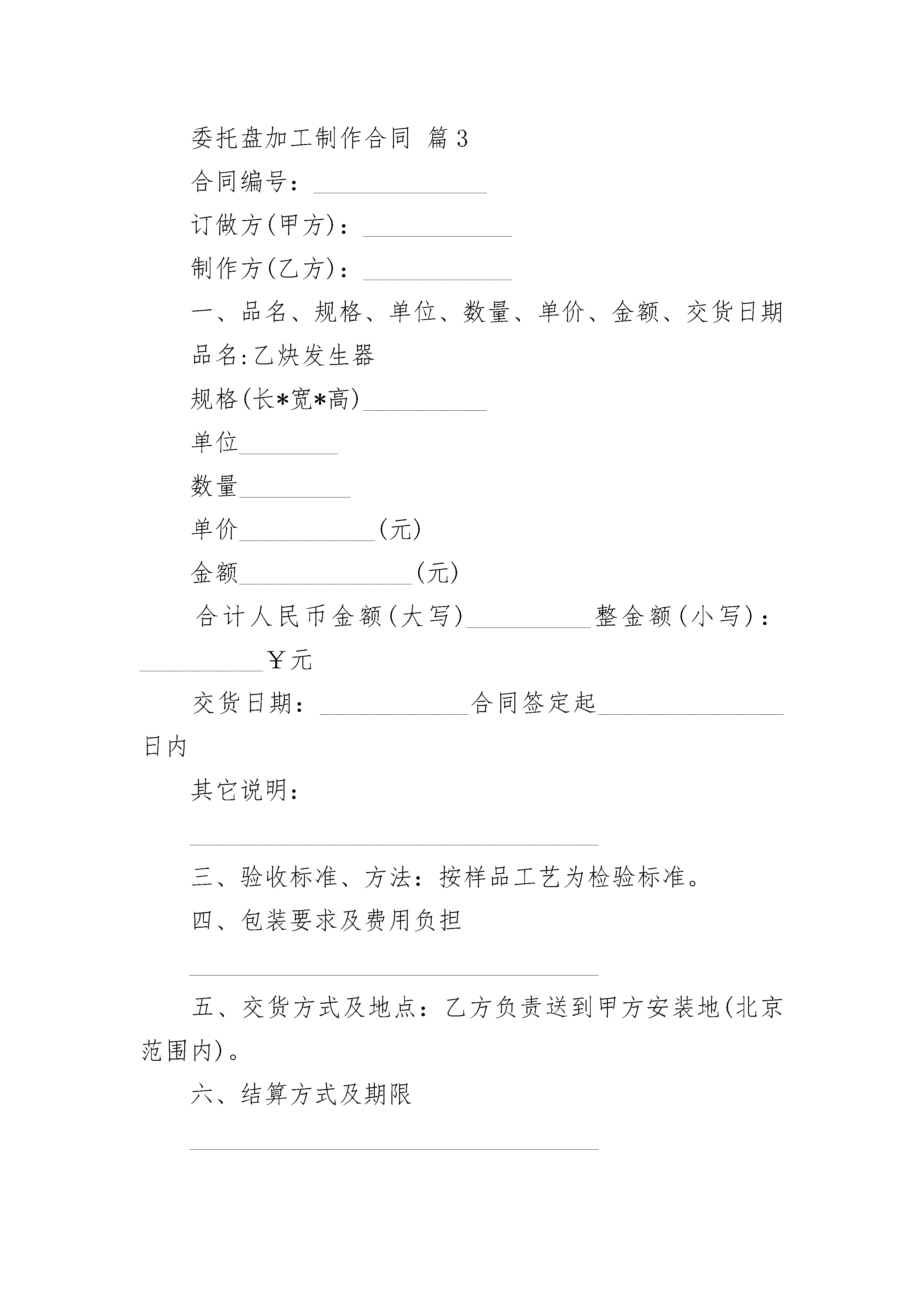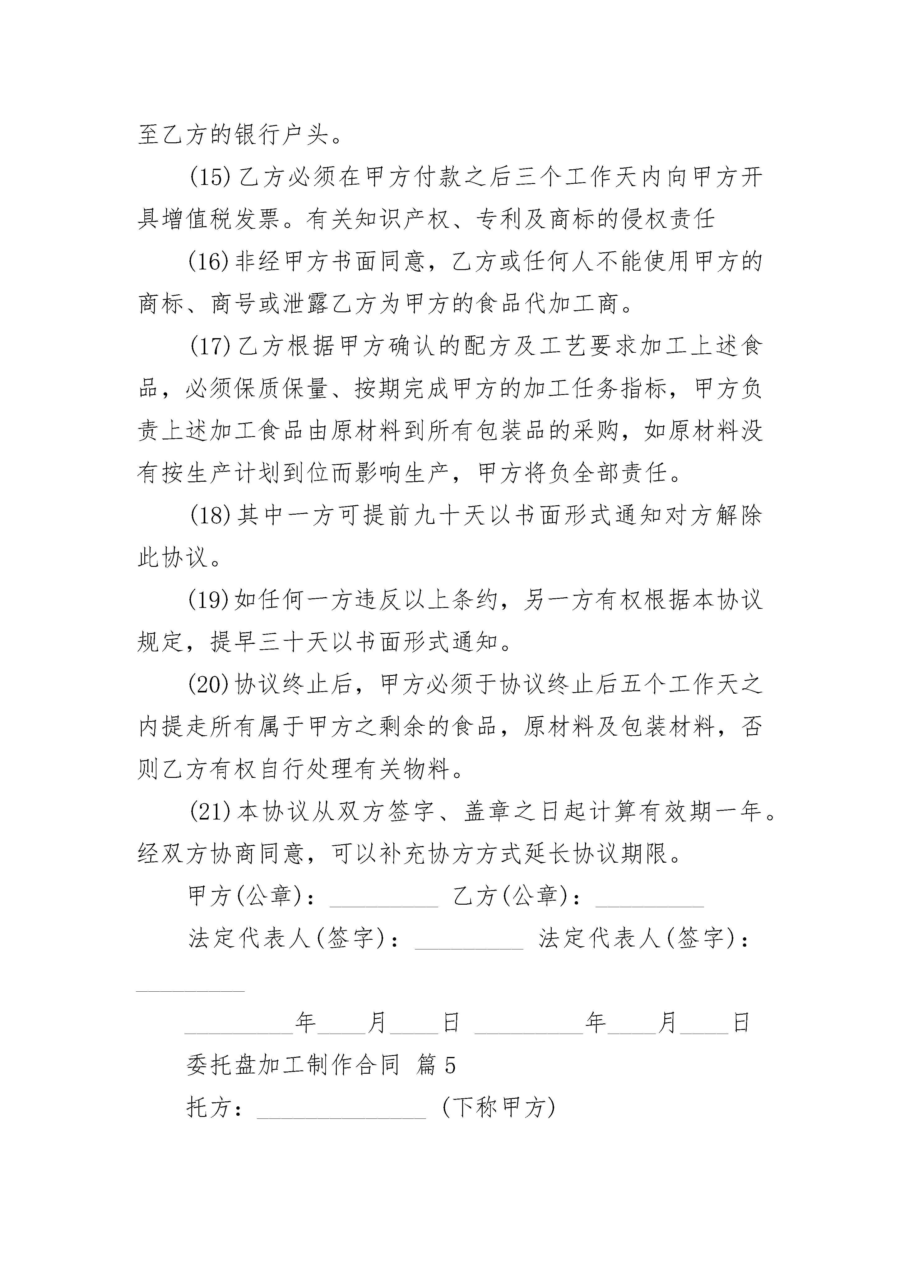 委托盘加工制作合同委托盘加工制作合同(通用20篇)委托盘加工制作合同篇1甲方:以下简称甲方)乙方:以下简称乙方)甲方委托乙方设计制作。遵照平等互利的原则,经友好协商,双方达成协议如下:一、设计及规格要求:1、乙方根据甲方提出的设计要求进行样品设计。2、盘外观为金属外壳折叠式。3、容量为16。二、版权保护声明文字、相关标识等基础素材由甲方提供,乙方不承担相关版权及校对责任,如存在版权争议由甲方负责解释和处理解决。本协议完全履行后,设计方案的版权归甲方所有,甲方拥有最终处理权。乙方不得另行使用。三、产品具