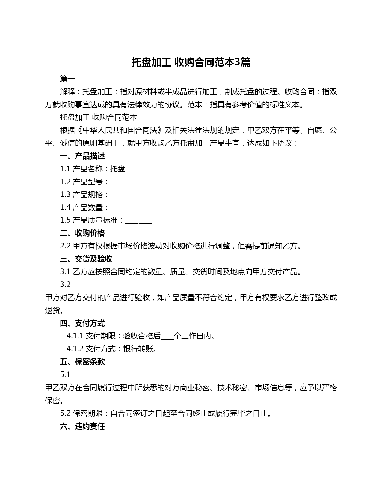 托盘加工收购合同范本3篇篇一解释:托盘加工:指对原材料或半成品进行加工,制成托盘的过程。收购合同:指双方就收购事宜达成的具有法律效力的协议。范本:指具有参考价值的标准文本。托盘加工收购合同范本根据《中华人民共和国合同法》及相关法律法规的规定,甲乙双方在平等、自愿、公平、诚信的原则基础上,就甲方收购乙方托盘加工产品事宜,达成如下协议:一、产品描述1.1产品名称:托盘1.2产品型号:________1.3产品规格:________1.4产品数量:________1.5产品质量标准:________二、收购价格